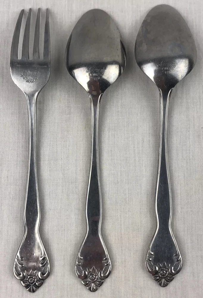 Vintage Normandy Stainless Flatware 3 Piece Lot Includes: 1 Dinner Fork 2 Oval Place Spoons Shows signs of light use and may need additional cleaning. Little spotting in places but no dishwasher or disposal damage. Overall very nice condition. Please see pictures for details as this is part of my description.
