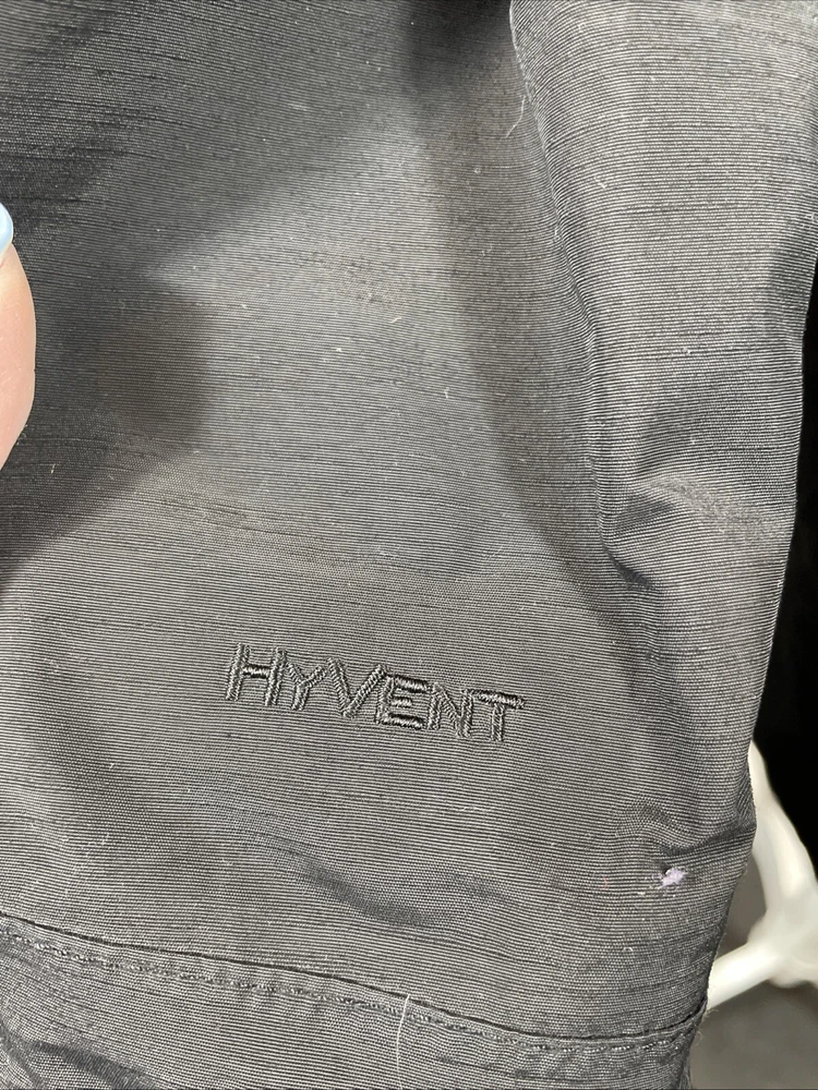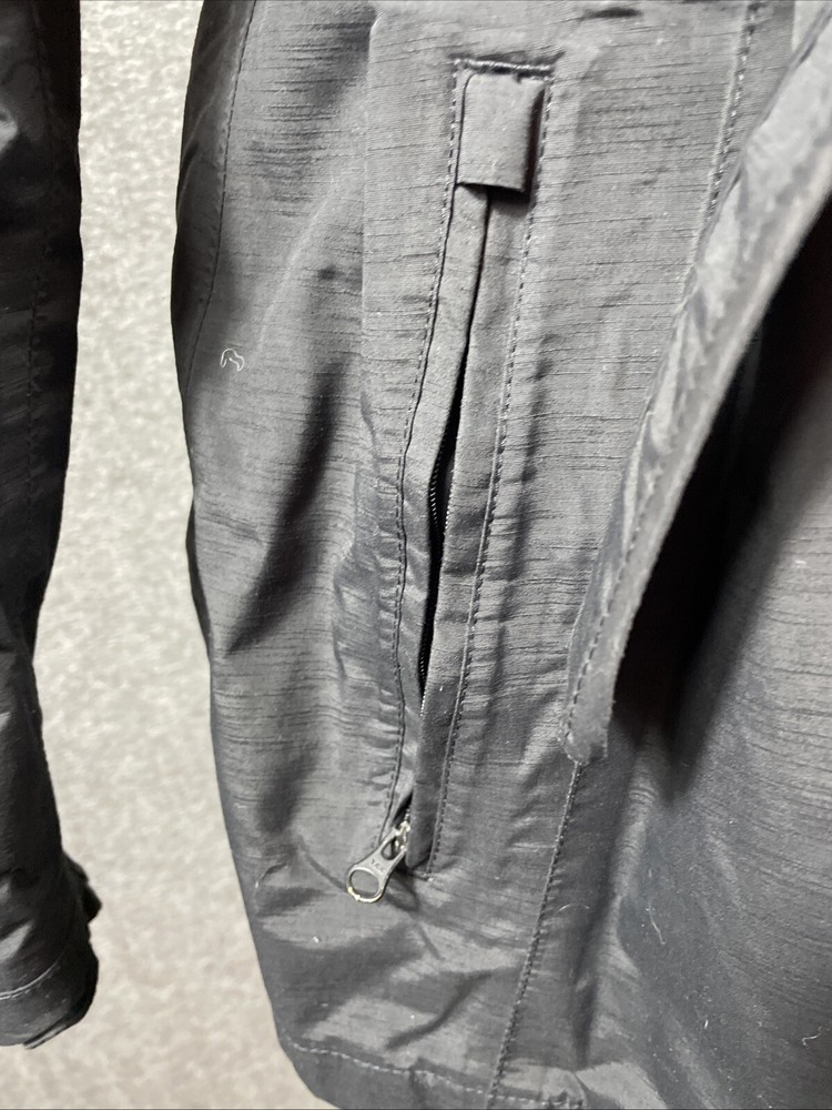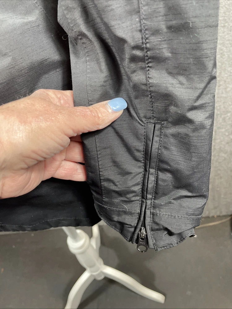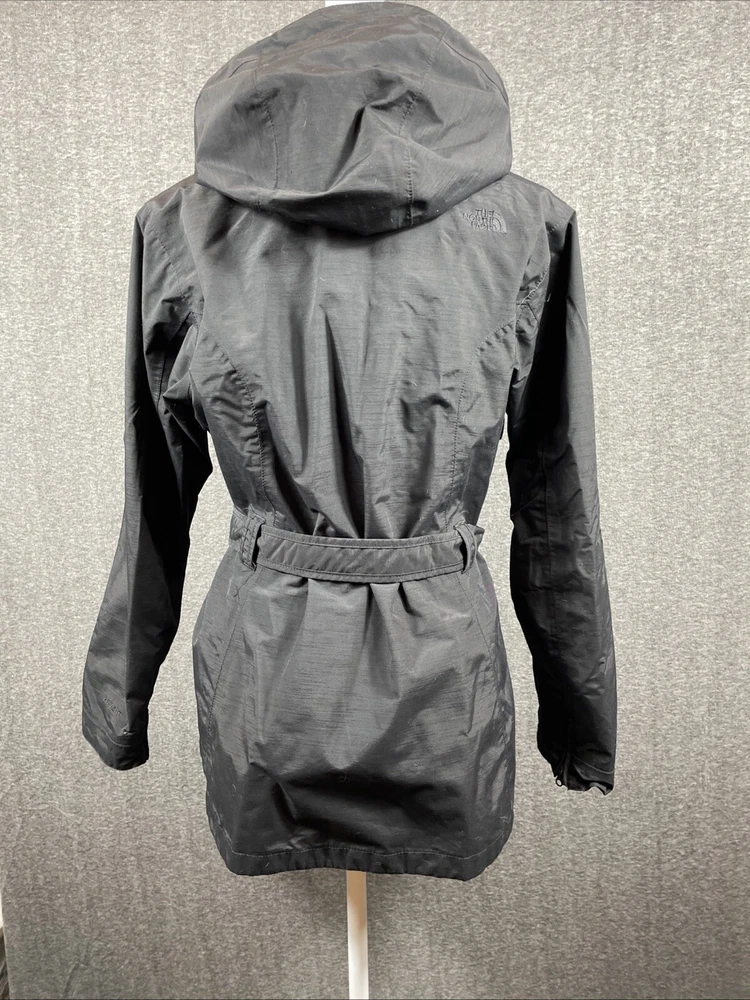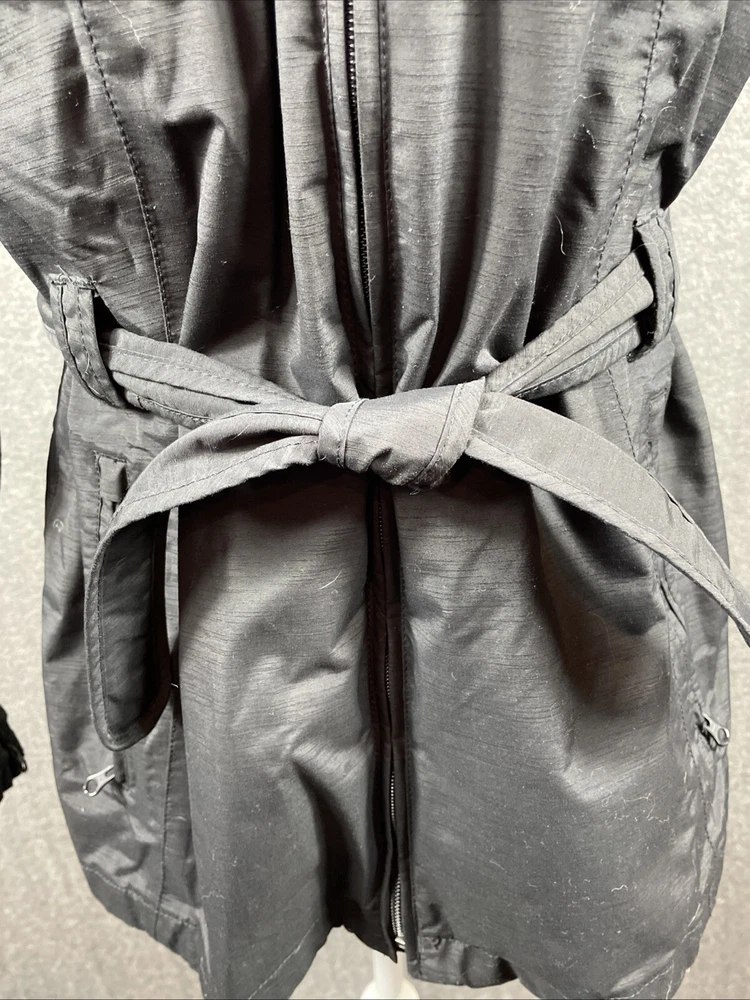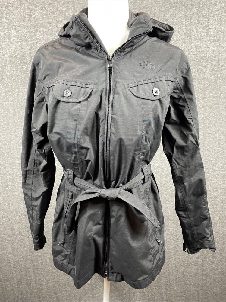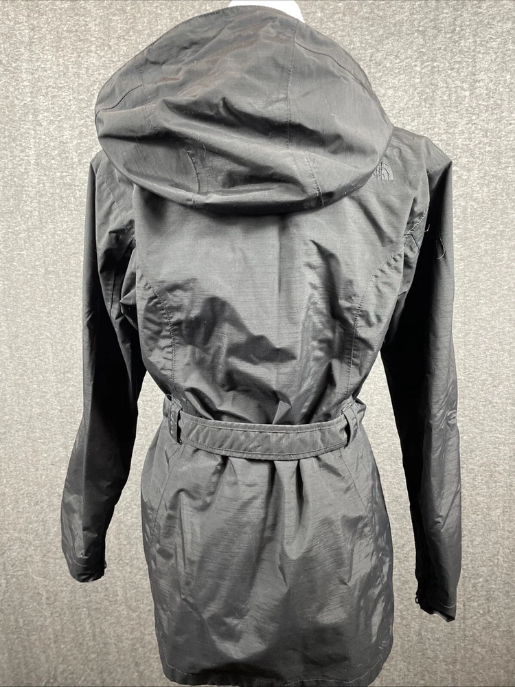 Women’s North Face Black Parka Jacket Hyvent with zip sleeves. The jacket is belted and has a removable hood in black, zip up with nylon lining. Hits at mid thigh for most. Size L