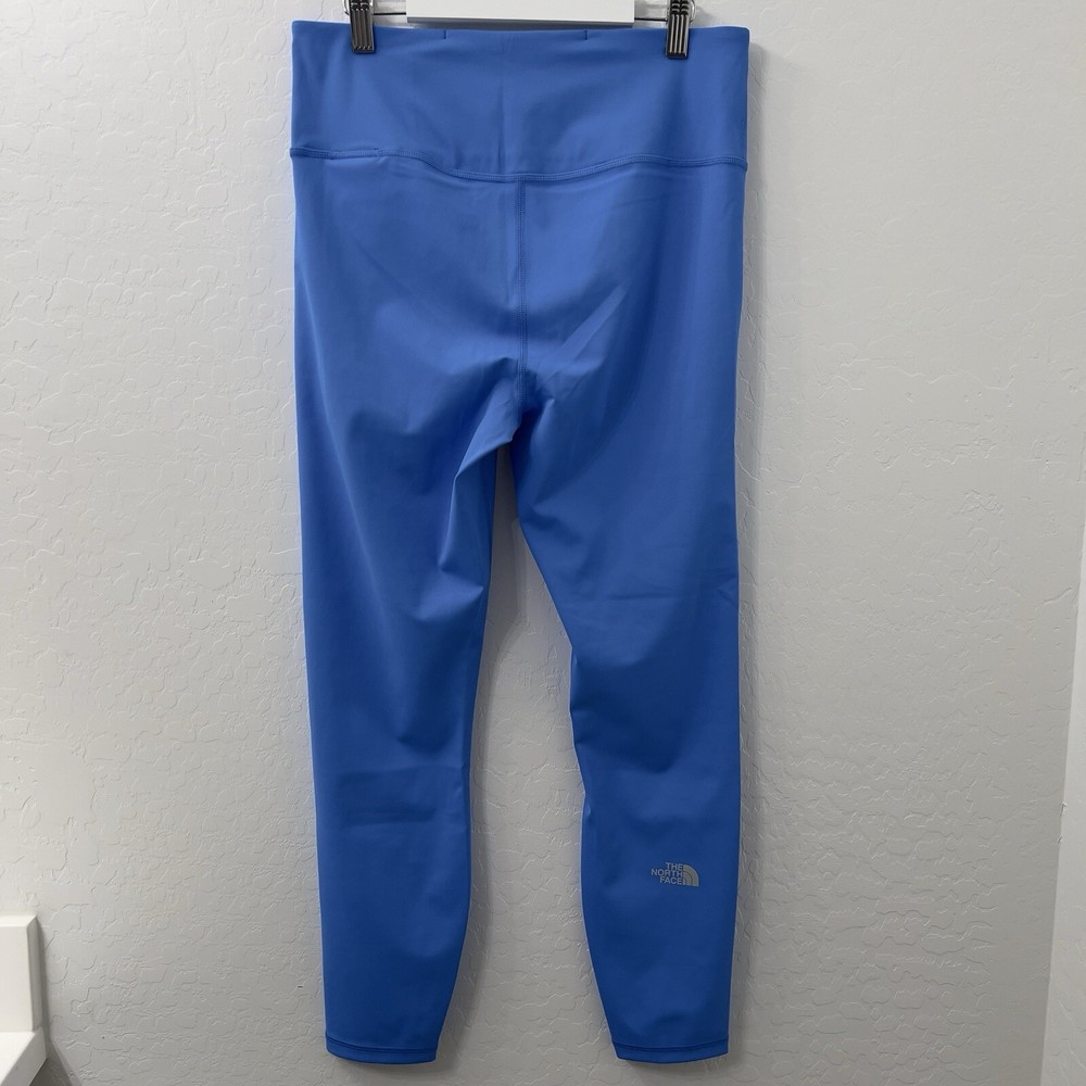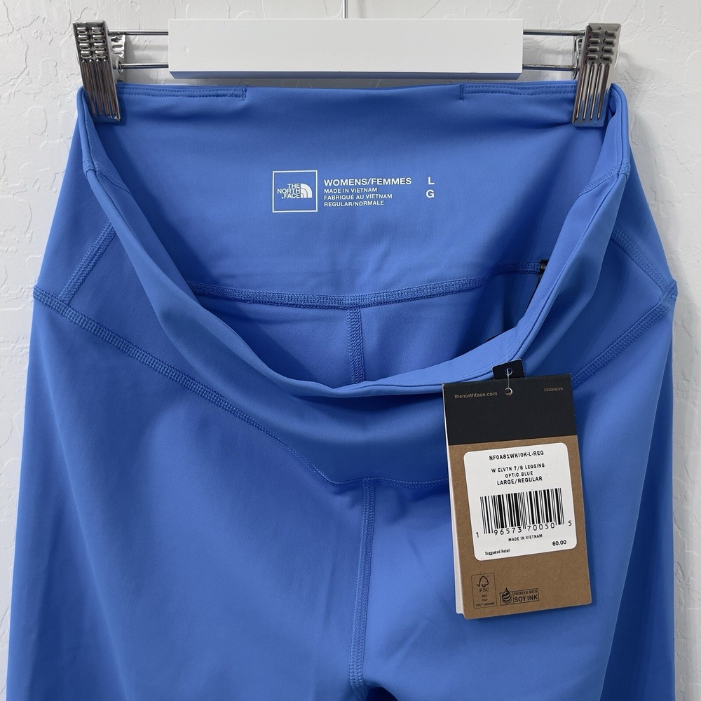 Elevate your workout wardrobe with these stylish and functional North Face Elevation 7/8 Leggings in Optic Blue. Designed for women in size large, these leggings boast a polyester blend fabric that is machine washable and quick to dry. The elastic waist and stretchy material provide a comfortable fit that is perfect for cross training or yoga. These solid-colored leggings have a 25-inch inseam and a skinny leg style that is perfect for activewear. The pull-on closure makes them easy to wear, and the blended fabric ensures that they are durable and long-lasting. Whether you're hitting the gym or running errands, these leggings are the perfect addition to your activewear collection.