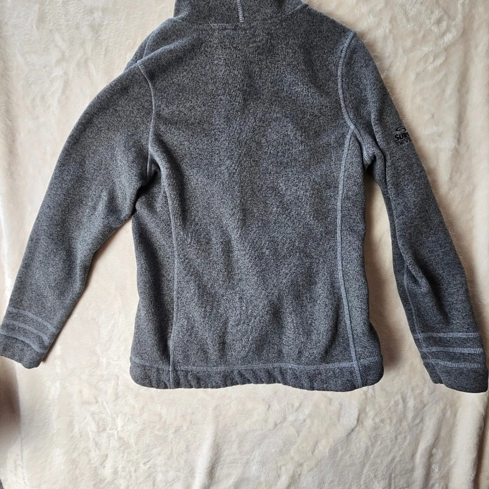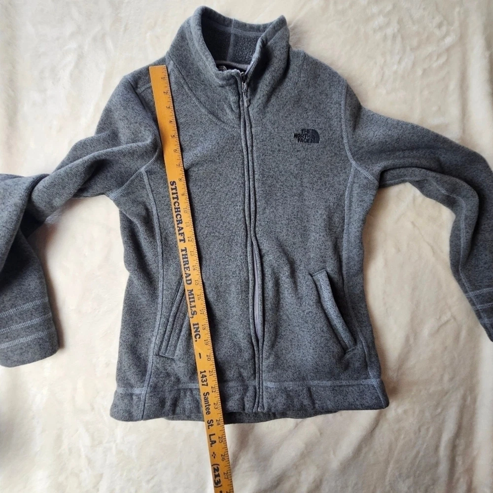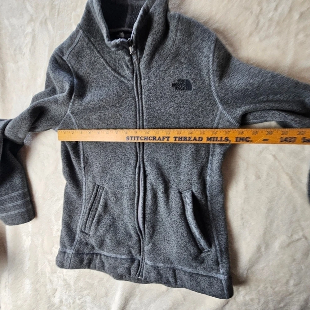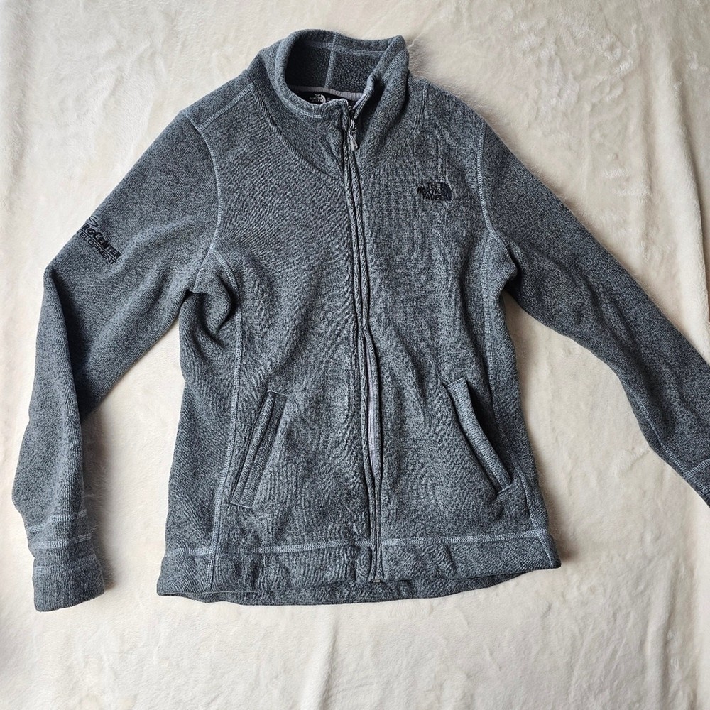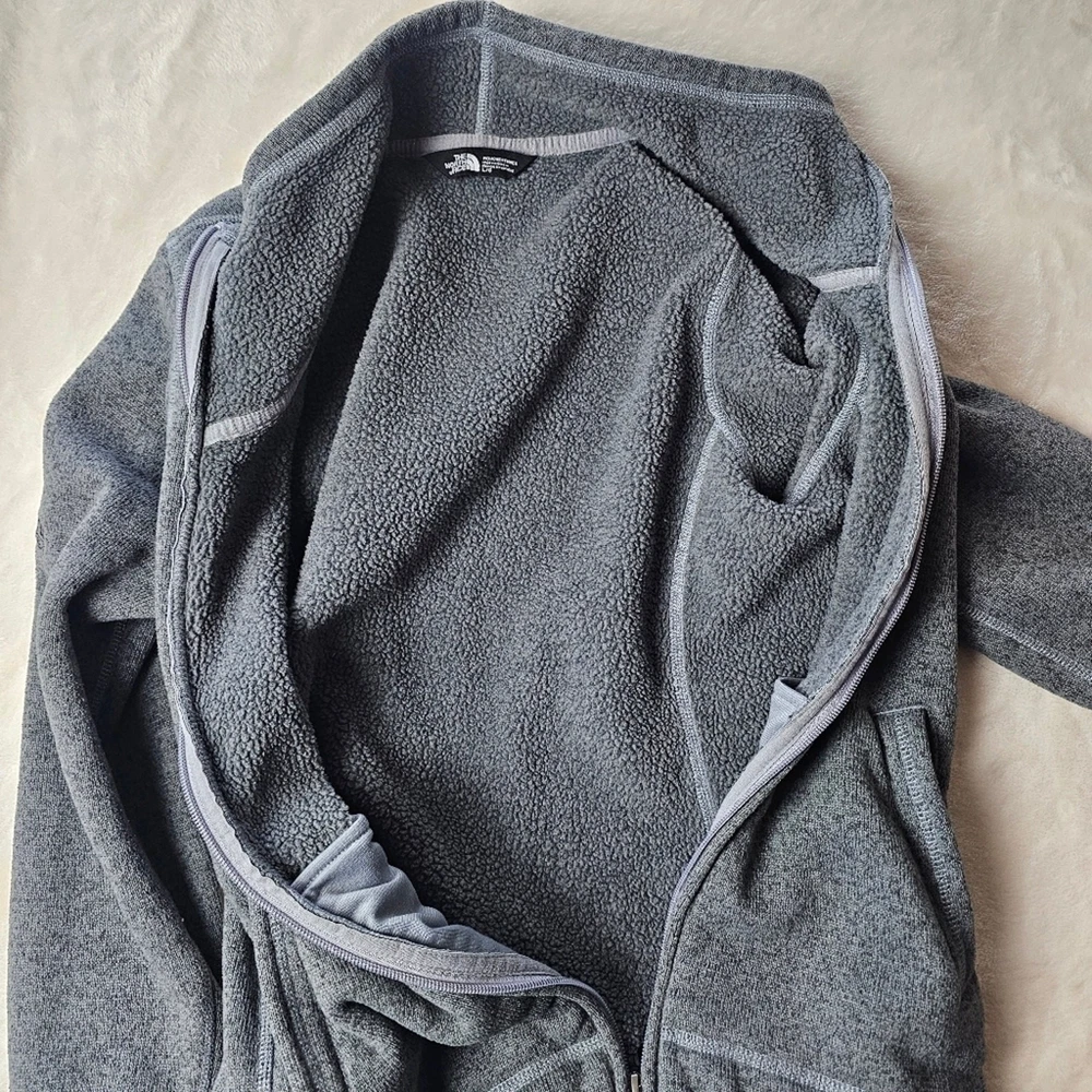 North Face Fleece Zip Sweater Gray Large Women’s Logo detail pic 4 shows logo on sleeve Fall Winter Layer Warmth Cozy Comfort Athleisure Travel vacation Preppy