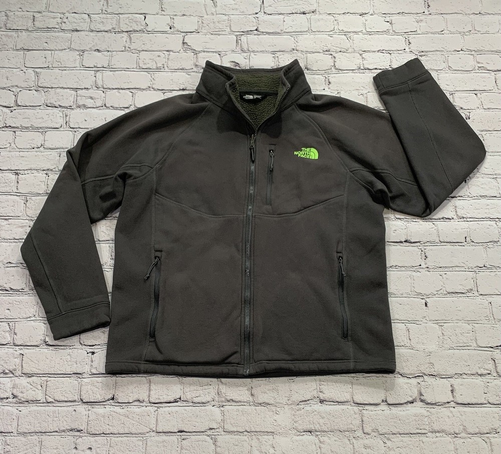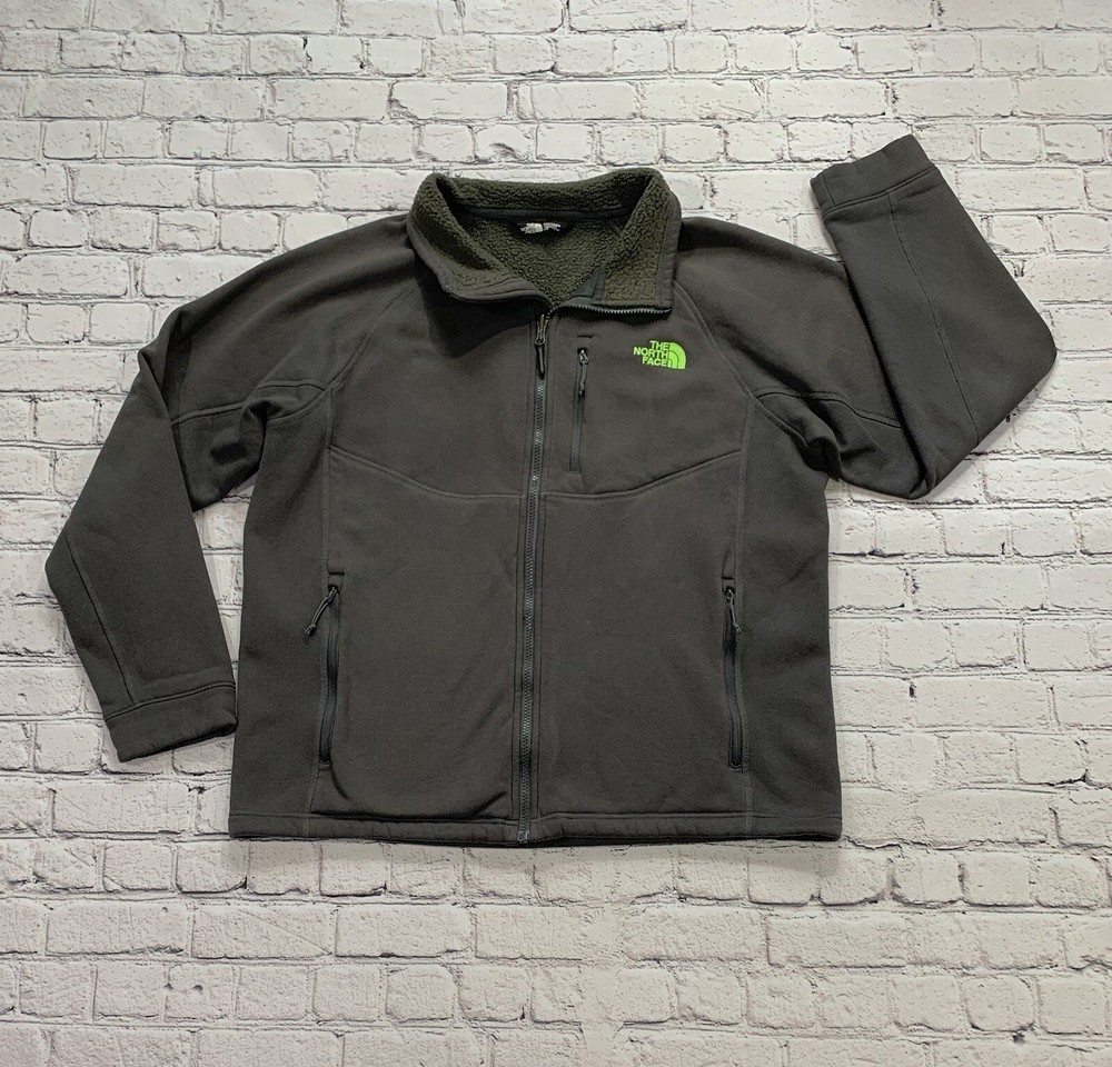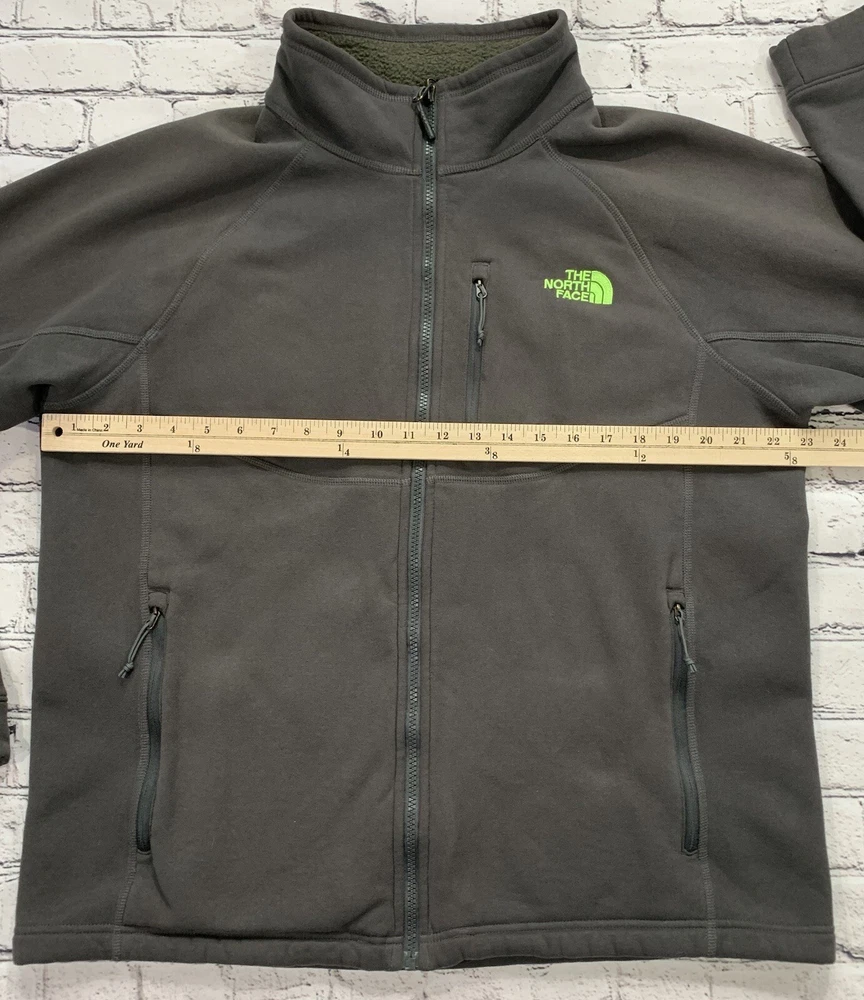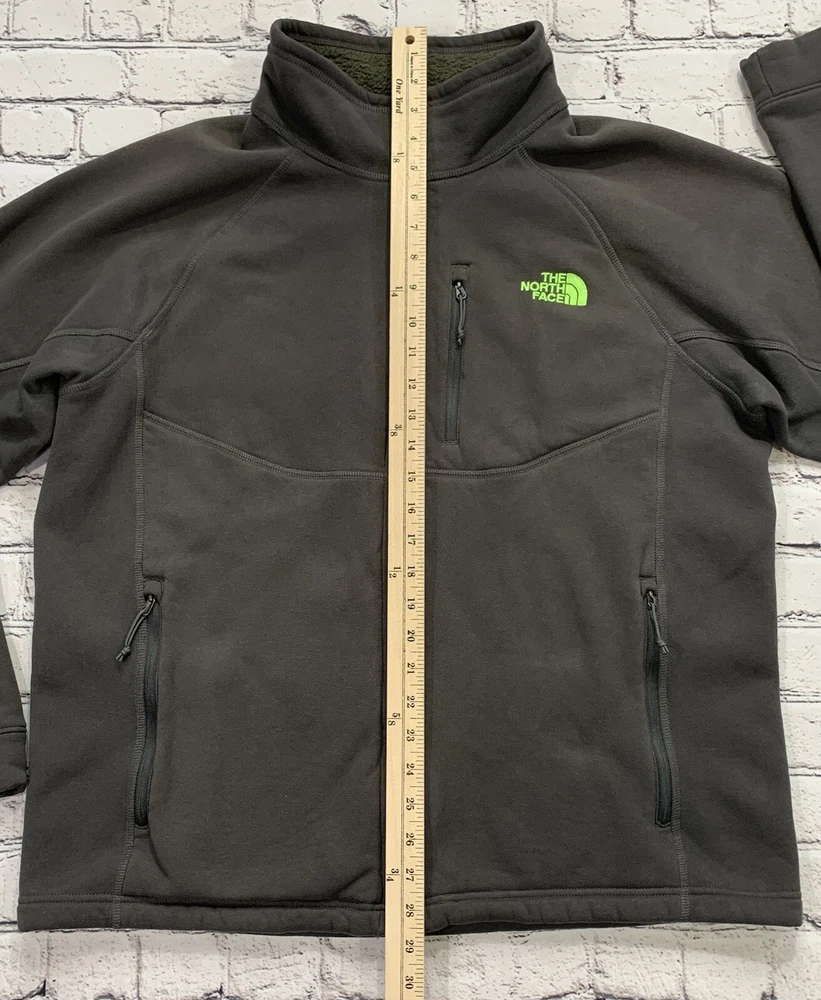 Preowned The North Face Jacket Men's Large Dark Gray And Green Zip Up Fleece Long Sleeve. Please see all pictures for details, measurements and minor flaws if any.
