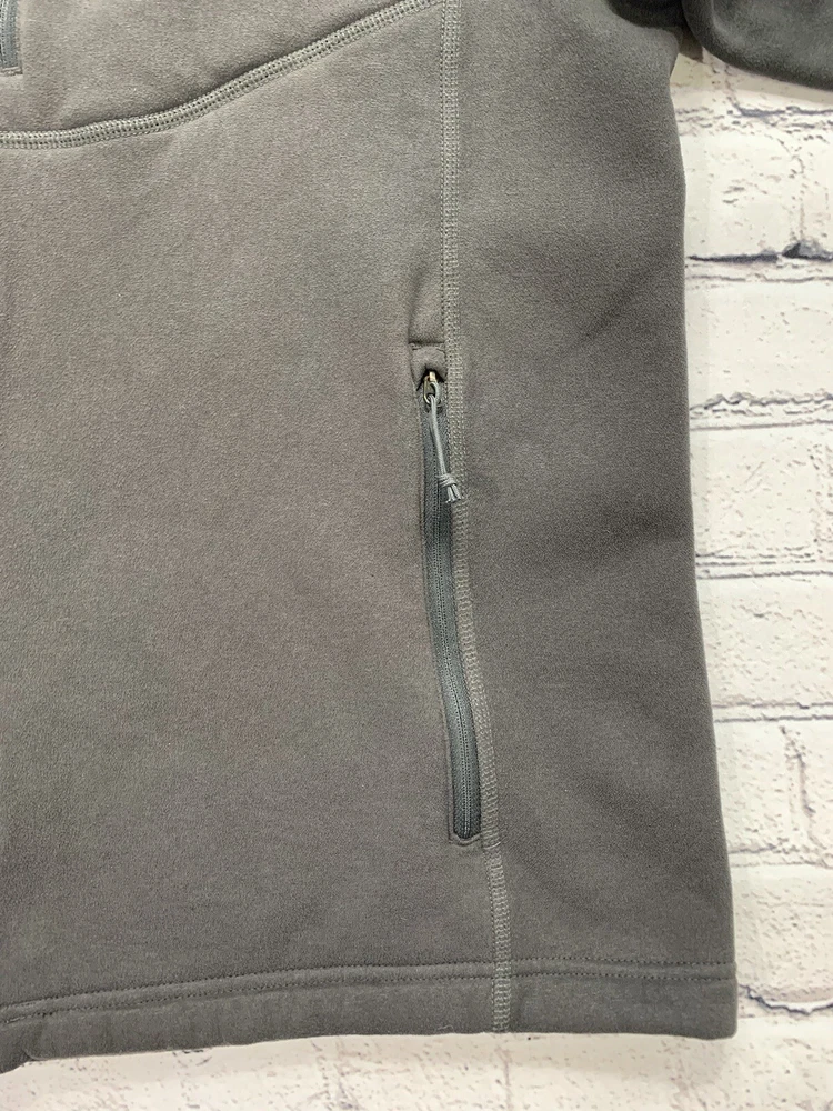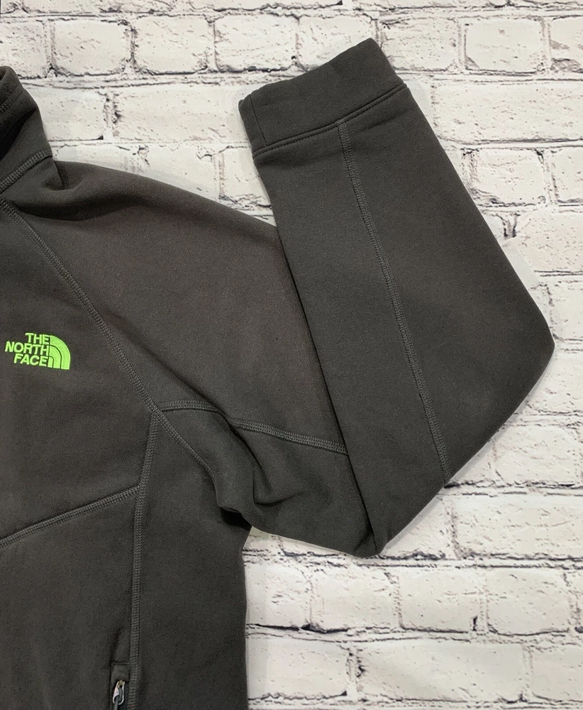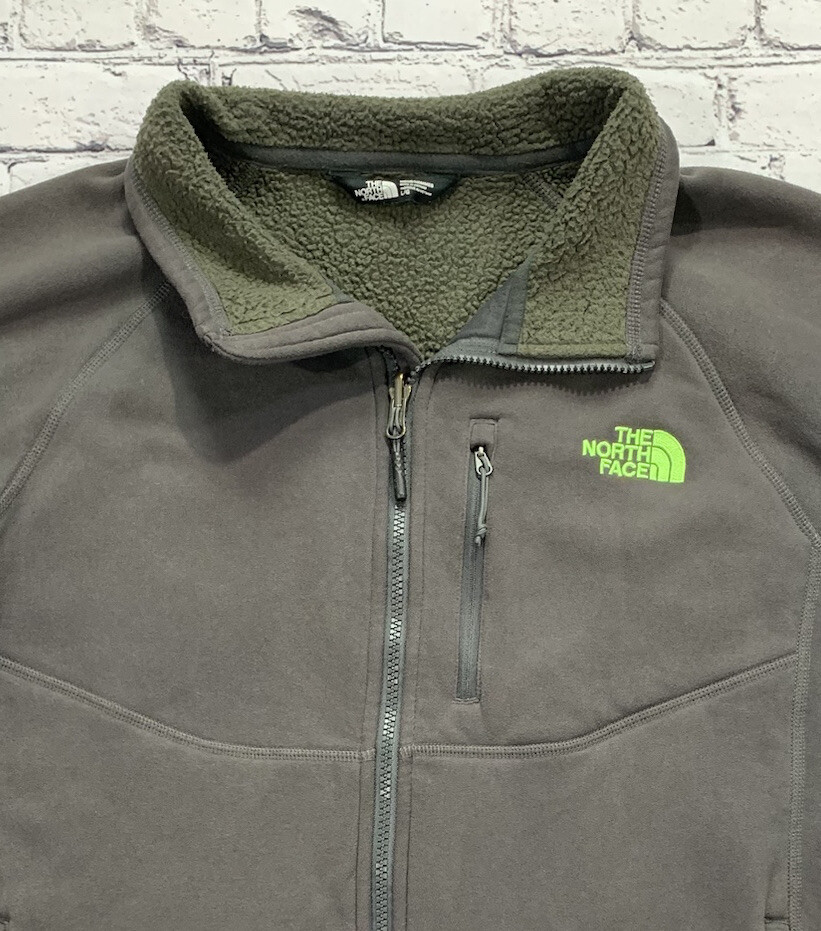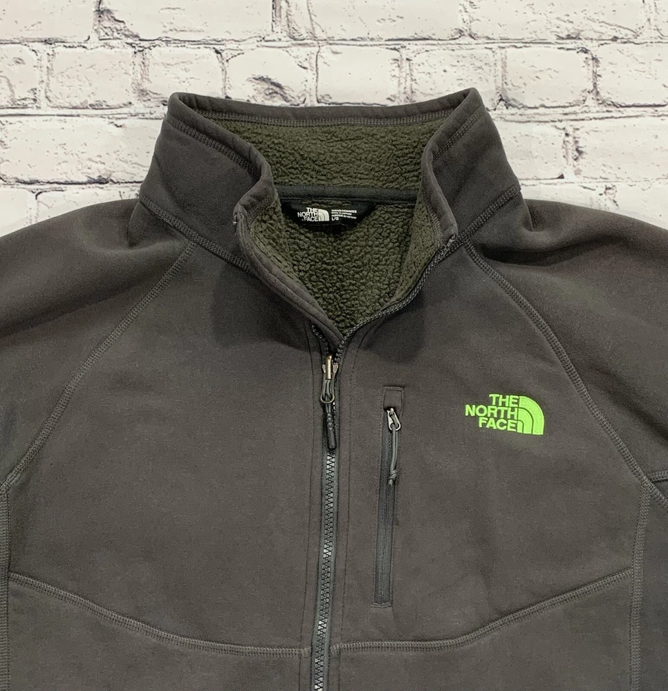 Preowned The North Face Jacket Men's Large Dark Gray And Green Zip Up Fleece Long Sleeve. Please see all pictures for details, measurements and minor flaws if any.