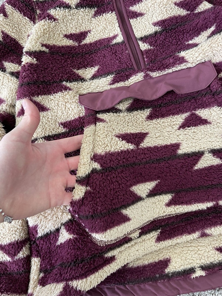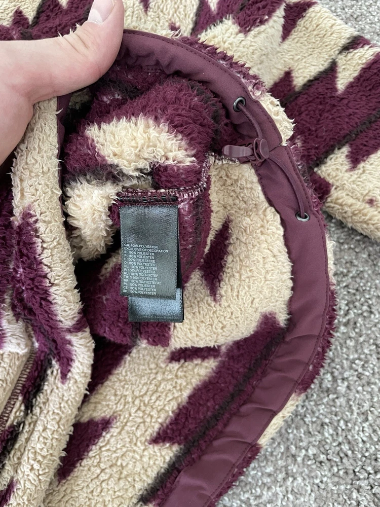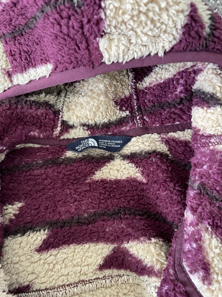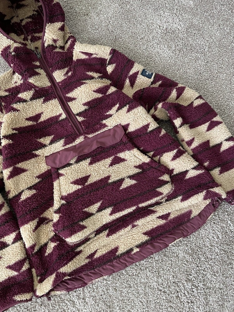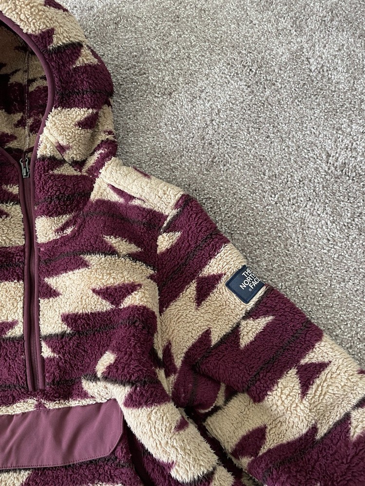 This women's hoodie from The North Face features a unique Aztec theme with a fleece fabric type and a cozy sherpa lining made of polyester. The pullover style hoodie has long sleeves and a regular fit, making it comfortable for everyday wear. It includes practical features like pockets and a logo accent, perfect for staying warm and stylish during outdoor activities or casual outings. The machine washable garment is in a size medium, ideal for those looking for a versatile activewear piece with a touch of distinctive design.