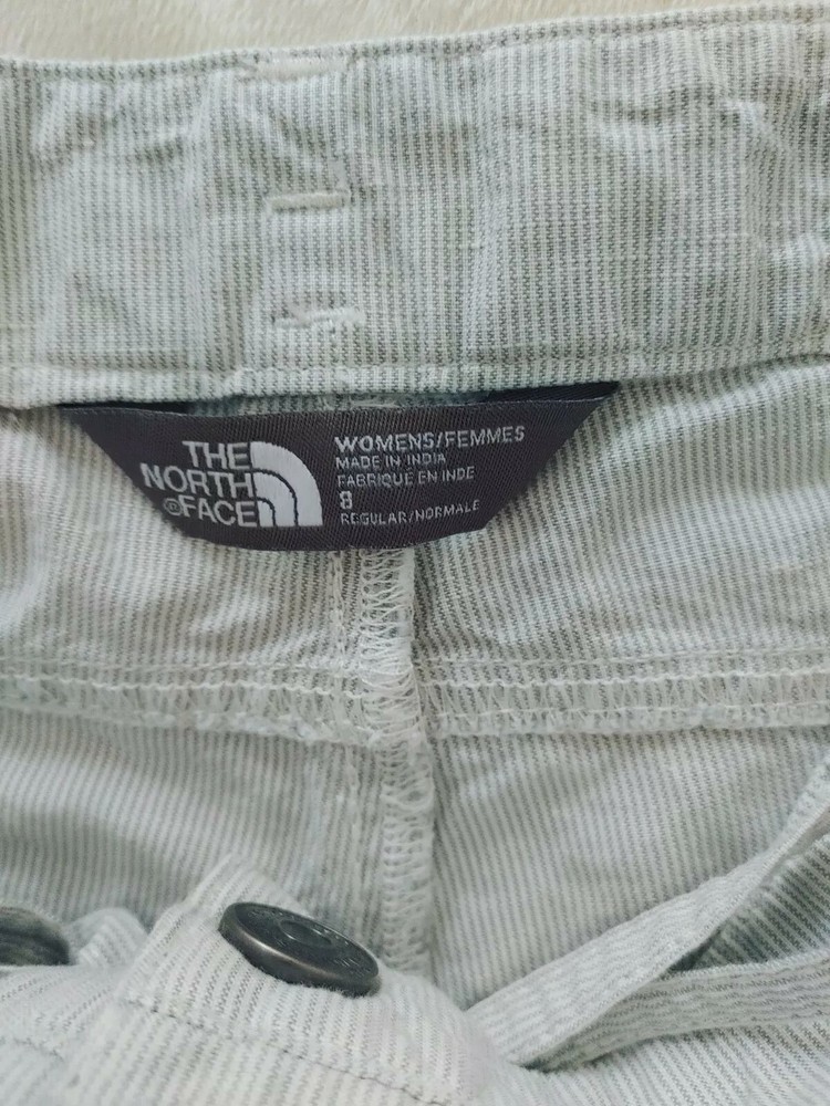North Face Women's Shorts Grey/white Pin Stripe Linen 56% / 44% Cotton Size 8. Lining is 65% poly 35% cotton Measurements shown in photos 6" inseam 34" waist