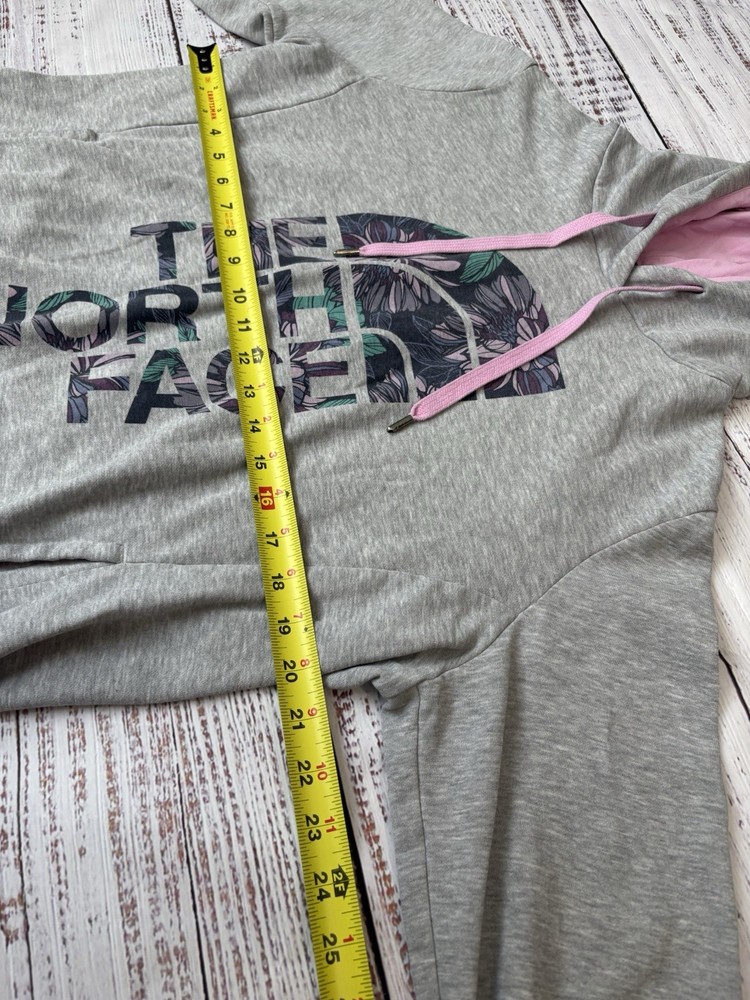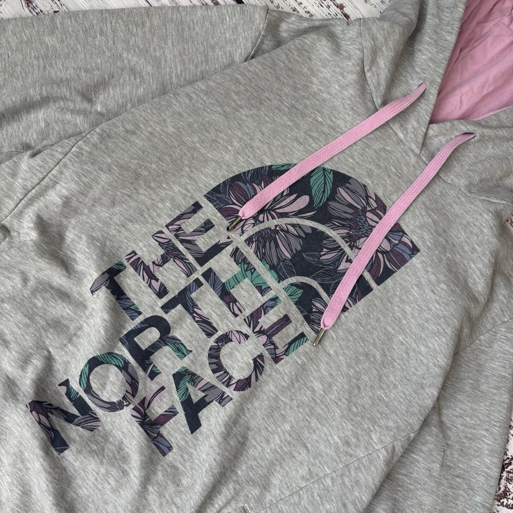 Description: Stay cozy and stylish with this North Face women’s pullover hoodie in light gray with a soft pink hood lining and drawstrings. Features a large floral print North Face logo across the front. Soft fleece interior for extra comfort. Perfect for casual days, outdoor adventures, or layering in cooler weather. ⸻ Measurements: Shown in photos ⸻ Condition: Gently used ⸻ Flaws: No noticeable flaws. ⸻ Shipping: I usually ship within 1–2 days. I offer bundle deals — message me if you’re interested in multiple items to save on shipping!
