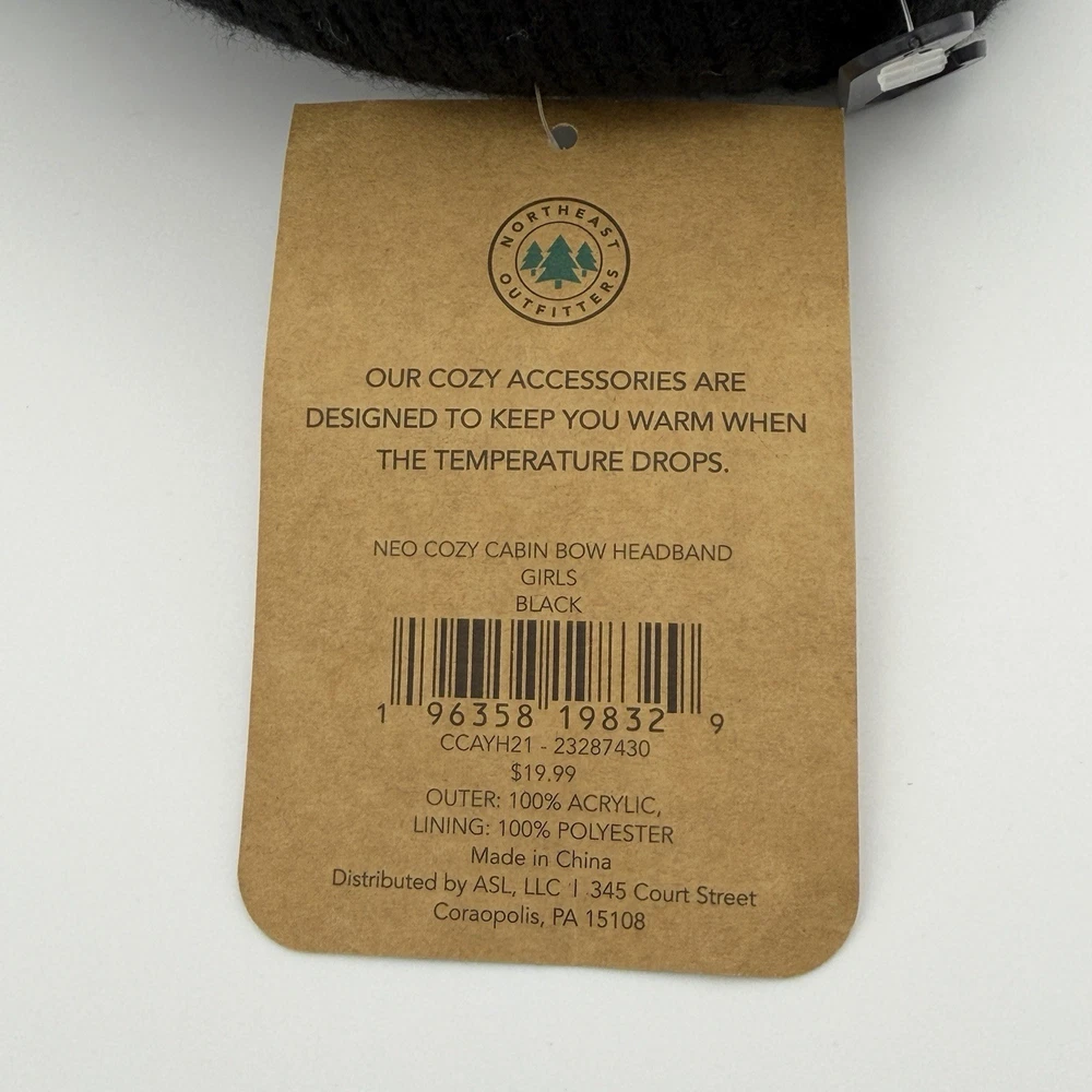 Northeast Outfitters Cozy Cabin Girls Bow Headband Black Color Winter Youth Size New with Tags - Comfy - Snug Fit The Northeast Outfitters Cozy Cabin Girls Bow Headband in Black is a stylish accessory designed for young girls during the winter season. Made from a blend of acrylic and polyester, this headband is cozy and comfortable, keeping your child warm and stylish. The black color and bow accent add a cute and feminine touch to any outfit, making it a versatile and practical addition to any little girl's winter wardrobe. Made with a warm fleece lining, this one-size headband is sure to keep your child looking chic and feeling comfortable during the colder months. Exterior: 100% Acrylic Lining: 100% Polyester Retail price = $19.99 ---------------- Smoke-free home. Items stored in cool, dry space. Please see photos for best description of the item’s condition. All photos are of the actual item listed for sale, unless otherwise noted. We do our best to provide proper photos and descriptions of the items to insure there are no surprises once received. Thank you for shopping Declutteringo!