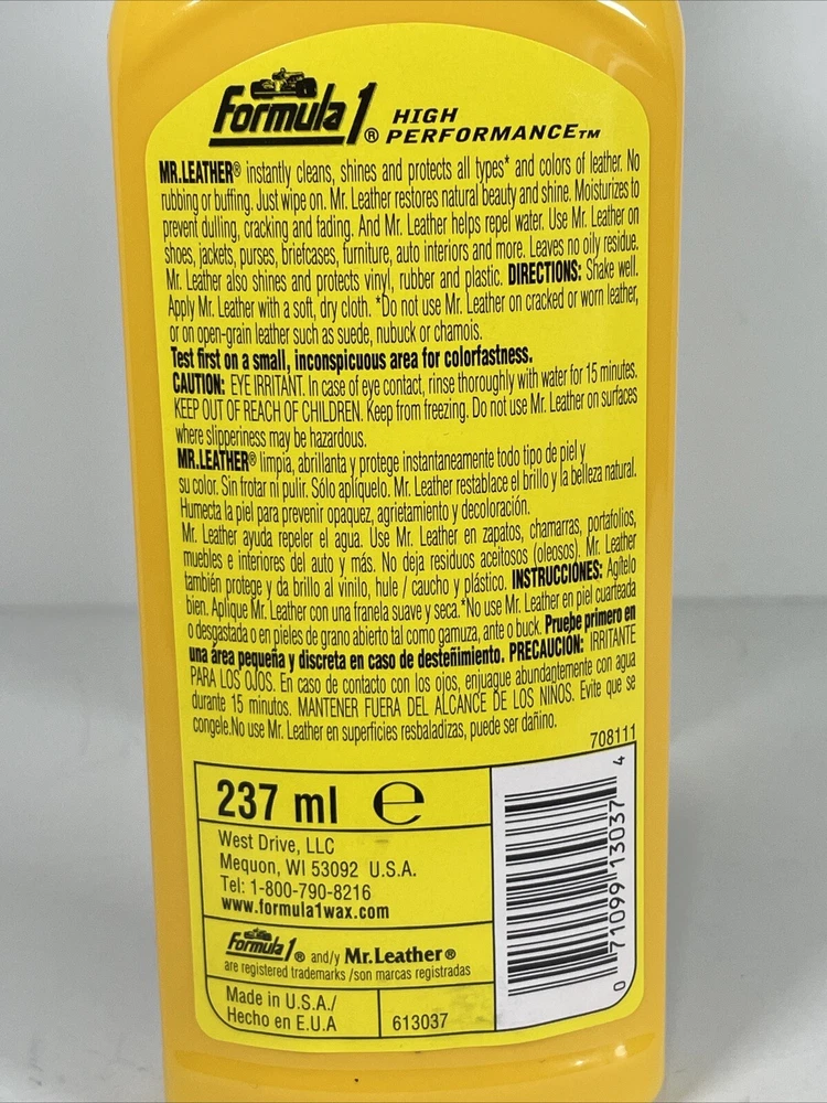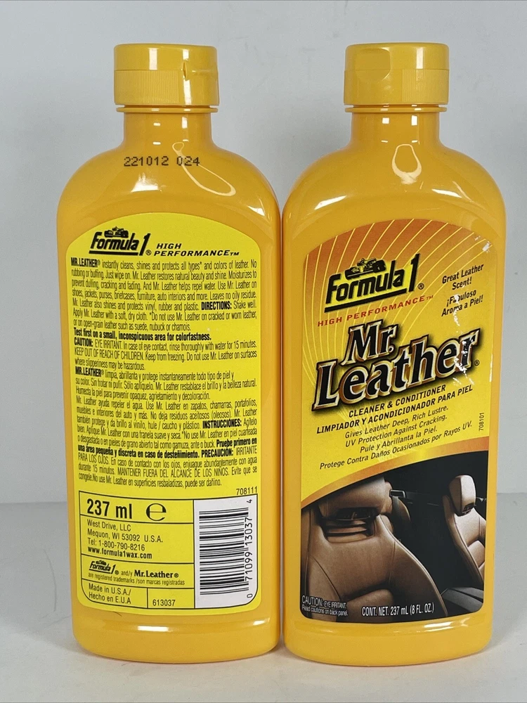 Color: Yellow Weight: 8 0z Product Line: cleaner acondotioner Brand: Formula 1 ISBN: 0071099130374 Package Dimensions LxWxH: 6.89x3.31x1.3 Inche8 Type: Mr.Leather Cleaner Coditioner UPC: 071099130374 Shape: Rectangle Size: 8 fl. oz gtin13: 0071099130374 Material: Plastic