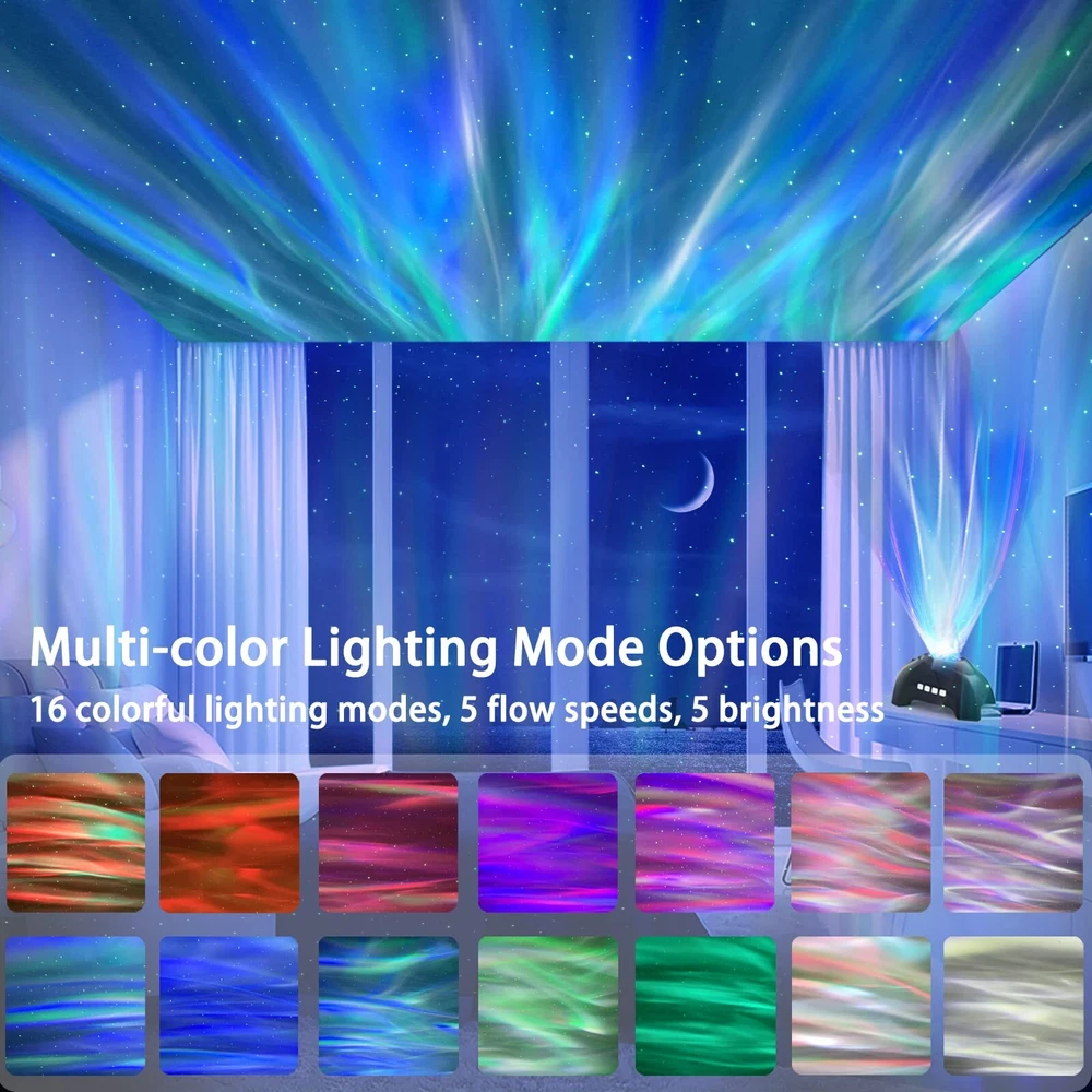 3 in 1 Aurora Light Projector - You can have both northern lights and stars working in unison or independently according to your preference. With the 4 basic aurora colors (Red, Green,Black, White), they can display by separation or combination, they can be static or moving, fast or slow, creating a miraculous ambience to your room Bluetooth Speaker & Sound activated - With the speaker built-in, our star projector can connect your devices via Bluetooth to play music and it also allow the lights projection sync with the music beat, creating a disco effect which is perfect for the party . Perfect for relaxing, and for party, bedtime story, to create all the atmosphere you need 8 White Noise & Auto Off Timer - There are 8 white noise songs on this projector, which are a varied selection of relaxing sounds, from birds tweeting and chirping through running water, soothing chimes and crackling firewood. Options built-in 1hour and 2 hours timer. and 4hours auto off timer is default setting that you can't cancel it, to bring you a convenient power saving way that you don't need to worry about forgetting to turn off the light when you fall asleep 4 Brightness & 4 Motion Speeds - 4 adjustable brightness and 4 light flow speed for your option. You can choose different level brightness according to your needs. The maximum brightness one is suitable for daytime while the minimum brightness perfect for bedtime Ideal for Adults & Kids - Star projector is suitable for birthday, party, room decor, children's day, Christmas, Anniversary. Northern lights creates a wonderful and stunning atmosphere to help children stimulate their curiosity, imagination, and creativity.Perfect for indoor decoration as a romantic mood light, night lamp and bedside lamp