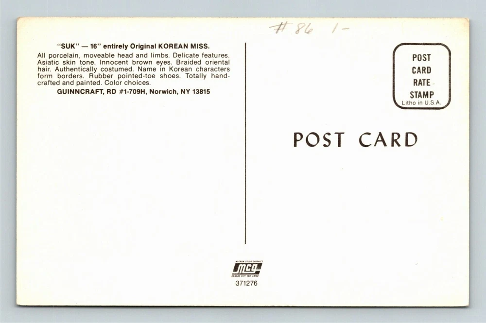 Norwich NY-New York Guinncraft Porcelain Korean Doll Antique Vintage Postcard