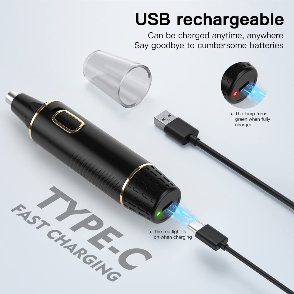 【Versatile Nose Hair Trimmer Women】-This ear and nose hair trimmer can effectively and comfortably remove unwanted hair from your nose, ears, eyebrows, beard, and face. One-button design is easy to use. Let you show the most confident side anytime, anywhere. 【Powerful & Painless Nose Trimmer Women】-Our nose hair trimmer features an inner 360° rotating design that smoothly and painlessly removes hair without pulling. The powerful 10000 RPM motor ensures precision trimming without any unpleasant sensations. 【USB Rechargeable& Low Noise Nose Trimmer Women】-Our nose and ear hair trimmer comes with a USB cable and built-in battery for easy recharging. Charge for two hours, with two minutes of continuous use for 2-3 months each time. With operating noise less than 50db, use the nose hair clippers freely. 【Easy to Clean Face and Eyebrow Trimmer Women】-This Ear and nose trimmer has a washable head to ensure your pen trimmer is clean after each use. Plus, comes with a cleaning brush and a dust-proof cap to make maintaining and cleaning a breeze. 【How to Use Nose Hair Trimmer Women】- Fully charge your device before operation. Turn the power button on and slowly insert the comfortable cone tip into your nose or ear. Allow The nose trimmer to trim hair for at least 60 seconds.