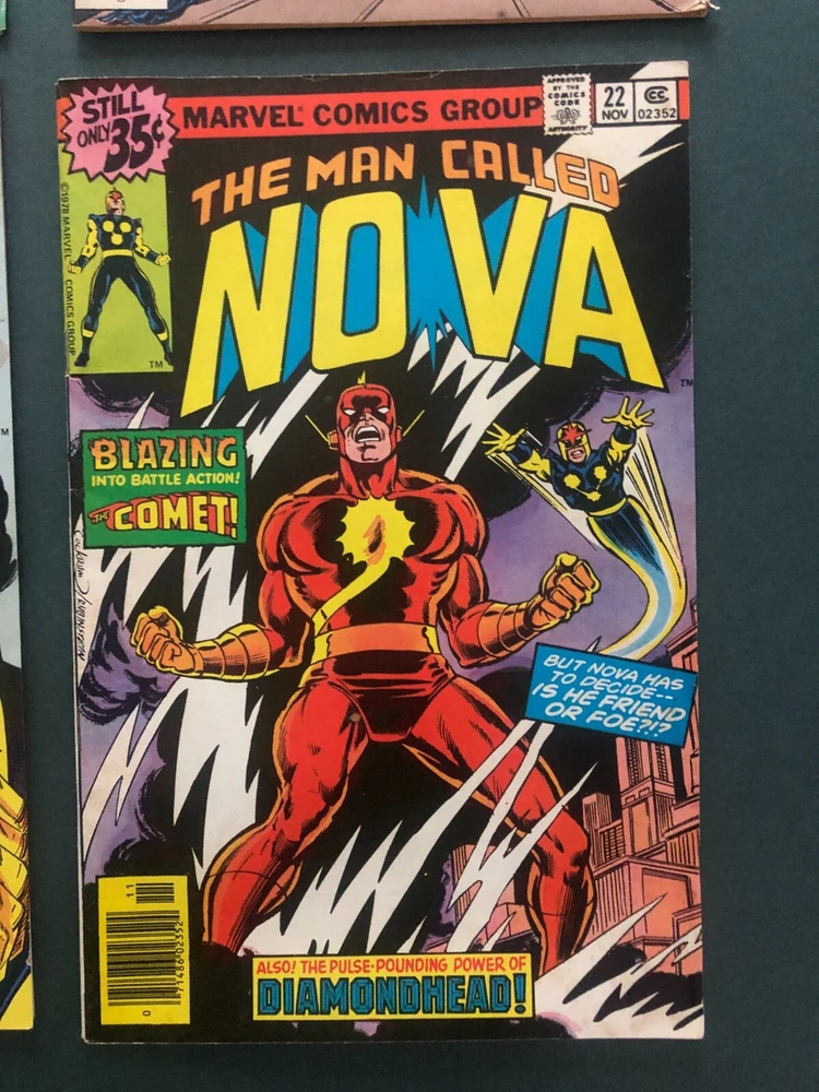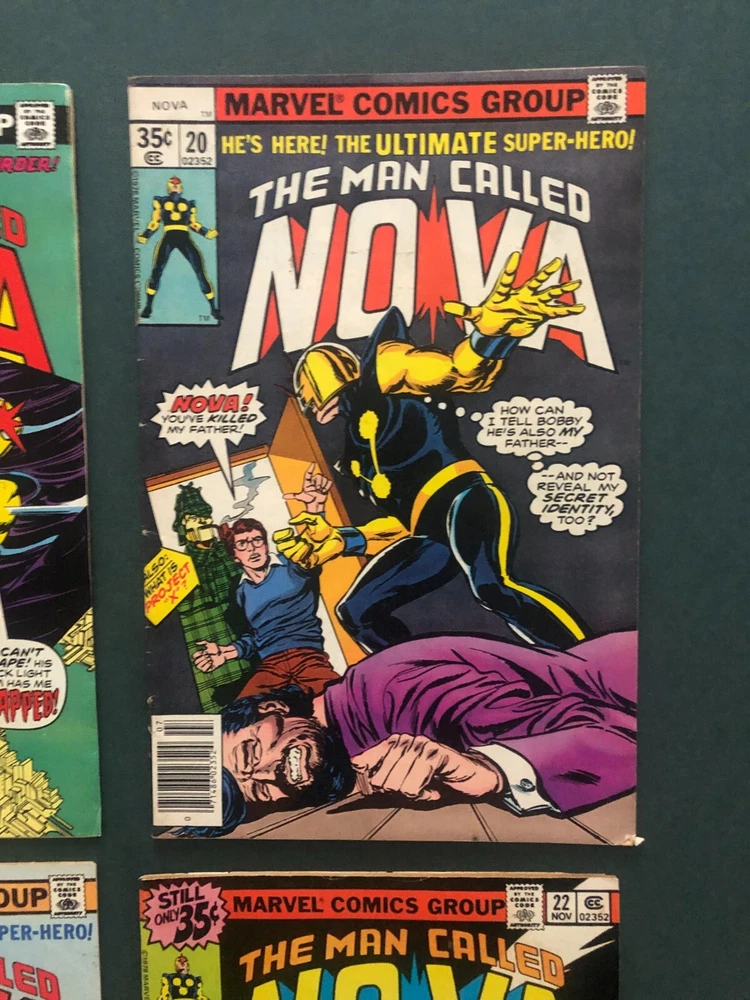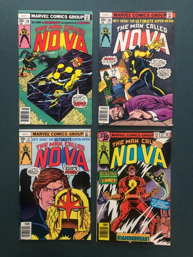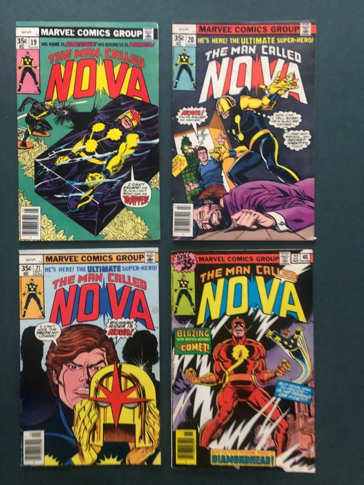 Vintage:YesCharacter:Nova (Richard Rider)Universe:Marvel (MCU)Seller Notes:“Very Good condition. Please see photos for condition details.”Issue Number:19, 20, 21, 22Style:ColorType:Comic BookTradition:US ComicsFormat:Mixed LotGenre:Action, Funny Animal, Horror & Sci-Fi, Humor/Satire, Movie,TV & Music, Movie & TV, Science Fiction, Superheroes, War, Western, Action/Adventure, Heroic FantasySeries Title:NovaEra:Bronze Age (1970-83)Publication Year:1978Language:EnglishPublisher:Marvel ComicsUnit of Sale:Comic Book LotUPC:Does not applyCountry/Region of Manufacture:AmericaArtist/Writer:Al Milgrom, George Perez, Jack Kirby, Marv Wolfmangtin13:Does not apply