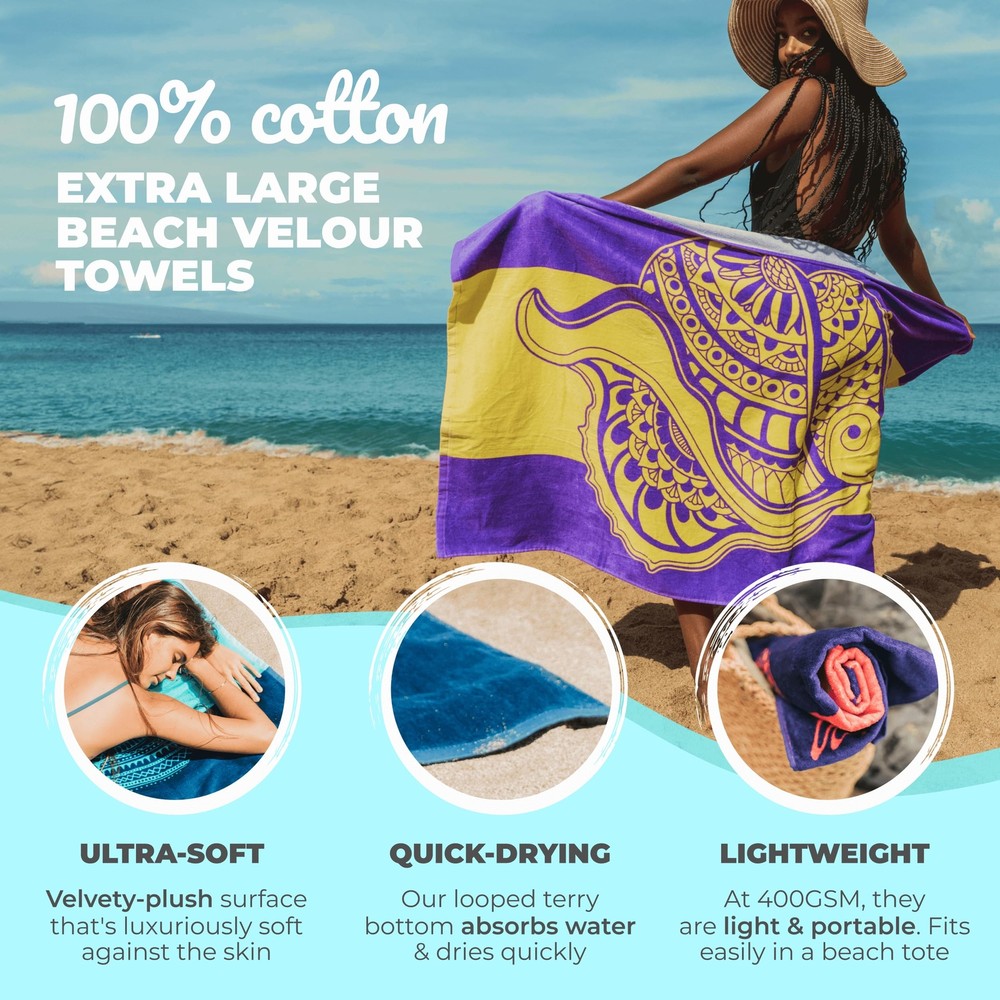 Seashell Beach Towel (34 X 63) - Purple & Yellow Travel Towel Made From 100% Cotton - Unique Adult With Tropical Design - Compact GO-TO BEACH ACCESSORY - Make summer plans even better with oversized cotton beach towels ☀️ Our soft and absorbent towels are perfect for both men and women. Each towel is printed with fun tropical designs. Pick one for each family member! PERFECT SIZE FOR THE BEACH - Measuring 34 x 63 in / 86 x 160 cm, our extra-large beach towels have plenty of room to stretch out and relax 🌴 Whether you're working on a tan or catching up on reading, you won't have to pause to shake sand away. These big towels even double as a blanket 100% COTTON VELOUR - Enjoy the softness and absorbency of our premium cotton beach towels 💧 Unlike microfiber towels, ours offer a plush velour surface and a looped terry bottom that absorbs water quickly 🏄 At 400GSM, they're also lightweight and portable COLLECT THEM ALL - Easy to spot from a distance, our family-friendly beach towels feature bright, tropical designs inspired by our love of the ocean 🌊 Each unique towel makes a great gift 🐚 This style features a conch shell on vibrant purple and yellow stripes SUPER VERSATILE & DECORATIVE - Designed with your busy life in mind, our versatile and packable beach towels can be used many ways 🌈 Bring them to the pool and lay them over sun loungers. Travel to the beach for a relaxing day in the sand. Use them as cozy bath towels or throws Fun summer plans get even better with our bright and colorful cotton beach towels. Lightweight and packable at 400gsm, our extra-large beach towels are easy to roll up and bring along. Adults and kids love them! Ideal for the whole family, our beach towels are extra-large at 34 x 63 in/86 x 160 cm. Use them as a beach blanket or lay them over a hot sun lounger by the pool. Our towels are 100% cotton and reversible. A plush velour top offers superior comfort while lying in the sun. A quick-dry loop terry bottom is ultra-absorbent and ideal for wrapping up in after a swim. Vibrant colors and unique designs make our towels stand out, even on a crowded beach. Fun tropical motifs make them collectible and giftable. Give one to a beach-loving friend or avid traveler. Don't plan your next beach day without packing the perfect towel. Our bright and colorful cotton beach towels are designed to make trips to the seaside—and the poolside—better than ever. Choose your favorite colors and sea-inspired motifs for yourself and every member of the family. Our unique designs are inspired by the ocean and everything that lives in (and near) it. Our bright and colorful designs are fun, but they're also functional! You'll be able to quickly identify your spot on the beach when you look for our unique tropical color palettes. All of our towels make perfect travel companions. Lightweight and packable at 400gsm, they can be tucked into backpacks, suitcases and beach bags with ease. Extra-large dimensions let you wrap up warmly after a swim. Measuring 34 x 63 in/86 x 160 cm, they keep the sand off your body, even doubling as a blanket for napping in the shade. Safety and wellness are our priority. Bringing family to the beach? Our colorful designs will make them easy to spot. Made with busy summer schedules in mind, these towels are easy to care for. Just toss them in the wash! Durable construction ensures they'll be around for many seasons to come. Shipping We offer FREE shipping on all orders! We ship within Three business days of payment, usually sooner. We use a selection of shipping services such as UPS, FedEx, USPS etc. We only ship to the lower 48 states, no APO/FPO addresses or PO Boxes allowed. Local pickups and combined shipping options are not provided at this time. Return You can return a product for up to 30 days from the date you purchased it. Any product you return must be in the same condition you received it and in the original packaging. Please keep the receipt. Payment We accept payment by any of the following methods: PayPal Please pay as soon as possible after winning an auction, as that will allow us to post your item to you sooner! Feedback Customer satisfaction is very important to us. If you have any problem with your order, please contact us and we will do our best to make you satisfied. Contact Us If you have any queries, please contact us via ebay. We usually respond within 24 hours on weekdays. Please visit our eBay store to check out other items for sale! Thank you for shopping at our store.