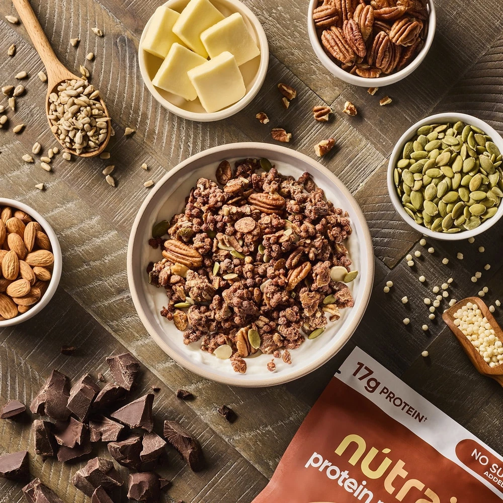 NuTrail 17g Protein Nut Granola Cereal, Chocolate, Healthy Breakfast 10 oz. 1 Count. Item description from the seller: Our Chocolate nut protein granola , No Sugar Added , takes our Nut Granola to the next level ,with added essential protein crisps. Packed with 17g of protein and 1g sugar, this granola offers the invigorating flavor, crunch, and lasting energy you’re looking for. You can take this on the go to fuel up between meals, have it as breakfast, with a bowl of your preferred milk, or use it to dress up your favorite dessert. This 10oz bag of wholesome nutrition ,is perfect for adventuring, relaxing, recharging, or just straight up indulging. At NuTrail, we love meticulously crafting the best high quality, low sugar experiences for you. Treat yourself to a nourishing treat , you deserve it. Chocolate Protein Granola gives you energy ,that lasts all day log with 17g of protein per 2/3 cup serving. 17g protein nut granola ,with no artificial flavors, dyes, or sweeteners. Perfect crunchy smoothie topper, with milk for breakfast, or by the handful.