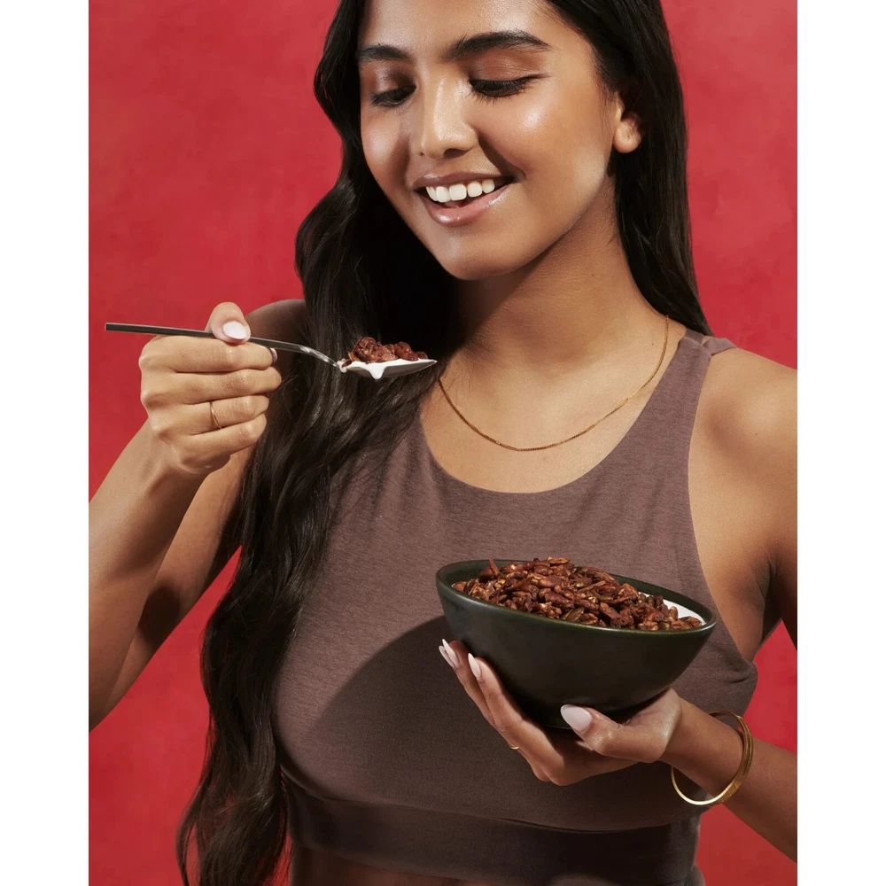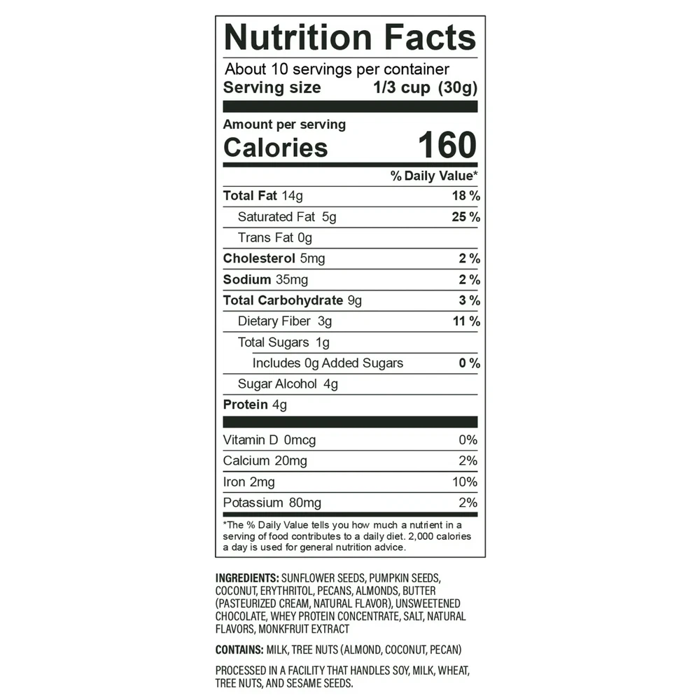 NuTrail Nut granola Cereal, dark Chocolate, No Sugar added, 11 oz...(FREE & FAST SHIPPING) Product details: This one’s for our chocolate lovers! Low-sugar, Low-carb as always . So No Worries There. Our Signature Blend of Nuts and Seeds, Paired with Unsweetened Chocolate and Naturally Sweet Monk Fruit. A Perfect Pair For Your Favorite Nut Butter or a Healthy Topping For Your Favorite Dessert – You Really Can’t Go Wrong. DELICIOUS HEALTHY NUT GRANOLA : a no Sugar added, Gluten-Free, Grain-Free, Non-GMO, Keto and Kosher Certified, only 1-3g Net Carbs per serving. NO WRONG WAY TO LOVE US : Enjoy our Granola with Milk as a Low-Carb, Low-Sugar, Keto Cereal, Atop your Favorite Smoothie or Parfait, or Straight Out of the Bag! SWEET OR SAVORY : Whether you’re Making Dinner or Dessert our Low-Sugar, Low-Carb Nut Granola Adapts to Your Needs. ON-THE-GO : Our Low-Sugar, Low-Carb, Non-GMO, Keto Granola is Perfect For Your Busy Lifestyle. It can be a Snack or a filling meal sure to satisfy your cravings. WE'VE BEEN CALLED : Best In Class Granola, Low Carb granola, Gluten Free Certified granola, Low Carb Snack, Low Sugar Snack Nutrition facts Refer to the product label for full dietary information, which may be available as an alternative product image. 10 Servings Per Container Serving Size 1/3 cup (30g) Amount per serving Amount per serving % Daily Value* Total Fat 18% Saturated Fat 5g Trans Fat 0g Cholesterol 5.0mg Sodium 25mg Total Carbohydrate 9g Dietary Fiber 3g 11% Sugars 1g 0% Sugar Alcohol 4.0g Calcium 0.0mg Potassium 160mg Iron 1.2mg Vitamin D 0.0mcg * The % Daily Value (DV) tells you how much a nutrient in a serving of food contributes to a daily diet. Calories per gram:Fat 9 • Carbohydrate 4 • Protein 4 More details Nutrient Content Claims Low-Carb, Wheat-Free, No Sugar Added, Grain-Free, Gluten-Free Nut Type Pecans, Almonds Flavor Cacao Size 9.25x7x3 Food Condition Shelf-Stable Food Form Granules Container Type Bag Container Material Plastic Ingredients Sunflower Seeds, Pumpkin Seeds, Coconut, Erythritol, Pecans, Almonds, Butter (Pasteurized Cream, Natural Flavor), Unsweetened Chocolate (from Cacao Nibs), Whey Protein Concentrate, Salt, Natural Flavors, Monkfruit Extract. Active Ingredient Name Sunflower Seeds, Pumpkin Seeds, Coconut, Erythritol, Pecans, Almonds, Butter (Pasteurized Cream, Natural Flavor), Unsweetened Chocolate (from Cacao Nibs), Whey Protein Concentrate, Salt, Natural Flavors, Monkfruit Extract.