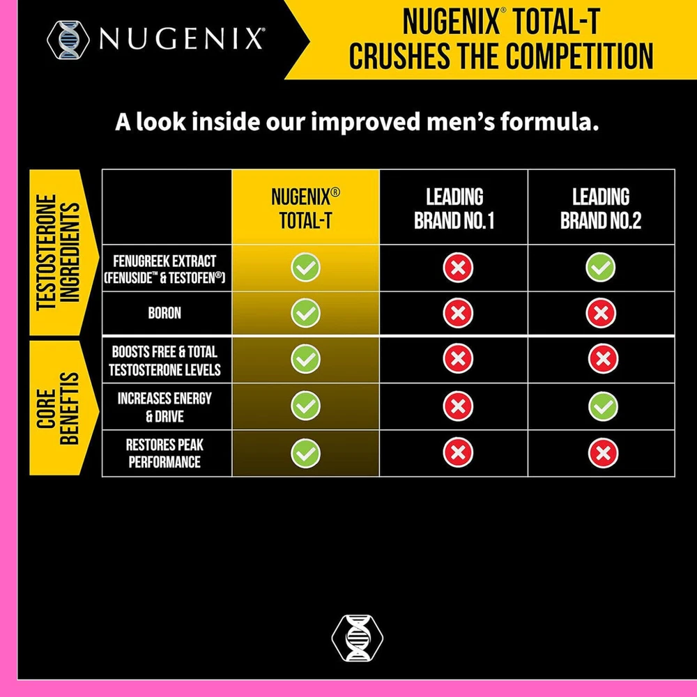 Total-T, Free and Total Testosterone Booster Supplement for Men 90 Count Brand B randed Flavor Unflavored Primary Supplement Type Testofen Unit Count 90.00 Count Item Form Capsule Item dimensions L x W x H 3.2 x 3.2 x 5.6 inches Special Ingredients LCitrulline Malate Diet Type Gluten Free Product Benefits Energy Management Age Range (Description) Adult About this item: Our new and improved compound, which is scientifically formulated, aids in increasing lean muscle mass and free and total testosterone levels. By safely increasing testosterone levels, our elite men's supplement is made to help men 40 and older reach their full potential. Without the use of stimulants or unnecessary fillers, Nugenix Total-T's ingredients have been clinically shown to provide more powerful and comprehensive testosterone support where others fail. You can keep your youthful edge as you get older with this potent, one-of-a-kind testosterone booster. Developed by the most popular GNC men's brand.