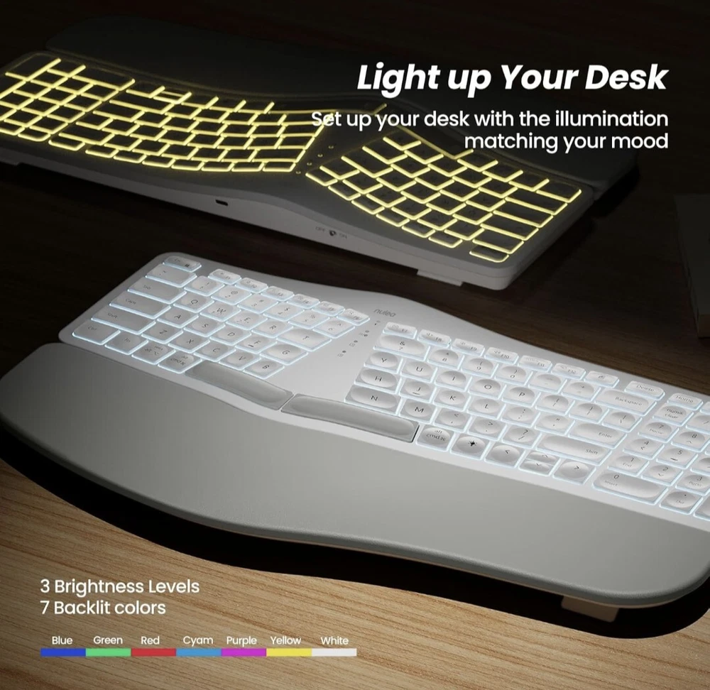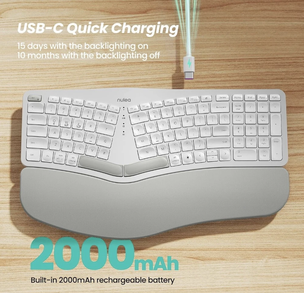 Exceptional Comfort: Standard keyboards force you to hold your wrists and arms at angles that can cause discomfort or pain in your hand, arm, or shoulder. With Nulea ergonomic wireless keyboard, it can help you position your body more properly, with your shoulders relaxed and can reduce the risk of fatigue and injury by its split, splayed and curved design. Easy Switching: By Bluetooth and 2.4G USB, the Nulea bluetooth keyboard can establish connections with up to three devices simultaneously and switch between them by pressing a button. This function allows you to utilize the keyboard to begin writing an email on your computer, switch to your smartphone to send a brief text message, switch to your laptop to change the background music, and then switch back to your PC to finish that email with one-tap. Adjustable 7 Color Backlight Lighting: The wireless bluetooth keyboard has a colorful backlit design. You can choose your own brightness and lighting kind with its 3 brightness levels and 7 color options, depending on your preferences. You can choose from blue, green, red, cyan, purple, yellow, and white. Choosing your favorite keyboard setting and take your desk setup to the next level.(When the battery level is below 10%, the keyboard will turn off backlight to ensure basic user functionality). USB-C Quick Charging: You’re getting tired of being bothered with battery problems. With its larger internal battery (2000mAh) and longer operating time—especially when the backlight is off—this wireless rechargeable keyboard enables you to focus entirely on your work without pesky interruptions. While the battery indication is on, recharge using the USB-C charging cord. Simple and practical. Adjustable Tilt Legs: With 4 adjustable tilt legs, you can adjust the wireless keyboard to 3 different tilt levels. So that your hand and wrist will feel less of pain because of the comfort that you will have. The purpose of this design is to always keep your wrist in a comfortable position for different postures.