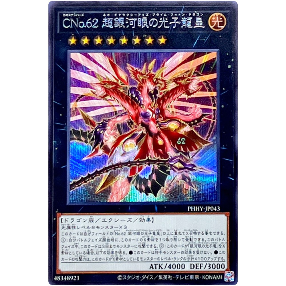 Set: Photon Hypernova Material: Paper Card Name: Number C62: Neo Galaxy-Eyes Prime Photon Dragon Country/Region of Manufacture: Japan Game: Yu-Gi-Oh! TCG Vintage: No Card Size: Standard Finish: Foil Character: Number C62: Neo Galaxy-Eyes Prime Photon Dragon Card Number: PHHY-JP043 Custom Bundle: No California Prop 65 Warning: No Problem Card Type: Effect Xyz Monster Age Level: 6+ Language: Japanese Manufacturer: Konami Rarity: Secret Rare