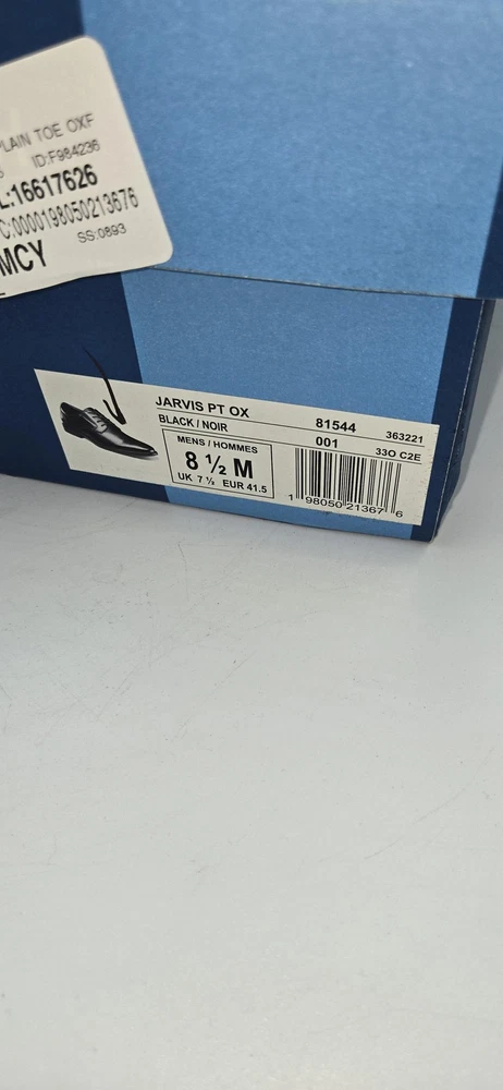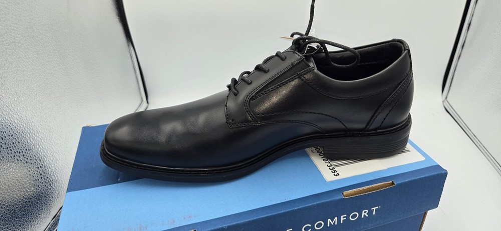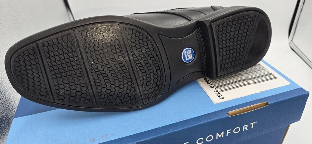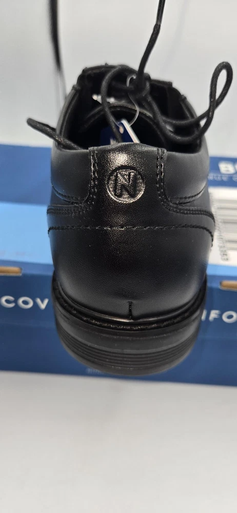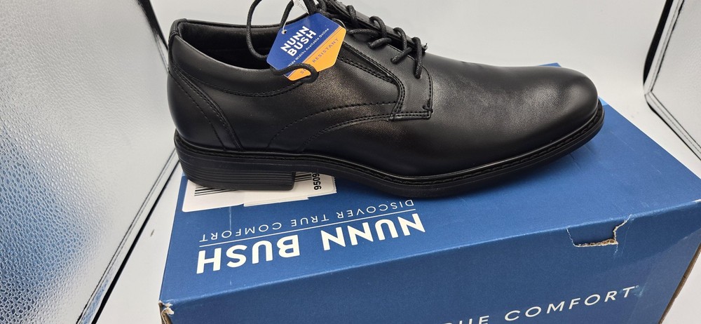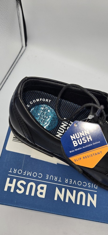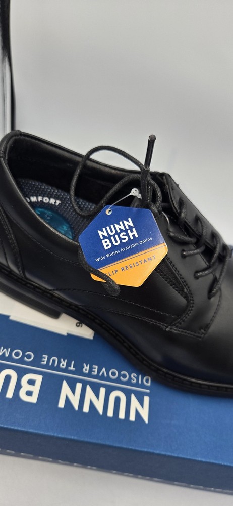 Brand: Nunn Bush Style: Jarvis PT OX mens lace-up oxford dress shoes with plain toe. Color: Black Size: Mens US 8.5 Medium; UK 7.5; EUR 41.5 (per box label). Style/Model code: 81544-001 (additional code 363221 33Q C2E). UPC: 198050213676 Materials: Smooth black leather upper with padded collar and textile lining; rubber outsole. Details: Comfort Gel E.Comfort cushioned insole, slip resistant outsole, low stacked-style heel, lace-up closure, subtle N logo embossed at heel, dress shoe design suitable for work or formal wear. Original Nunn Bush box included.
