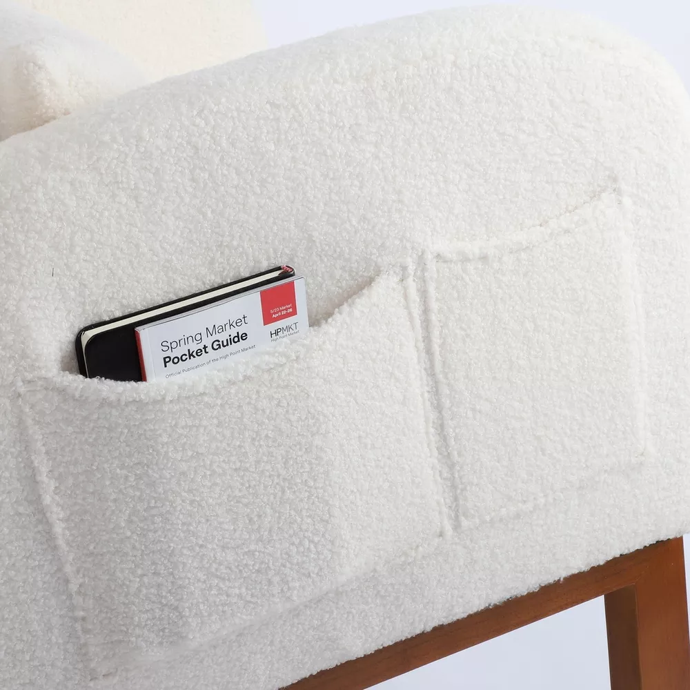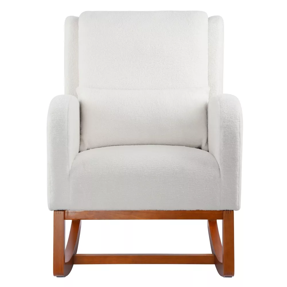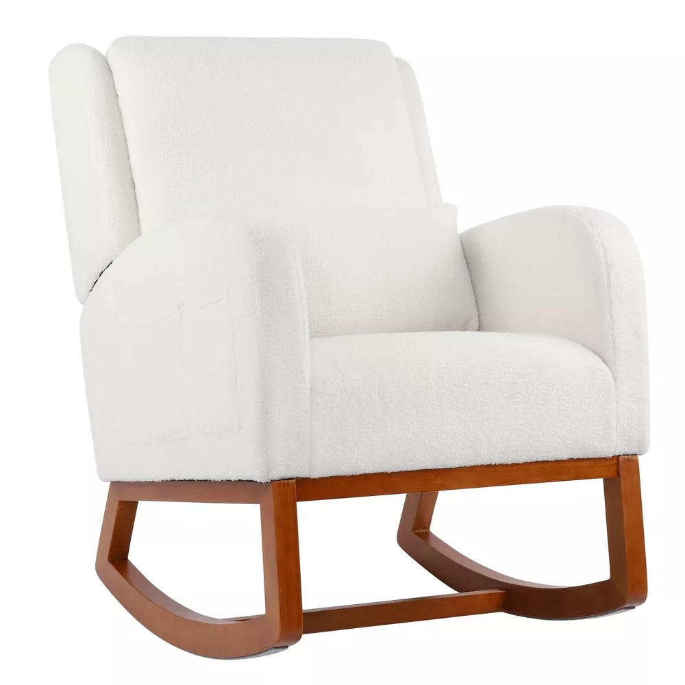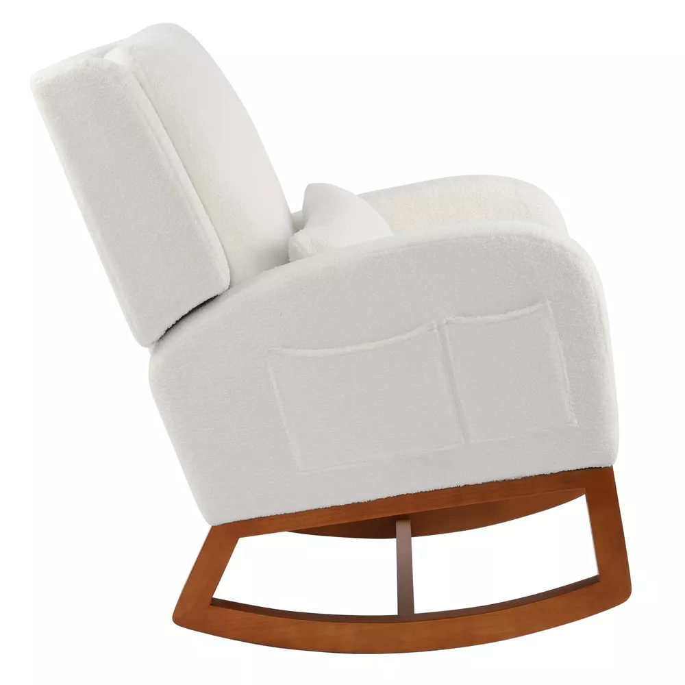 Complete your home with a modern upholstered rocking chair nurseryKarl home lounge glider armchair not only works functionally but addsexquisiteness to your space and creates a home feeling and elegantvibes. Ergonomically designed, an accent nursery rock brings a place toget more comfort while watching videos, playing games, reading booksor relaxing in front of the fireplace, Performs well in the bedroom, livingroom,nursery room, balcony, porch, apartment. etc.Features: Robust and Long-lasting: This rocking chair is made of high quality flannelette fabric with a breathable and easy to maintain surface. Its sturdy frame, made of rubber wood, ensures excellent durability. This rocking chair is also a good baby chair, it is perfect for the mother holding the baby sitting in the rocking Free Shipping Over $49.99* Details Nursery Rocking Chair High Back Armchair with Side Pocket Rubber Wood Legs and Product Description: Complete your home with a modern upholstered rocking chair nurseryKarl home lounge glider armchair not only works functionally but addsexquisiteness to your space and creates a home feeling and elegantvibes. Ergonomically designed, an accent nursery rock brings a place toget more comfort while watching videos, playing games, reading booksor relaxing in front of the fireplace, Performs well in the bedroom, livingroom,nursery room, balcony, porch, apartment. etc. Features: Robust and Long-lastingThis rocking chair is made of high quality flannelette fabric with a breathable and easy to maintain surface. Its sturdy frame, made of rubber wood, ensures excellent durability. This rocking chair is also a good baby chair, it is perfect for the mother holding the baby sitting in the rocking chair Overall Dimension26.8"W x 37.4 "D x 37.4"H. The cushion is 6.3 inches thick. The seat height (not including seat thickness) is 9 inches. (Please refer to figure 2 for specific dimensions) Side Pocket DesignThis rocking chair has two pockets on one side of the armrest to provide storage space. You can put recently read books and magazines in a large pocket on one side, and the TV remote control and cell phone in another small pocket Comfort and RelaxationFor unparalleled comfort and relaxation, this casual rocking chair not only has a large soft thick pillow, but also a small waist pillow. It allows for a gentle and smooth rocking motion, creating the perfect space to relax and relieve the fatigue of the day Easy AssemblyAll necessary hardware and accessories are included. The chair can be easily installed according to the instructions in the manual. If you have any questions about this rocking chair, please feel free to contact us