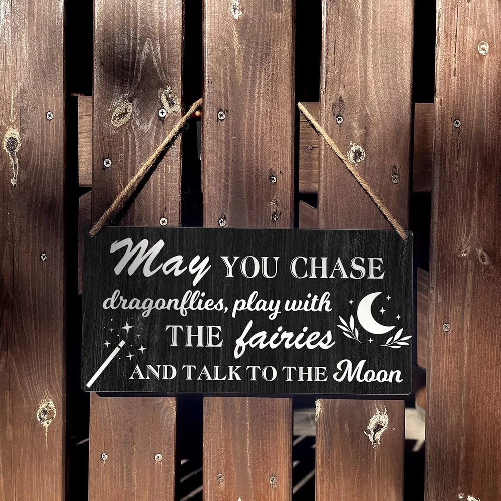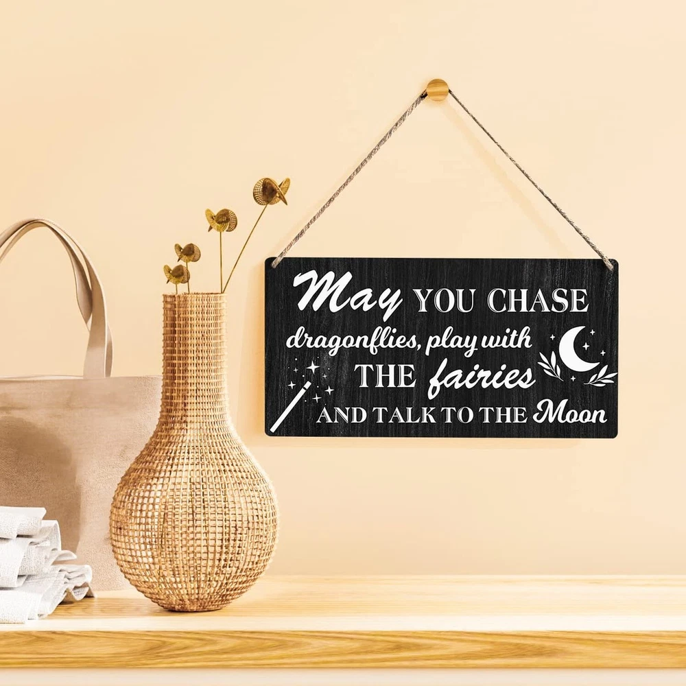 Nursery Sign Gift Farmhouse May You Chase Dragonflies Play with the Fairies Wooden Hanging Sign Plaque Rustic Wall Art Decor for Home Decoration 12 x 6 Inches Product Details Color: may Brand: Qious MPN: decorative plaque UPC: Does not apply EAN: Does not apply Color: may Brand: Qious Material: Engineered Wood, Wood, Ceramic Theme: Funny Recommended Uses For Product: Office Mounting Type: Wall Mount Product Dimensions: 12"L x 6"W Shape: Square Item Weight: 200 Grams Style: Versatile Pre-printed: May you chase dragons, play with the fairies and talk to the moon. Included Components: Pre-cut hanging holes, Twine Item Weight: 7.1 ounces Manufacturer: Qious Country of Origin: China Item model number: decorative plaque Sign Size:Measures approximately 6"x12". Premium Wood Sign: Made from compressed wood raw material MDF. Each sign has 2 pre-cut hanging holes and a length of twine. It is an attractive and versatile country style. Easy Hanging: Installation is extremely easy. Comes with hanging holes and twine so it's ready to hang. Attractive Appearance: This meaningful decoration is suitable for someone who means something to you. Funny signs will make the recipient smile. Natural wood rustic sign, with excellent texture, can hang beautifully. For Gift Giving:Our wooden signs are the perfect gift for loved ones or as a special treat for yourself. It works great, looks great and adds fun to any space in the home, office, classroom, kitchen, bathroom, study, and more. For Gift Giving:Our wooden signs are the perfect gift for loved ones or as a special treat for yourself. It works great, looks great and adds fun to any space in the home, office, classroom, kitchen, bathroom, study, and more.