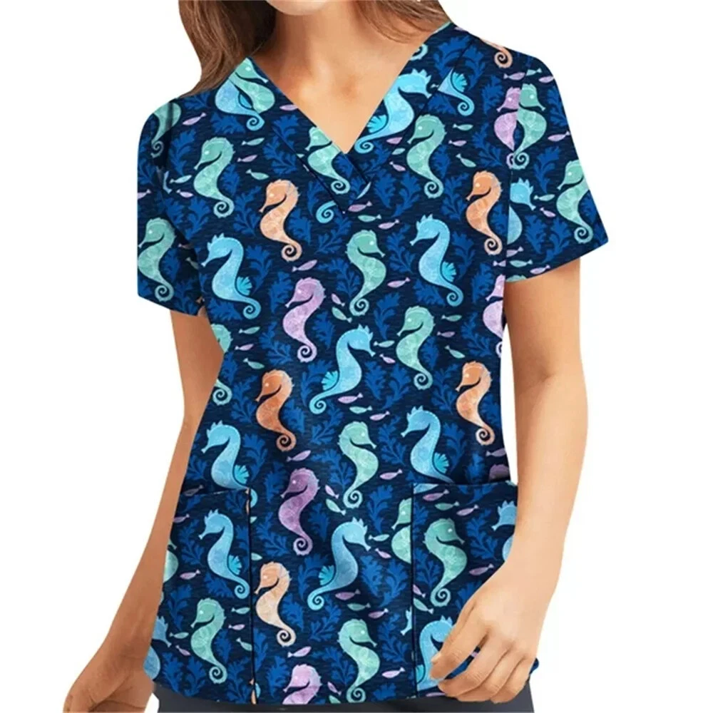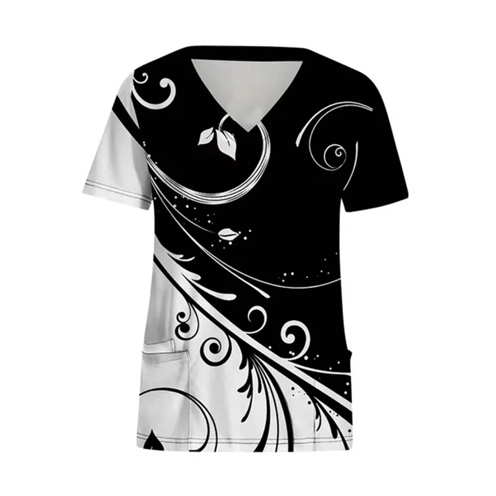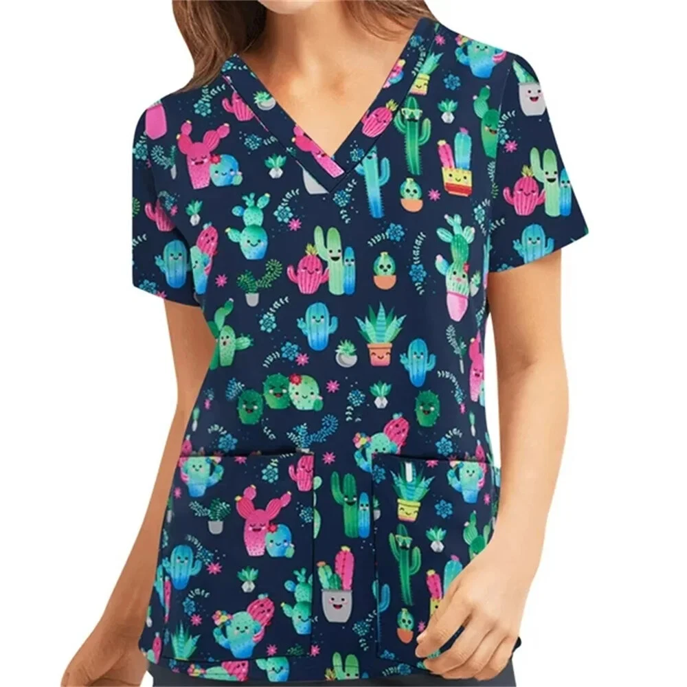 Nursing Uniform Woman Clothes Scrub Top with Pocket Floral Printed V-Neck Blouse