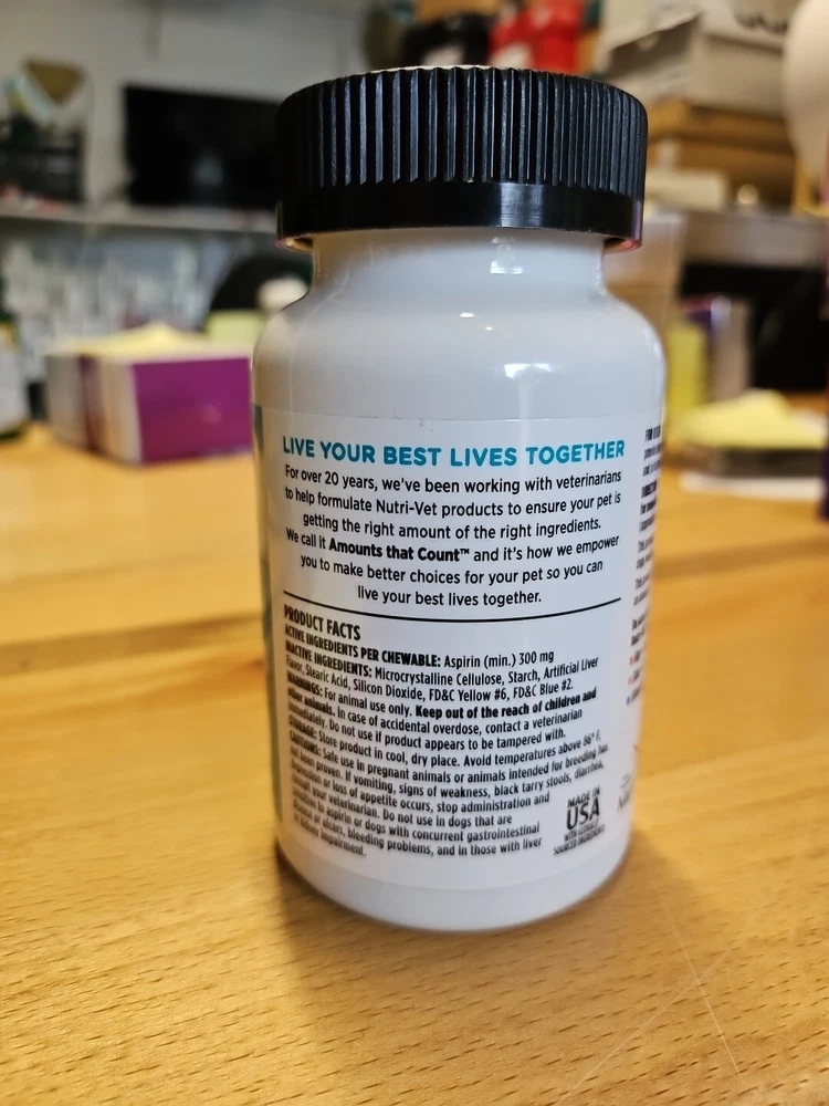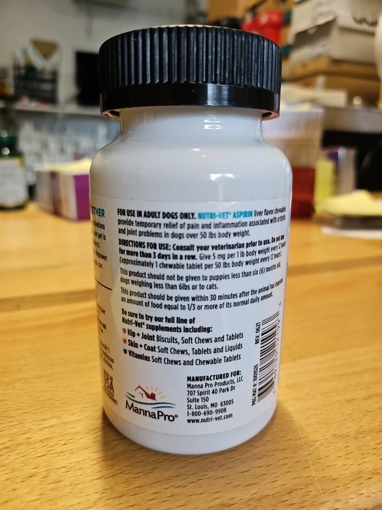 Nutri-Vet Aspirin for Pain and Inflammation is a chewable tablet that provides pain relief for dogs of all sizes and life stages. With a count of 75 tablets and a dosage of 300 mg, this medication is perfect for senior, adult, and puppy dogs who are experiencing pain and inflammation. Made by Nutri-Vet, a trusted brand in the pet care industry, this medication is designed to provide optimal pain relief without causing any unnecessary discomfort. The Nutri-Vet 02-04/26 model is made in the United States and is ideal for dogs who are in need of pain relief. This medication is classified under the categories of Vitamins & Supplements, Health Care, Dog Supplies, and Pet Supplies. Give your furry friend the gift of pain-free living with Nutri-Vet Aspirin for Pain and Inflammation.