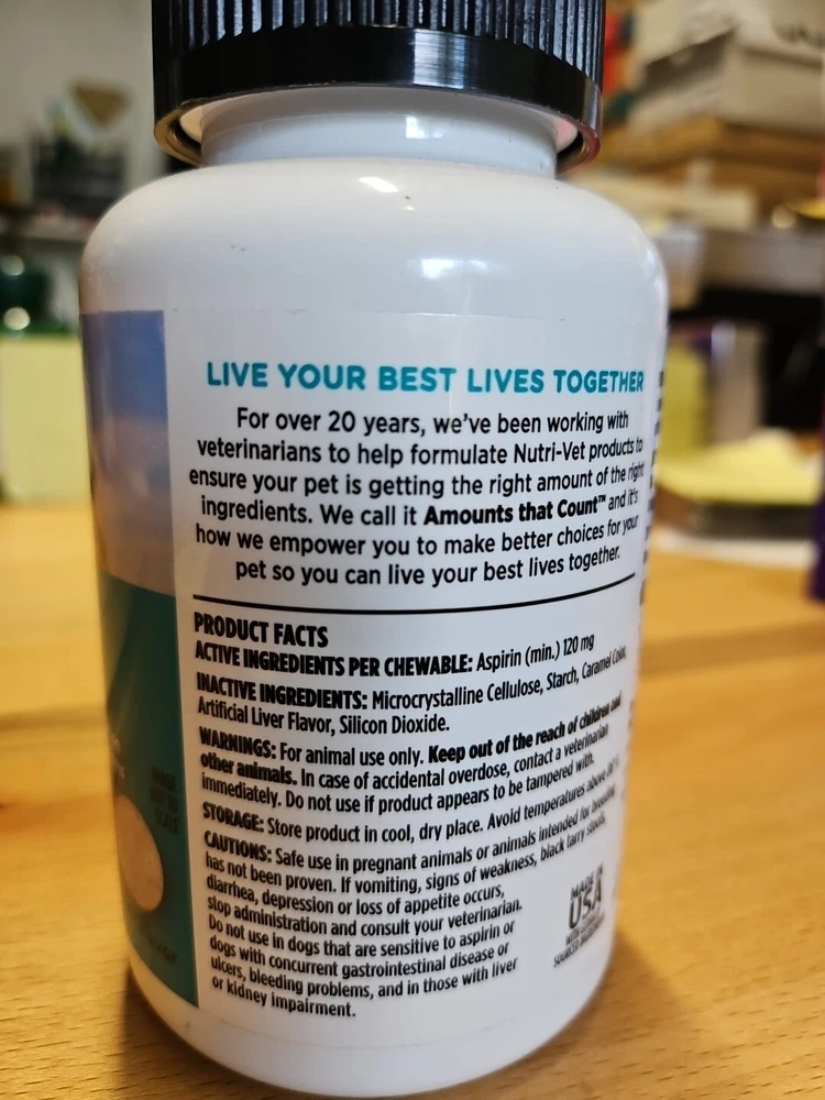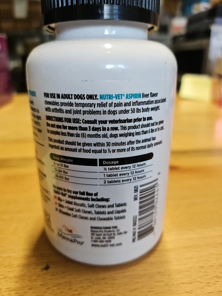 Give your furry friend the relief they deserve with Nutri-Vet K9 Aspirin Liver Chewables. These chewable tablets are perfect for small dogs and are designed to relieve pain and inflammation. With a count of 100 chewables and 120 mg of aspirin each, these tablets are formulated to provide your pet with the necessary dosage to feel comfortable and healthy. The Nutri-Vet K9 Aspirin Liver Chewables are made in the United States and are suitable for adult dogs of any breed. These tablets come in a flavor of liver and are an excellent addition to your pet's health care routine. The custom bundle includes no additional items, and the product is sold as a single item.