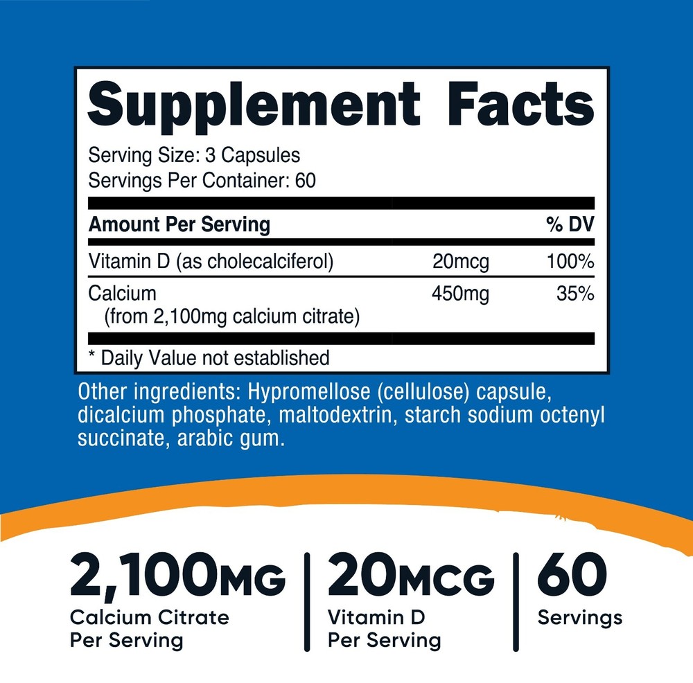 Welcome to the official eSupplements eBay store! Nutricost Calcium Citrate + Vitamin D Supplement (2,100mg) 180 Capsules - 20mcg of Vitamin D, 60 Servings Contains 180 vegetarian capsules per bottle, providing a full 60 servings for long-lasting use Each serving includes 2100mg of Calcium Citrate and 20mcg of Vitamin D Calcium Citrate is a form of calcium known for good absorption with Vitamin D to support calcium utilization GMO-free, Gluten-free, and Vegetarian – suitable for various dietary needs Manufactured in an NSF Certified, GMP Compliant, FDA Registered Facility High Quality Calcium Citrate + Vitamin D! Q. What are your shipping rates for the US? A. We offer Free Domestic shipping. Q. Do you offer international shipping? A. Shipping & Handling International: We have fast international shipping available to most countries. Rates may vary by location and order size. International customers (anyone outside the U.S. - including Canada & US protectorates) should be aware of and are responsible for all additional fees associated with duties, taxes, customs, and other costs incurred from shipping internationally. Your purchase includes courier fees only ***Please be aware it is against U.S. Law to underestimate the value of your package on the customs form. ***Please be aware we will not refund any international package that is refused. These additional costs vary depending on your location. Please refer to your local customs office to estimate these fees. ***Attention Alaska & Hawaii Customers Shipping may take up to 4-5 Business days
