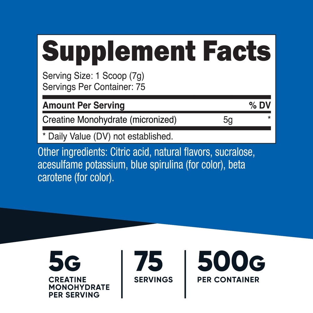 Welcome to the official eSupplements eBay store! Nutricost Creatine Monohydrate Powder (Coastal Explosion, 500 Gram) - Micronized Creatine Supplement - Vegan, GMO-Free, Gluten Free 100% Pure Creatine Monohydrate by Nutricost Elevate your training with Nutricost Micronized Creatine Monohydrate – Coastal Explosion. Each bottle contains 500 grams of high-quality, micronized creatine monohydrate, delivering 5 grams per scoop. This refreshing Coastal Explosion flavor mixes smoothly and can be enjoyed before, during, or after your workout. Like all Nutricost products, it’s crafted with premium ingredients and manufactured in a GMP-compliant, NSF-certified FDA-registered facility, ensuring quality and purity in every serving. Support Explosive Energy and Power Premium Micronized Creatine Monohydrate in refreshing Coastal Explosion flavor 500 grams of creatine monohydrate per bottle 5 grams per serving (convenient scoop included) Ideal for use before, during, or after workouts Manufactured in an NSF Certified, GMP Compliant, FDA Registered Facility Only 100% Pure Creatine Monohydrate No other binders or fillers, just pure creatine to give you the best absorption and best results! Q & A Q. How does Creatine Monohydrate work? A. Creatine, found in skeletal muscle as creatine phosphate, provides an inorganic phosphate to resynthesize ATP (energy) during high intensity activities. By increasing ATP production, creatine monohydrate helps to buffer changes in muscle acidosis and spare glycogen utilization, improving strength, muscle growth, and endurance. Q. Is Creatine Monohydrate safe for anyone to take? A. Creatine Monohydrate is safe for most people when used at recommended doses. Not enough is known about the use of creatine during pregnancy and breastfeeding to know if it is safe. Don’t use creatine if you have a kidney disease or diabetes. Q. How should I take Creatine Monohydrate? A. During the loading phase day 1 through 5, take 1 scoop four times daily. During the maintenance phase from day 6 forward, take 1 scoop daily. For best results, consume 1 scoop with 8-12 ounces of water or juice. Drink 8-12 glasses of water daily. Q. Will Creatine Monohydrate cause any side effects? A. Creatine is a combination of three natural amino acids and is found within the body. When used as directed, Creatine Monohydrate does not typically cause negative side effects. When taken in excessive doses, it may cause stomach pain, nausea, diarrhea, and muscle cramping. Q. Are there any warnings associated with this product? A. Do not exceed the recommended dosage. Despite being clinically proven to be safe, creatine, like many substances can be harmful if too much is consumed. Other than that, there is nothing to worry about when taking this product. Q. How fast will I see results? A. Everyone’s body is different. Some may see results in as little as a few days, while others will see results in a week or so. If you have an active workout regimen and solid diet, you will see results faster. Q. What are your shipping rates for the US? A. Shipping & Handling Domestic: Fast 2-5 business days shipping is 100% FREE Q. What are your international shipping rates? A. Shipping & Handling International: Expedited shipping is available for most countries. Rates may vary based on location and quantity. International customers (anyone outside the U.S. - including Canada & US protectorates) should be aware of and are responsible for all additional fees associated with duties, taxes, customs, and other costs incurred from shipping internationally. Your purchase includes courier fees only ***Please be aware it is against U.S. Law to underestimate the value of your package on the customs form. ***Please be aware we will not refund any international package that is refused. These additional costs vary depending on your location. Please refer to your local customs office to estimate these fees. ***Attention Alaska & Hawaii Customers Shipping may take up to 4-6 Business days
