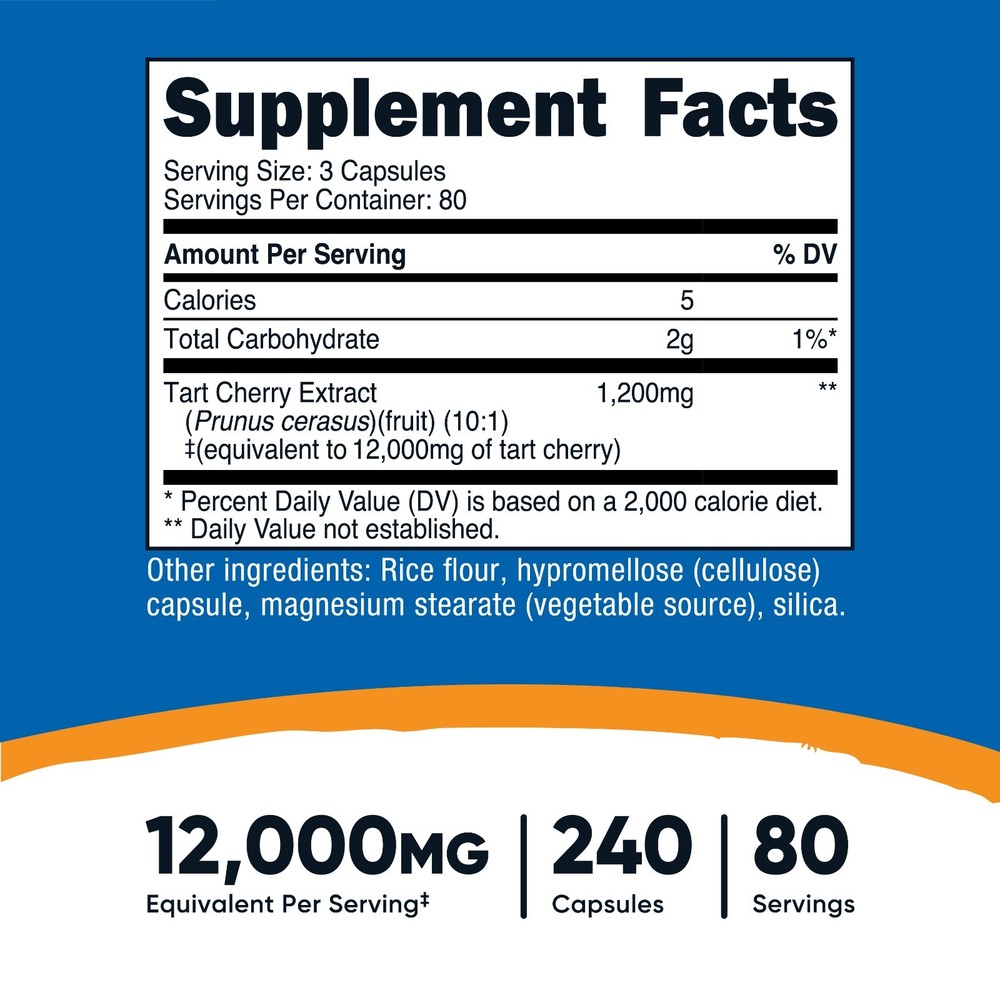 Features: Gluten Free, Non-GMO, Vegan Dosage: 12,000mg Equivalent** MPN: NTC-20477 Brand: Nutricost Formulation: Capsule Number of Pills: 240 Expiration Date: Approximately 2 Years Country of Origin: United States Active Ingredients: Tart Cherry Extract gtin13: 810139576433 Main Purpose: General Wellness UPC: 810139576433 Age Group: Adult Department: Unisex