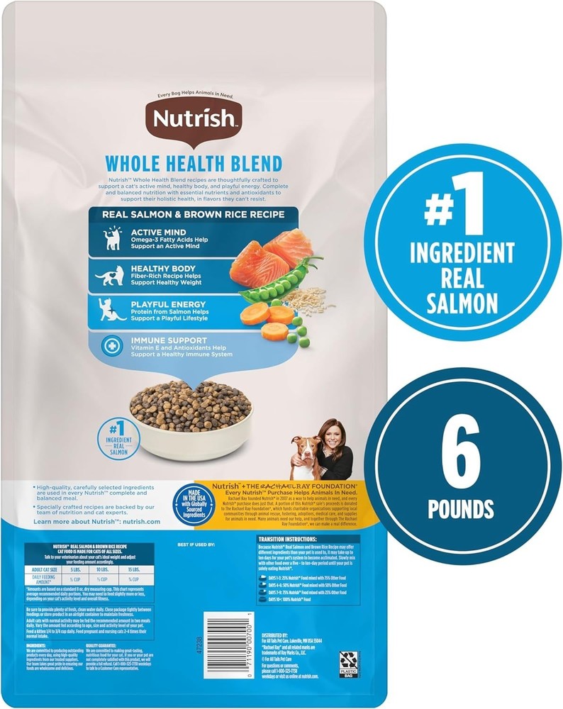 Contains one (1) 6-pound bag of premium dry cat food with real salmon and brown rice Real salmon is the #1 ingredient and a good source of protein that helps support an active mind Made with vitamin E and antioxidants to help support a healthy immune system Natural food for cats of all ages with added vitamins, minerals and other nutrients Every purchase helps support animals in need through The Rachael Ray Foundation