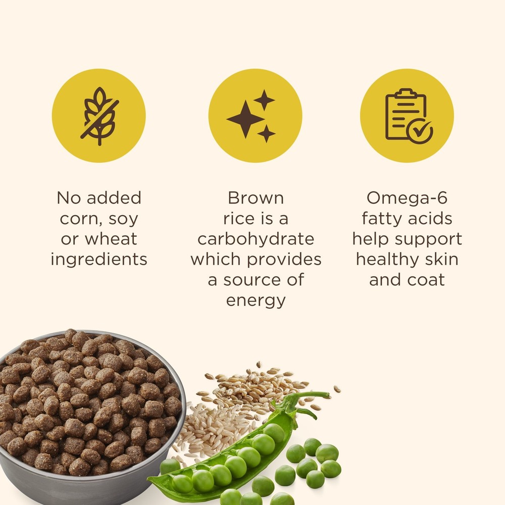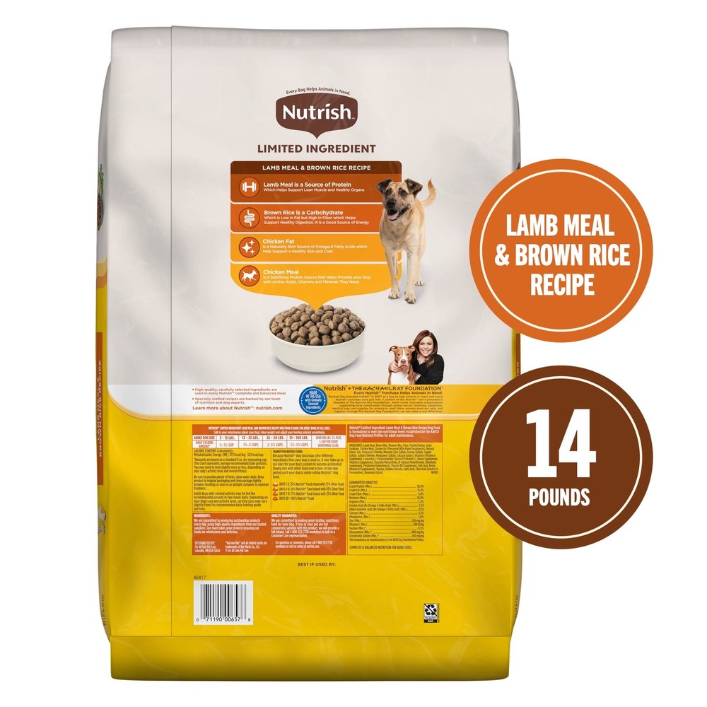 Nutrish Limited Ingredient Lamb Meal & Brown Rice Recipe Dry Dog Food is carefully crafted to keep things simple. This premium limited ingredient dog food features 8 essential macro-nutrient sources—lamb meal, brown rice, brewers' rice, peas, pearled barley, grain sorghum, chicken meal and chicken fat—with added vitamins and minerals to support your dog’s overall well-being. Lamb meal serves as a high-quality protein source, while brown rice and peas are easily digestible carbohydrates. Plus, chicken fat offers a natural source of omega-6 fatty acids to help promote healthy skin and a shiny coat. Contains one (1) 14-lb. bag of premium dry dog food with limited ingredients Lamb dog food made with 8 macro sources to provide balanced nutrition for the pickiest of eaters 8 macro-nutrient sources: lamb meal, brown rice, brewers' rice, peas, pearled barley, grain sorghum, chicken meal, chicken fat Limited ingredient, natural dry dog food for adult dogs with added vitamins, mineral and Taurine