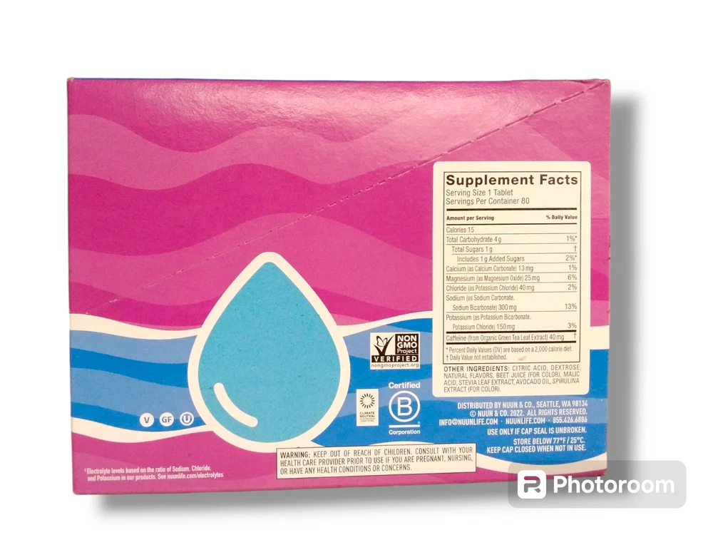 nuun Sport Hydration+Caffeine (Box of 8 Tubes of 10) A tasty & hydrating blend of electrolytes for exercise and on-the-go. Looking to stock up? Nuun Sport is an Electrolyte-Rich Sports Drink Tablet, enhanced with electrolytes and bursting with delicious fruity flavor. Mix with water for a hydrating beverage to keep you powering through your next workout Packed with electrolytes to replenish those lost during activities Nuun’s Drink Tablets use no artificial flavoring or sweeteners (sweetened with high-quality Stevia only) and are keto-friendly. Nuun Sport is designed with optimized electrolytes and Non-GMO ingredients for clean, guilt-free hydration At first look, you’ll notice Nuun Sport’s snazzy packaging makeover. We hope that our new look will help to better identify the Nuun product that’s right for you