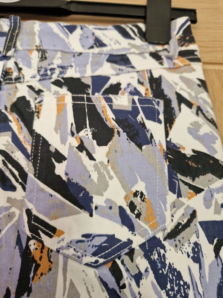 This is a pair of blue print canvas jeans in size Small 8/10 by the brand Sophyline. The jeans feature a geometric pattern, a zip closure, and a high rise waist of 28/30 inches. Made of cotton and elastane fabric with a medium wash, the slim-fit jeans have a skinny style and come with a 5-pocket design. They offer a slimming effect, stretch, and are machine washable, making them suitable for all seasons.