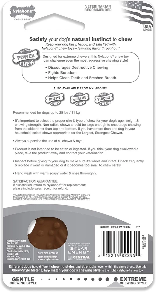 Nylabone Power Chew Textured Bone Small/Regular (1 Count), Product Details Item Weight: 0.16 ounces Department: Pet Supplies Manufacturer: Central Garden & Pet Country of Origin: USA Item model number: NCF302P Item Package Dimensions L x W x H: 6.77 x 3.62 x 0.67 inches Item Dimensions LxWxH: 4.88 x 0.63 x 1.38 inches Item Weight: 0.01 Pounds Brand Name: Nylabone Target Audience Keyword: dogs Country of Origin: United States Model Name: Nylabone Power Chew Textured Dog Bone Chew Toy Color: Textured Bone Size: Small/Regular (1 Count) Material: Nylon Age Range Description: All Life Stages Number of Items: 1 Style: Flavor Medley Flavor Breed Recommendation: Small Included Components: Nylabone Power Chew Groove Bone - Dog Toys for Aggressive Chewers - Durable Dog Toy for Small Breeds - Small Dog Chew Toys - Flavor Medley, Small, Up to 25 Ibs. (1 Count) Specific Uses for Product: Chewing Is Discontinued By Manufacturer : No Product Dimensions : 4.88 x 0.63 x 1.38 inches; 0.16 ounces Item model number : NCF302P Department : Pet Supplies Manufacturer : Central Garden & Pet Country of Origin : USA GROOVES & NUBS HELP CLEAN TEETH - Textured dog chew toy helps reduce plaque and tartar FOR EXTREME CHEWING STYLES - This strong dog toy for aggressive chewers is designed with our toughest material DOG TOY TO KEEP THEM BUSY & HAPPY - This dog toy for boredom encourages healthy, non-destructive chewing habits while safely satisfying dogs’ natural urge to chew MADE IN THE USA - This dog chew toy is proudly made in New Jersey TRUSTED CHEW TOYS WITH HEART & PURPOSE - Every chew toy’s unique shape, individual texture, and gotta-have-it flavor is created with purpose and love to give your dog what they need, when they need it! IRRESISTIBLE FLAVOR MEDLEY - Made with enticing flavor infused throughout FOR SMALL DOGS - Up to 25 pounds CHEW TOY DIMENSIONS - Measures 4.5" long x 1 " wide x 1.75" high ABOUT POWER CHEW TOYSMade from our toughest nylon material, Power Chew toys challenge even the most extreme chewing styles! These durable dog chew toys for aggressive chewers come in many different shapes and enticing flavors to discourage destructive chewing, help clean teeth, and simply keep dogs happy!TEETH-CLEANING GROOVES, LONG-LASTING FUN!Satisfy your dog’s natural instinct to chew with the Power Chew Groove Bone! This fun, tough chew toy for dogs features grooves and nubs that help reduce plaque and tartar for a fresher smile. Designed from our toughest nylon material, this super chewer dog toy stands up to long chew sessions! Plus, its tasty flavor throughout will keep your heavy chewer wanting more. Made with heart and purpose, this veterinarian-recommended chew toy for small dogs is sure to make your power chewer a happy dog! NYLABONE CHEWS BESTWhat your dog chews matters! With destructive behavior among the leading reasons dogs are returned to shelters, we know healthy habits can make a life-changing difference. For 70 years, our family-founded brand continues to safely satisfy dogs’ chewing instincts and help them stay in loving forever homes!GUARANTEED YOUR DOG WILL LOVE IT Before we introduce new dog products to furry friends and pet parents everywhere, we make sure our very own dogs love them first! If you’re not happy with your Nylabone chew toy for any reason, simply return it to us with the sales receipt for your money back. Or, reach out to our Consumer Care team so we can help make it right (and talk about how much we also love our dogs).