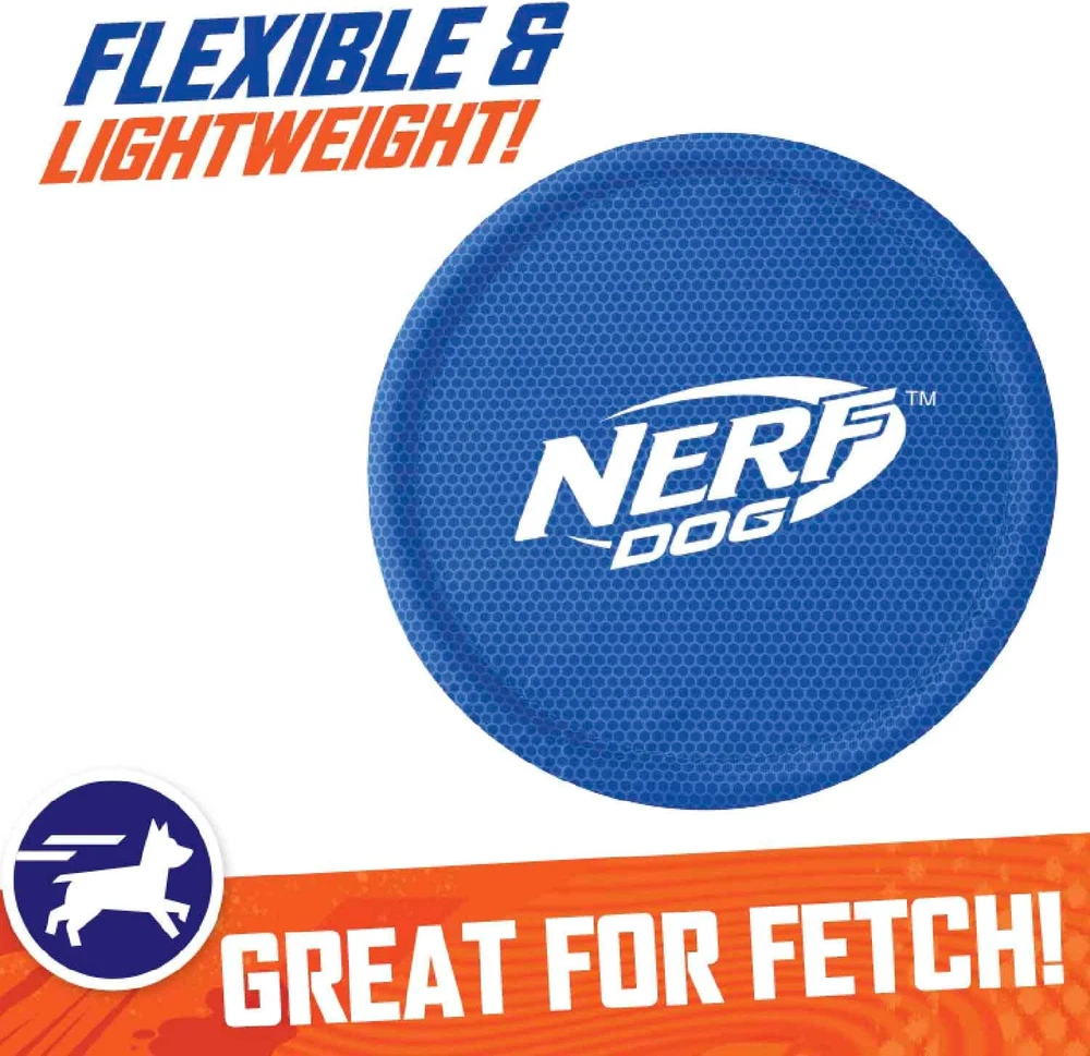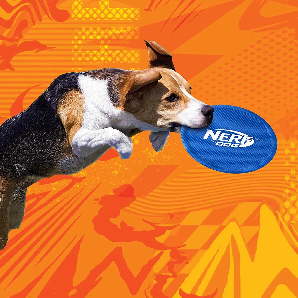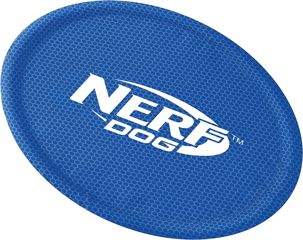 NERF-TOUGH: Nerf-quality materials make our Nylon Flyer Toy perfect for fetch and for teaching your dog new tricks HIGH VISIBILITY: The bright blue nylon flyer is easily trackable for both you and your pet, no matter where or how far you toss it MADE TO LAST: Lightweight, durable, and weather & water resistant, the flyer is the perfect toy to take to the lake, beach, or pool FOR MEDIUM AND LARGE BREEDS: Lightweight and flexible flyer is ideal for medium and large breeds SAFETY FIRST: Designed with you dog's safety in mind, each of our dog toys are tested to ensure endless hours of family fun Product Description Bring your flying disc game to the next level with the Nerf Dog Nylon Flyer Dog Toy. Get ready for high-flying action and non-stop fetch with this flyer! This disc floats in the water so you can bring it to the beach, lake, or pool for added fun. If you’re training your dog for dock diving, this adds a fun twist to training! This flying disc is soft yet rugged construction also makes it unsinkable and features nylon with a tear-resistant coating. It’s 9-Inch in diameter, making it perfect to toss or play a tug game with your dog. From the Manufacturer The Nerf Dog Nylon Flyer is great for interactive play with your dog. The Nerf Dog Nylon Flyer is a flying disc is with tear-resistant coating. This flying disc also floats and great for water and diving dogs. Its soft yet rugged construction also make it unsinkable. 10 inches in diameter. Available in various colors.