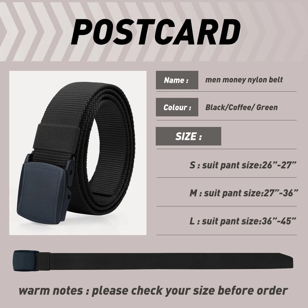 Description Superior Material: -Resisting nylon material that has a strong evaporation of sweat, more comfortable and breathable, feel more flexible. Adjustable Size: -Removable automatic Buckle,no holes in belt. -If the Strap is too long for you, you can trim the strap length to fit your size. Nickel free plastic buckle: -Non-metallic buckle for easy, quick clearance at security checkpoints. This Nylon Belt Suitable For Any Occasion Adjustable plastic buckle can easily match with jeans, casual pants, outdoor sports pants. Not only used for daily wearing, but also a good partner for outdoors sports ,hunting and shooting,etc. ➤Keep You Cash Safe from Pickpockets Money belt - Equipped with an easy-to-use hidden zippered security pocket. Safely conceals spare currency, a paper passport copy, and important travel documents from thieves. Airport Safe & Invaluable for any trip. Always be prepared for unexpected events during your travels. ➤Men Nylon Belt Fit Any Occasion - The width of these simple nylon belt is 1.5inch. Lightweight Belt, Quick Dry, Comfort Nylon material Strap with Plastic Buckle suitable for your outdoor sports (Hiking Belt, Ski Pant Belt, Snow Pants Belt, Climbing Mountains, etc), military uniforms matching and quickly passing security checkpoint. The most commonly wearing is daily wearing Best matching your slacks or jeans. ➤Men Nylon Nickel Free Tactical Belts - Nickel free international standard plastic buckle, feel comfortable and easy to wear. Ideal for police, firefighters, CCW, security guards, electricians and utility workers in need of a great duty belt to carry tools or weapons. Also great for paintball and airsoft gear! Attention the strap is No elastic. ➤Durable Design Money Webbing Belt - Made from quality nylon webbing and sturdy YKK plastic buckle. Provides you with a hassle-free airport security experience. Fully adjustable for Men and Women. ➤Precisely Size Choose and Considerate Service - If the strap is too long for you, you can trim the strap length to fit your size. You can also secure the excess the nylon belt tail with the loop.Considerate after-sale service on any question of these nylon web belts.