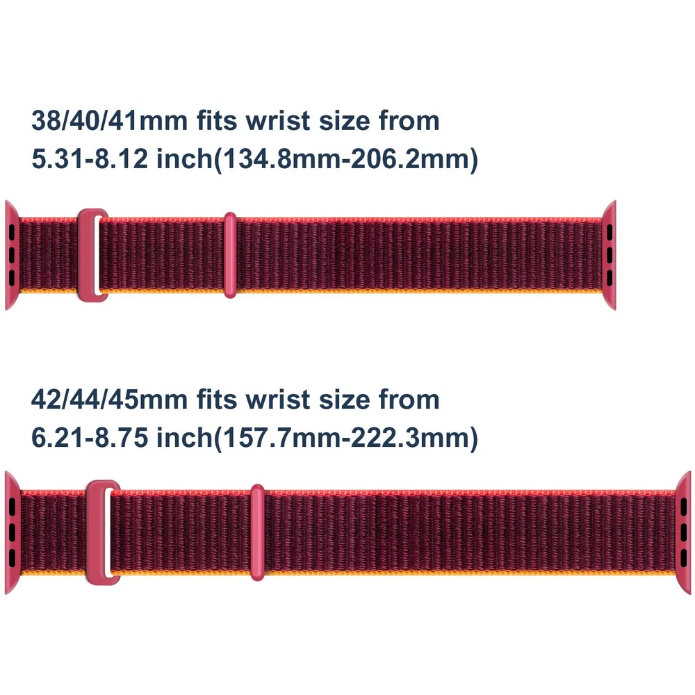Patents Pending!Newest Design: Our sport loop nylon bands for Apple watch has 3 powerful to keep your iwatch casing stays securely in place on wrist without sliding around,adjusts size easily, easy to put on and remove from wrist. Compatible Models: nylon sport loop iWatch band compatible with Apple watch Series 10/9/8/7,Series 6,Series 5,Series 4,Series 3,Series 2,Series 1,Series SE,iwatch 38mm 40mm 41mm 42mm 44mm 45mm 46mm.suitable for all women and men.NOTE:38mm/40mm/41mm/42mm(Series 10) suitable for wrist from 5.31"-8.12"(134.8mm-206.2mm); 44mm/45mm/46mm/42mm(Series 3 2 1) fits wrist size from 6.21"-8.75 "(157.7mm-222.3mm). Premium Woven Nylon Material: Our strap wristbands for apple watch made of high quality nylon,wrist-friendly,soft,breathable,lightweight,washable,drying fast and easy to clean,The double-layer nylon weave provide soft cushioning while allowing moisture to escape. Multi-color Matching: Our nylon iWatch bands for women men has multiple color to choose,personalize your iWatch with these bands to fit your mood and dress in different occasions.It is an excellent gift for birthdays, holidays, Halloween, and Christmas,Thanksgiving Day, or holidays. Brand Concept: Good quality can definitely build a good reputation for us and increase user stickiness. Therefore, we have been committed to improving the quality of our iwatch bands. From production to inspection, we have devoted our efforts. Our watch straps have passed strict quality inspections.
