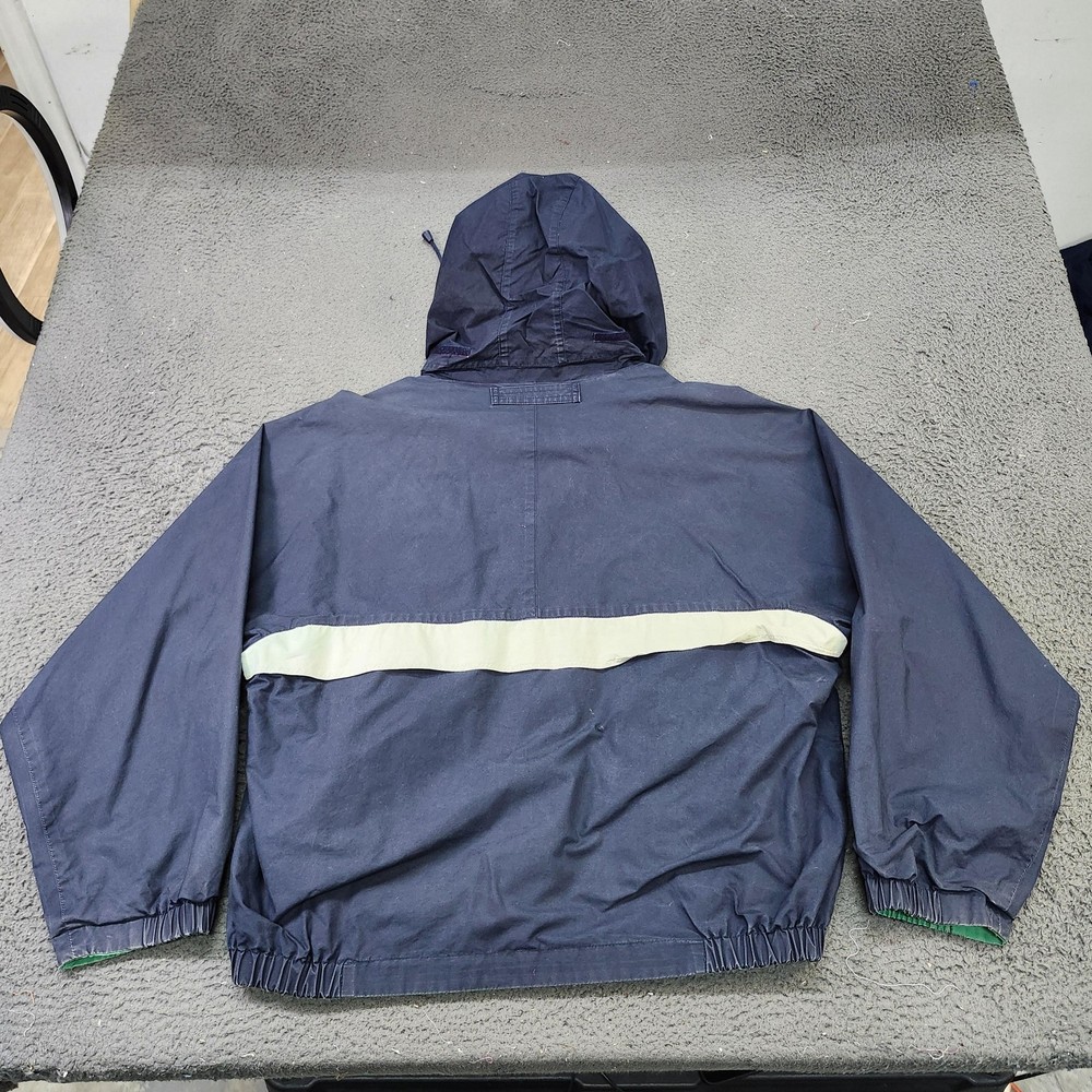 Style: Mens hooded nylon windbreaker jacket with full zip front and casual relaxed fit. Color: Navy blue outer shell with a wide off-white horizontal stripe across the chest and back and bright green lining. Size: Mens XL. Material: Lightweight woven nylon outer shell with smooth fabric lining for comfort and easy layering in transitional weather. Design details: Attached hood with drawcord, full-length front zipper with snap-button storm flap, and elasticized cuffs and hem for a secure fit. Storage: Two front hand pockets with vertical zipper closures to keep small items secure. Pattern and style: Solid navy body accented by a contrast stripe for a classic sport-inspired striped windbreaker look. Features and use: Hooded, lined windbreaker with elastic waist and zipped pockets, ideal for casual everyday wear, commuting, and light wind or drizzle in spring and fall seasons.