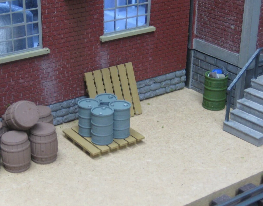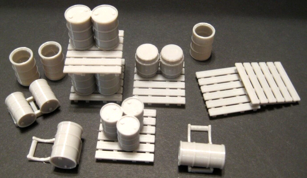 O GAUGE ASSORTED BARRELS, STANDS, PALLETS AND DRUMS Lot includes 18 assorted O gauge can include 30 and 55 gallon drums closed and opened, 6 heavy duty pallets and 3 barrel stands. These items will enhance any layout (see photos). The assortment of barrels and drums may vary from the photos. These are unpainted. Designed and 3D printed in the USA using top quality strong and long lasting PETG plastic. (Extra pallets for these Drums and Barrels can be purchased on Ebay) eBay item number: 175789707656 Shipping cost will be discounted and a refund given if more than one of any of my Ebay items can be shipped in the same carton. Shipped USPS First Class Mail