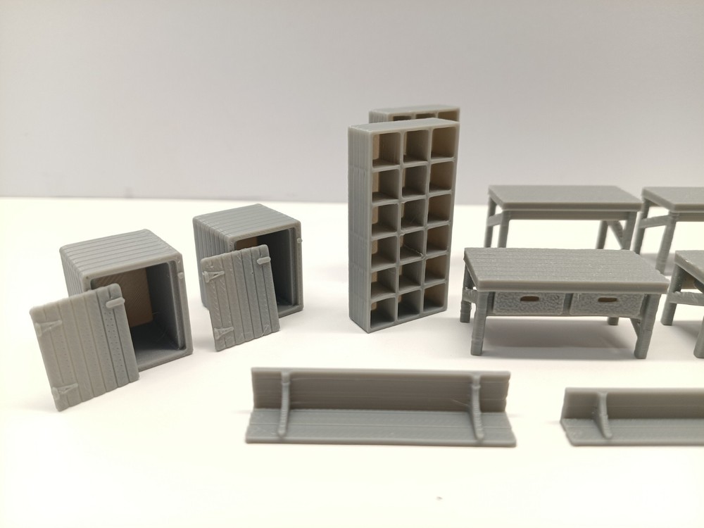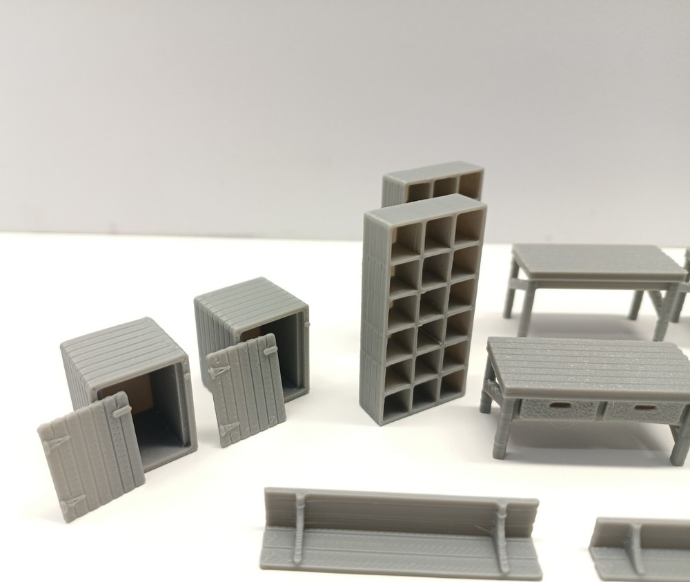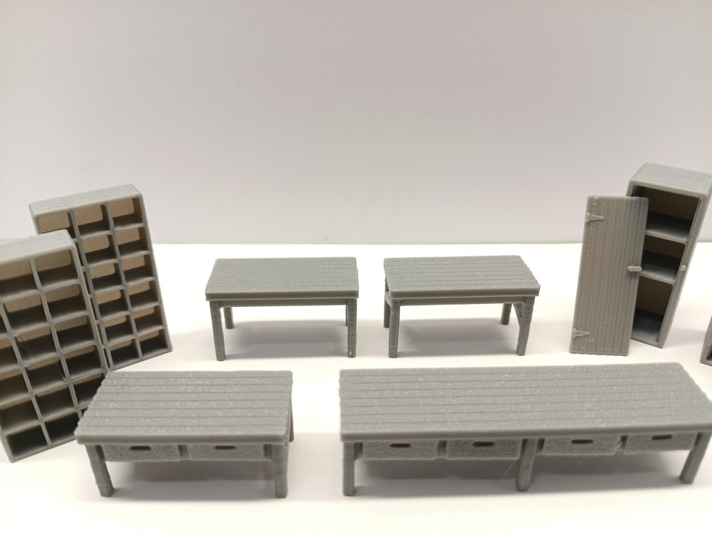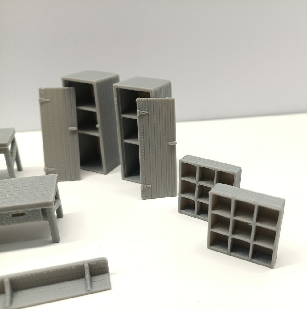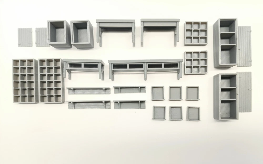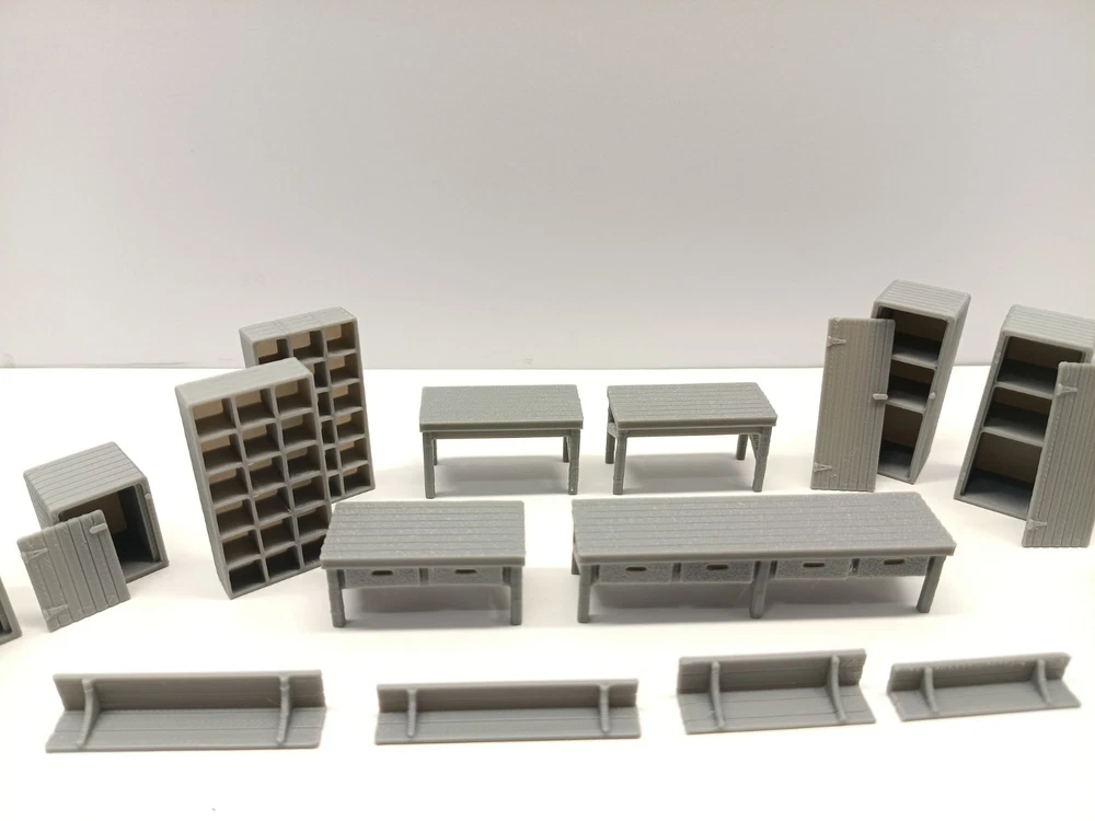 You are purchasing O Scale Workshop - Garage Furniture for your model railroad or diorama display. (Gray in color) These accessories come printed gray in color and are NOT painted. They can be used as is or feel free to paint as you wish to add realism to your display. Includes workbenches with opening drawers, small and large cabinets with doors, wall shelves and storage cubbies. The wall cabinet doors are not connected to the cabinets. They can be glued in the closed position as well as a partially open position if so desired in your display. These accessories were 3D printed in the United States with Gray PLA+ filament and is intended for indoor displays only. Condition: The items may show minor imperfections, layer lines and blemishes due to the 3D printing process. Painting: We recommend a light coat of gray primer to provide better adhesion when using acrylic water-based paints but enamel paints adhere very well to the filament as is. Please view all photos and ask any questions prior to making your purchase. Shipping: We ship via USPS Ground Advantage within one business day from payment being received. All items purchased before 2:00 p.m. eastern time generally ship the same day. Thanks so much and have a Blessed day!