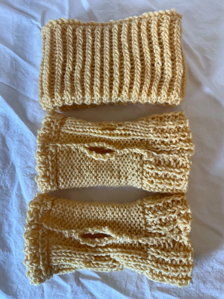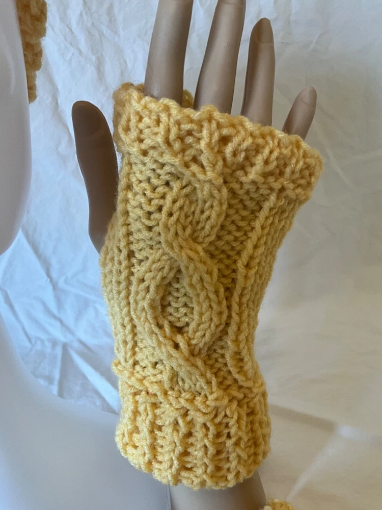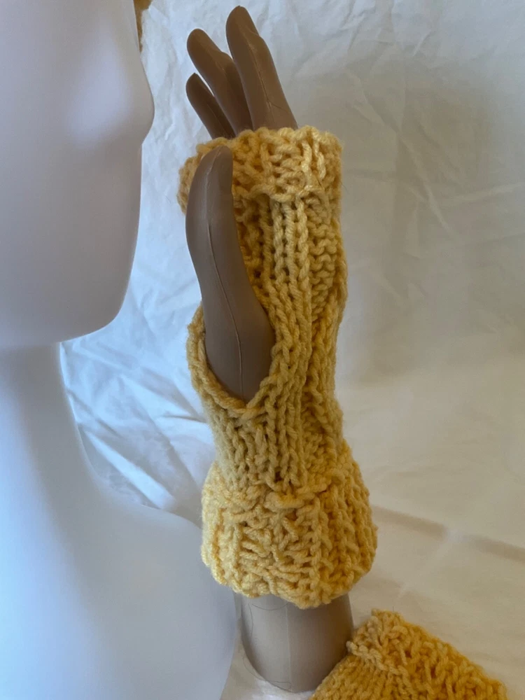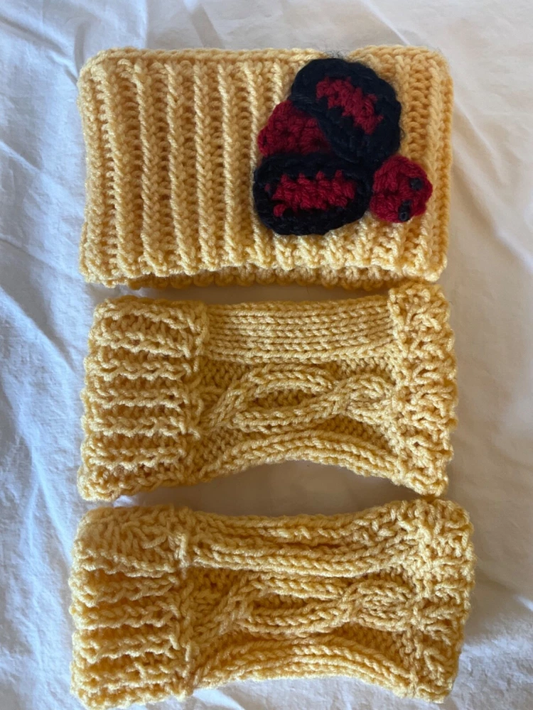 Original Design! OBD Handmade, Hand Knit Buttercup Yellow Snood/headband is too cute, and may also be worn as a cowl. It is fashioned double thick in the round for extra warmth—no seams to irritate skin—of a stretchy rib stitch, and features a red lady bug with black eyes and wing boarders, 4” x 14” circumference—stretches to 26” ONE SIZE FITS MOST. To complete your cozy look, the set ALSO includes a pair of wrist length (7” long, thumbhole placement between 2 1/2” and 3 1/2”) fingerless gloves, fashioned in the same 100% acrylic Buttercup Yellow, featuring double thick (8” circumference—stretches to 10”) cuffs and a cable motif. One size fits most. Manufactured in a smoke free environment. Both interior and exterior construction images shown. EASY CARE: Machine wash (lingerie bag recommended). Tumble dry. Do not bleach. Do not iron. Do not dry clean. Ships free domestic USPS.
