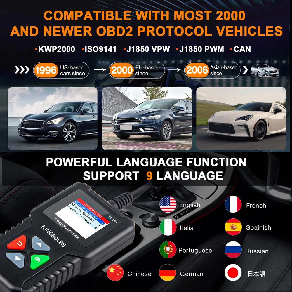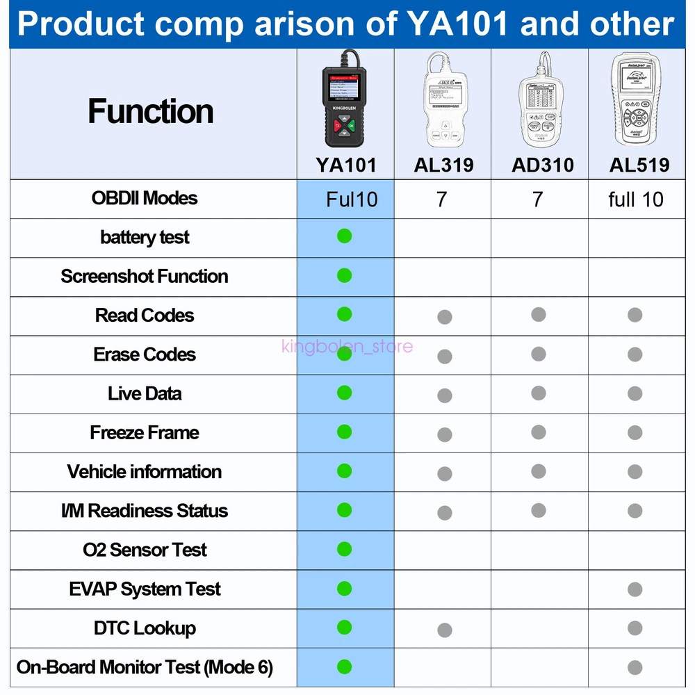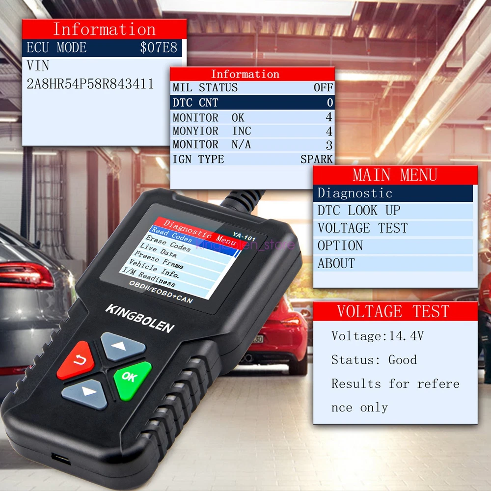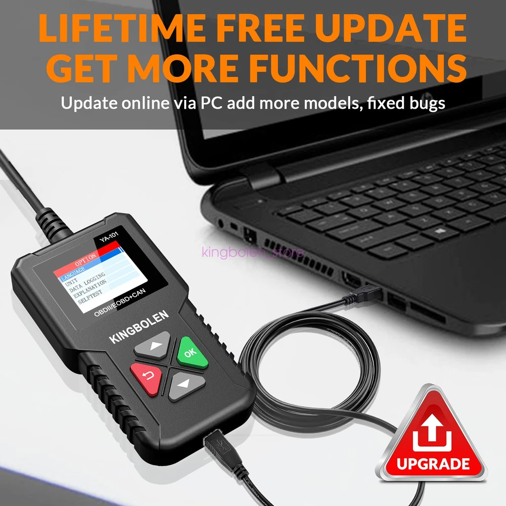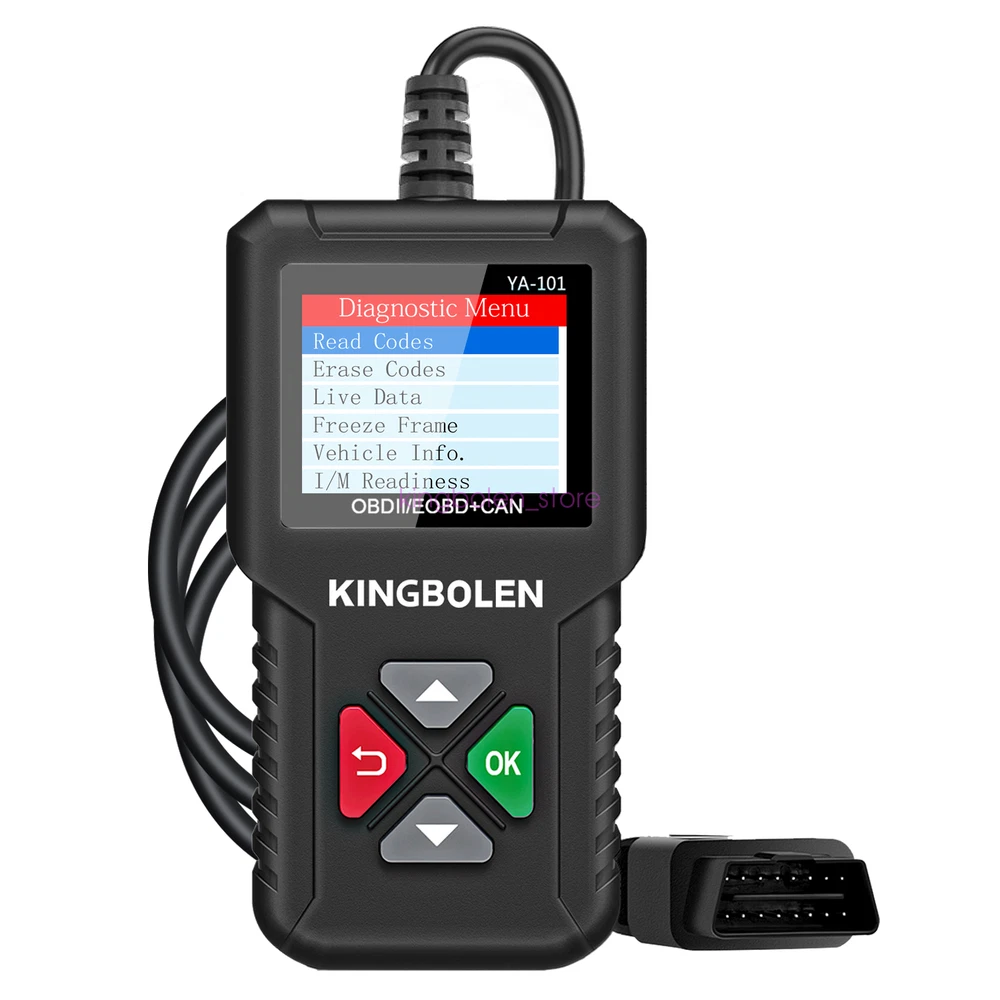 KINGBOLEN YA101 OBD2 Scanner Auto Diagnostic Tools OBDII EOBD Code Reader KW310 For 12V Car DiagnosIs [Key Reasons To Buy YA-101 ] Check Engine Light/Turn off MIL( Malfunction Indicator Light ) Help to Pass Vehicle Safety Inspection and Emissions Inspection Full OBDII Diagnostic Functions Advanced Mode6 On-Board Monitor Test and Mode8 EVAP Test/Compoment Test Battery Test Screenshot Display 9 Languages supported and Extensive Vehicle Coverage Lifetime Free Update (Note: UPDATE IS NOT NECESSARY before utilization. The YA-101 comes with 31.5 inch cable) YA-101 provides full OBDII/EOBD diagnostic functions and meets protocols such as ISO9141-2, ISO14230-4, SAEJ1850, and ISO15765-4. YA-101 is better than CR3001 and CR319.YA101 provides a permanent free upgrade service that can be quickly upgraded and free of drivers. YA101's mode 6 function is precise and perfect, not only can check the fault code, but also can find the cause caused by the fault code, and can carry out battery test.YA101 is your best choice. YA-101 Bullet Points: 【TFT Color Screen】 1.8 inch TFT true color display and high physical button design. 【Screenshot Display 】 Press and hold the up and down button for 3 seconds to quickly take a screenshot 【Full OBDII Diagnostic Functions】 Read & Clear DTCs, I/M Readiness Status, Read Freeze Frame and Data stream, Read Vehicle Information, O2 Sensor Test , On board Monitored systems Test (mode 6) , EVAP Test (mode 8) 【DTC Look Up】 Looks up definitions of DTCs stored in scan tool, and shows the possible causes of the DTC. (NOT every DTC with possible causes reason) 【Battery Testing】 Let you better know your car’s battery status. 【Extensive Vehicle Coverage】 Works on US vehicles from 1996 and newer,EU vehicles from 2000 and newer and Japanese vehicles from 2006 and newer. 【Support Multilanguage】 English,Chinese,France,Deutsch,Italian,Japanese,Espanish,Russian,Portuguese 【Lifetime Free Update】 No need to install drivers can be updated via USB, so you always have the latest car model data. 【Plug&Play】 Not require any battery, get the power directly from the vehicle when connecting vehicle’s DLC socket. 【Easy-to-carry】 Especially made for people who don't want bulky devices,e asily pack and carry it to anywhere. 【Cost-effective】 Within the price range of under $50, this scanner is a no-brainer decision. Featuring full OBD2 functions, easy operation, compact design etc. With a budget friendly price, it’s the best possible solution for any entry-level DIYers to perform basic car maintenance. Advanced Features: Check Engine Light Faster and in-depth scan the engine modules, it helps to find out the hiddened issue of the engine light.Focus on the important modes like read and clear codes, mode6 and mode8, you can easily to know the on-board monitor system and the evap system.You can also see the status of the misfire cylinder. FULL 10 OBDII Modes 1.Reading Codes: Show the detailed description of the Diagnostic Trouble Code (DTCs) 2.Erasing Codes & Reset: Turns off Check Engine Light (MIL), clears codes and resets monitors. 3.Data Stream : Reads and displays live ECU/PCM data stream, plotting functions graphically and stores freeze frame data. 4.I/M Readiness Status : Shows whether the various emissions-related systems on the vehicle are operating properly and are ready for inspection and maintenance testing. 5.Read Live Data Stream: Show the information of continuous data stream from a vehicle in live graphic (waveform) display. 6.View Freeze Frame Data: Check the certain vehicle conditions which are recorded by the on-board computer at the time the emission-related fault occurs. 7.O2 Sensor Test: Allows retrieval and viewing of O2 sensor monitor test results for the most recently performed tests from the vehicle’s on-board computer. 8.On-Board Monitor Test: Retrieves and displays test results for emission-related powertrain components and systems. 9.Read Vehicle Information : Display the information such as VIN (Vehicle Identification Number), CID (Calibration ID) and CVN (Calibration verification number), etc. 10.Component Test: Certain vehicle components can be actuated by commands sent from the scanner to test their operability. Lifetime Free Update No need to install drivers. Download the application of the YA101 on PC and copy it to the YA101 via the USB cable. Review Back functions Help you record and play back a readout or graph. This is useful if you have an intermittent problem that doesn’t generate a code. Quick Operations and Diagnosis YA-101 OBDII scanner has a fast and intuitive operation through an easy-to-use and quick diagnostic response than comparable products. Support Car Models for OBDII diagnostic function: ( Note: YA-101 only Support 12V cars, Does not support 24V Truck ) YA-101 Support all legislated OBD2 protocols car : 1.SAE J1850 PWM(41.6Kbaud) 2.SAE J1850 VPW(10.4Kbaud) 3.ISO9141-2(5 baud init,10.4Kbaud) 4.ISO14230-4 KWP(5 baud init,10.4 Kbaud) 5.ISO14230-4 KWP(fast init,10.4 Kbaud) 6.ISO15765-4 CAN(11bit ID,500 Kbaud) 7.ISO15765-4 CAN(29bit ID,500 Kbaud) 8.ISO15765-4 CAN(11bit ID,250 Kbaud) 9.ISO15765-4 CAN(29bit ID,250 Kbaud) American Car : For Chrysler , for Ford, for GM, For Jeep ... Need Standard OBD2 Protocols from 1996 to now European Car : For Alfa romeo , for SAAB ,for Acura , for Opel , for Audi for Seat , for Peugeot , for Renault , For Bentley , for Skoda , for Daewoo , for Benz , for Daihatsu , for Land Rover , for BMW , for Vauxhall , for Citroen , for Volvo , for Fiat , for VW , for Ford , for Jaguar... Need Standard OBD2 Protocols from 2000 to now Japanese/Korean Car: For KIA, for Isuzu, for Honda , for Mitsubishi, for Hyundai , for Dacia , for Lexus , for Mazda, for Nissan, for Subaru , for Suzuki, for Toyota...Need Standard OBD2 Protocols from 2006 to now Chinese Car: Need Standard OBD2 Protocols from 2008 to n ow NOTE: Even though it is compatible with most cars, but different regions support t