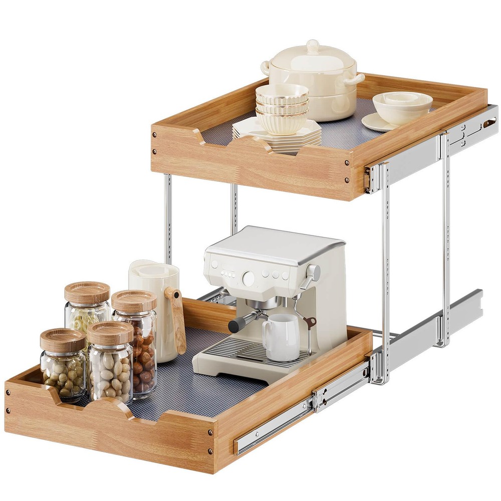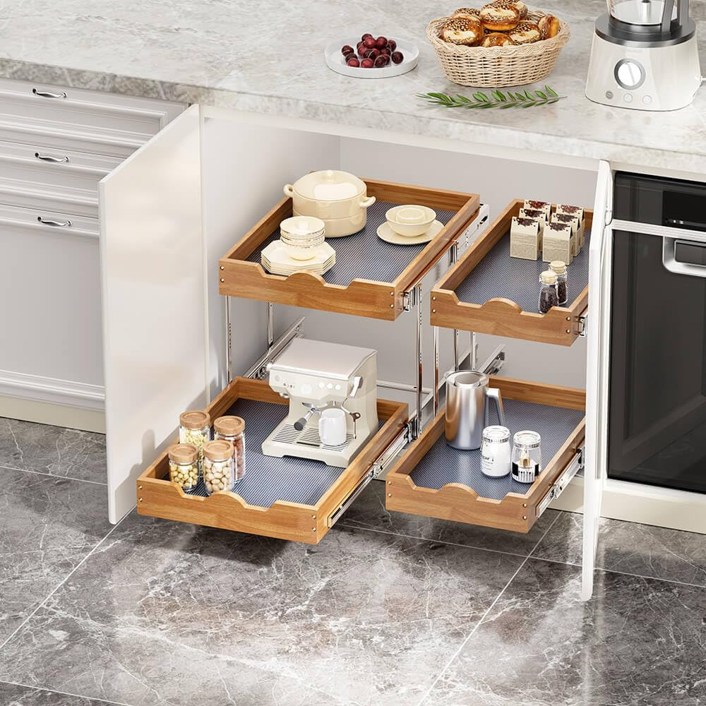 2 Tier Pull Out Wood Cabinet Organizer: Organizing your cabinet space just got easier with the 2-tier pull-out sliding shelf. Now you can make the most of cabinet space and easily access all your pots, pans, small kitchen appliances, cleaning products, canned goods, and other items. The Size of Cabinet Pull Out Shelves:20"W x 21"D x 15"H. This 2 tier slide out wood cabinet organizer needs at least 21 inch wide and larger net cabinet openings. Min cabinet interior depth: 22.5 inch. Easy to Install: Comes with step by step installation manual and all the hardware necessary for a quick, easy install. Both upper and lower Wood Drawer fully slide out independently on precision ball bearing slides so you can reach to your items easily and more quickly. Excellent Design: The upper and lower Wood Drawer has 2 height adjustment options, and the installation compatibility in the cabinet is better. When installing the lower Wood Drawer, there are two heights to choose from, Which can easily solve the problem that the lower Wood Drawer cannot be pulled out due to the lip of the cabinet. PREMIUM SERVICE: Please choose the right size before you purchase. For our customers, this pull out shelves comes with Lifelong Technical Support & Premium Service. If you have any issues about the pull out drawers, please contact us first, we will give you the satisfied solution as soon as possible. PLEASE NOTE: The overall width is 20" and the width of the wooden drawer is 18.4".