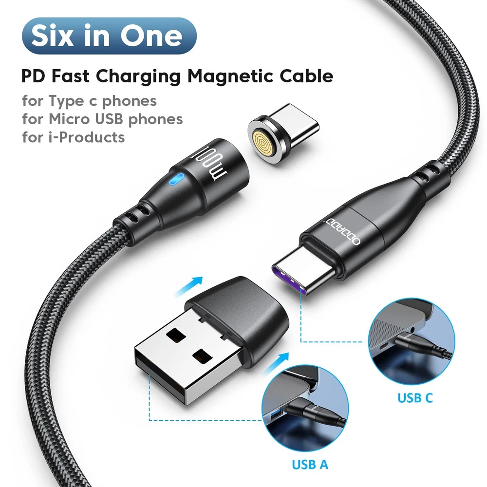 ODDADD 100W USB C Magnetic Charging Cable 2pack(3.3ft+6ft), 6 in 1 Magnetic Fast Charging Cable, Magnetic USB C Charging Cable Compatible with Micro USB, Type C and All Devices 100W Magnetic USB Cable, PD Fast Charging & Data Sync CableFeatures:3.3ft+6ft length charging cable can meet all your living and working needs at any time like home, office using or car driving. USB2.0 data transfer supported QC3.0&PD quick charge support, fast charging time saving! Bending 10000+ times lifespan and Extra Durability Blue LED light design helps you to find it easily at night. Detailed Output Parameters:USB-A to Type-C (18W)USB-A to Micro (15W)Type-C to Type-C (100W)Type-C to Micro (15W)Compatible With: USB C for LG G5/G6, Nexus 5X/6P, Samsung Galaxy S10/S9/S8, HUAWEI Mate20/P20, Pixel,Chromebook Pixel, Dell XPS 13, Razer Blade Stealth, ZenBook 3,HP Spectre notebook, Envy 13t, and More Type C Devices. Android Phones from other Manufacturers like Motorola, Huawei, Google, Blackberry, LG & HTC Most Android Tablets like the Samsung Tabs or Power Banks or Bluetooth Speakers Headphone and Any other device that charges through a micro usb cable.What is in the package: 6ft magnetic charging cable * 1 3.3ft magnetic charging cable * 1 Micro adapter* 2 Type-c adapter*2 Other adapter*2 Magnetic adapter removal*1 ⚡【100W Super Fast Charging】Experience unprecedented charging speed with the ODDADD magnetic charging cable. With its super-fast 100W PD tech, it is 3X faster than the previous 60W USB C cable. It recharge your devices up to 80% in 30 minutes. And provides data transfer speeds up to 480Mbps, it is 20x faster than most WiFi, perfect for CarPlay & Android Auto for music streaming, listening to podcasts, and powering up your GPS navigation system. ⚡【Exclusive Emark Smart Chip】Your safety is our first priority. With its exclusive Emark smart chip, this magnetic usb c charging cable can intelligently identifies the charging device and its charging power to adjust the optimal voltage and current for the fastest charging power without overloading. Additionally, the cable has a trickle mode feature that activates when the battery is fully charged, protecting its life and eliminating the need to worry about charging overnight. ⚡【Strong Magnetic Connector】 Featuring a strong magnetic connector with a 9-pin design, this usb c magnetic charging cable is more magnetic than the old-generation 1-pin and 5-pin connectors, making it not easy to drop. If you need extra tips for this magnetic charging cable, please choose the 9 Pin tips in the ODDADD store. Our 9 pin magnetic tips is compatible with all 9 pin magnetic charging cable on the market. ⚡【360° Rotation & LED Light Design】The magnetic phone charger head can rotate 360°, making it easy to connect with one hand while driving or doing other things. The LED light is designed to help you find your phone more easily in the dark. This magnetic charging cable is the best choice for drivers, vision-impaired individuals, children, seniors, and handicapped persons. ⚡【What's in the Box?】 2 × magnetic charging cord ( 3.3+6ft), 2 × magnetic Micro USB tips, 2 × magnetic Type-C tips, 2 magnetic iProduct tips, 1× USB A head, 1×manual . Each magnetic charging cable is manually tested to ensure that it works perfectly. If you have any quality or compatibility questions, please contact us first. Please note that the ODDADD 9 PIN magnetic cable is only compatible with 9 PIN magnetic tips. Shipping from the USA All of our products are shipped from the USA, ensuring quick delivery to your destination. Payment We offer the following payment methods: PayPal, credit card, bank transfer, and eBay's secure payment system. Free Shipping & Free Returns Shipping within the USA is FREE. Additionally, any return is absolutely free for you. Risk-Free Purchase You have the option to return an item within 30 days without any justification. We cover the return shipping costs! Fast Shipping We ship immediately upon receipt of payment. Generally, the package is delivered within 2-3 days in the USA. If it takes longer, we will contact you. Quality and Costs Made in Europe, USA, China No customs fees or additional charges Total satisfaction guarantee Invoice with declared VAT available upon request in .pdf format Feedback Your feedback is very important to us. After you pay for your purchase, you will automatically receive positive feedback from us.