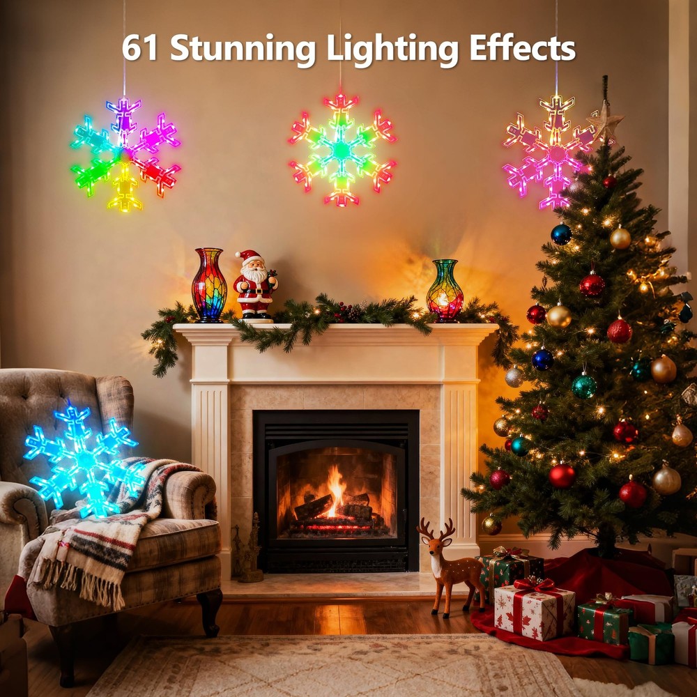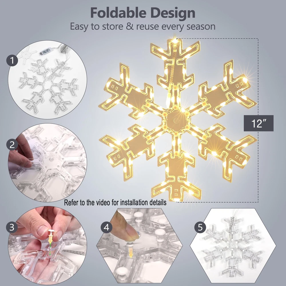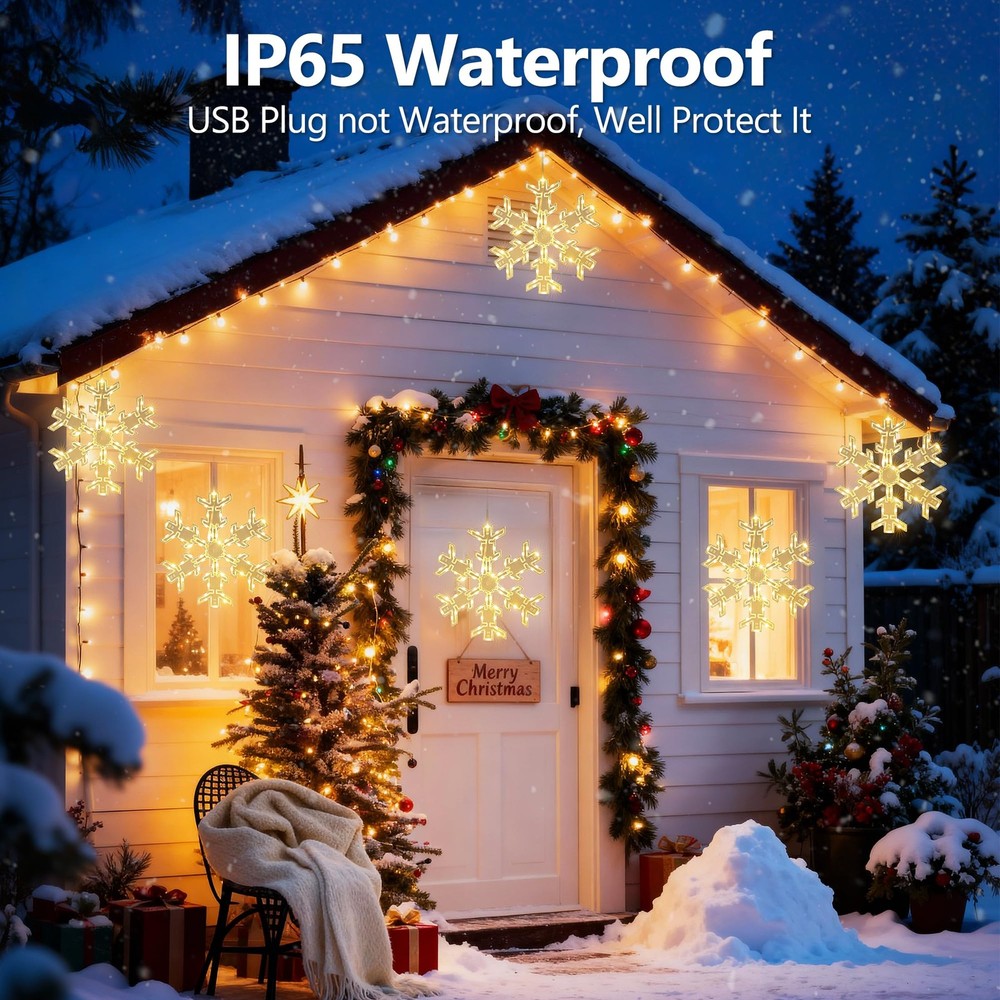 Product Features: Create a festive holiday atmosphere with the ODEETRONIC 12" Snowflake Christmas Lights. Designed with 17 single colors and 61 RGB lighting effects, these hanging snowflake lights bring sparkling magic to Christmas, parties, weddings, and everyday décor. Control everything with the remote—adjust brightness, speed, or set the timer for hassle-free use. The USB-powered design makes setup simple and energy efficient, while the IP65 waterproof snowflake body ensures year-round durability indoors or outdoors. Unlike ordinary Christmas lights, this snowflake is foldable and reusable, making storage and yearly setup effortless. Hang it on windows, porches, patios, trees, gardens, or party venues to spread warmth, cheer, and holiday vibes. Perfect Christmas snowflake light decoration for indoor and outdoor celebrations—add sparkle to every holiday season! Installation Tips for Snowflake Window Lights: ● Keep All Snowflakes Facing the Same Direction Make sure every snowflake has the wire side facing down. This prevents them from flipping or twisting as you spread them out during setup. ● Position the Center Piece Correctly Lay the plastic center piece on the flat side of each snowflake, not on the side with exposed wires. If the wires press against the center piece, the bolts may become too short to secure properly. ● Assemble in the Correct Order Do not insert the plastic bolt into the center piece first. The bolt ends expand slightly, which can prevent it from fitting through the snowflake holes afterward. ● Insert Through Both Parts Together Align the center piece and snowflake holes and press the bolt through both layers at once from the flat side. This ensures a clean, secure fit. ● Re-adjust if Needed If the bolt is inserted incorrectly, gently remove it, press the expanded end back together, and reinsert it straight through both the center piece and the snowflake. Specifications: ● Product Size: 12" (30cm) Foldable Snowflake Design ● Light Source: LED ● Colors & Modes: 17 Single Colors + 61 Dynamic Lighting Effects ● Lead Cable Length: 9.8 ft / 3m ● Power Supply: USB Powered ● Control Options: Remote Control & Button Control ● Timer Settings: 4H ON/20H OFF; 6H ON/18H OFF ● Waterproof Rating: Snowflake Body: IP65; USB Plug: IP20 (not waterproof, keep protected) ● Usage Scenarios: Indoor & Outdoor Holiday Decorations (Christmas, Halloween, Parties, Weddings, Home Décor) ● Special Features: Foldable, Reusable, Energy-Efficient, Easy to Assemble & Store Package Included: ● 2 × RGB Color Changing Snowflake Lights (12" Each) ● 2 × Fixed Buckles (Attached on Lead Cable for Stability) ● 2 × Adhesive Paste Hooks (Easy Hanging Installation) ● 2 × Bag of Assembly Accessories ● 2 × Remote Control with Battery ● 1 × User Manual (Step-by-Step Instructions) Festive Snowflake Christmas Lights: Create a warm and joyful holiday atmosphere with this 12" hanging snowflake lights. Featuring 17 color options and 61 lighting modes, it brings an elegant sparkle to windows, porches, patios, or Christmas trees, adding magic to every festive moment. RGB Color Changing & 61 Dynamic Effects: Select from warm white, cool white, or multicolor lighting to suit any occasion. With 61 dynamic effects including chasing, fading, and twinkle, these window lights enhance your Christmas decorations with a vibrant, colorful glow that brightens any space. Remote Control with Timer & Memory: Easily adjust brightness, color, and speed using the remote control. Built-in 4H/6H timer and memory function automatically restore your previous settings, keeping your favorite holiday lighting consistent and effortless every evening. USB Powered & Foldable Design: Safe and energy-efficient USB power offers flexible and convenient use—simply plug into a power bank, USB hub, or computer without being limited to wall outlets. The foldable snowflake design allows quick assembly and compact storage, making the window silhouette lights reusable and ideal for seasonal decoration year after year. Note: For detailed installation steps, please refer to the instruction video. Waterproof for Indoor & Outdoor Decor: Built with IP65 waterproof protection, these LED snowflake lights perform reliably in rain or snow. Perfect for windows, patios, balconies, and Christmas displays. (Note: USB plug is not waterproof; please keep it protected.)