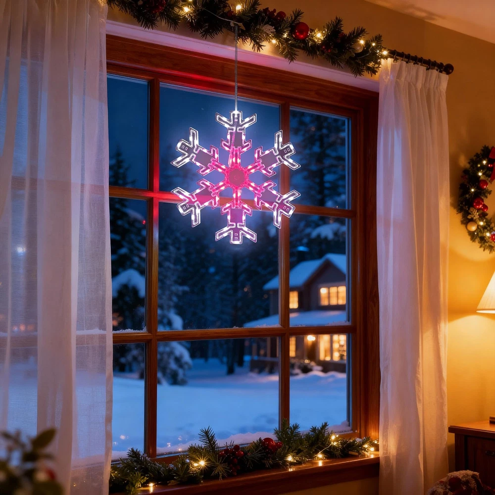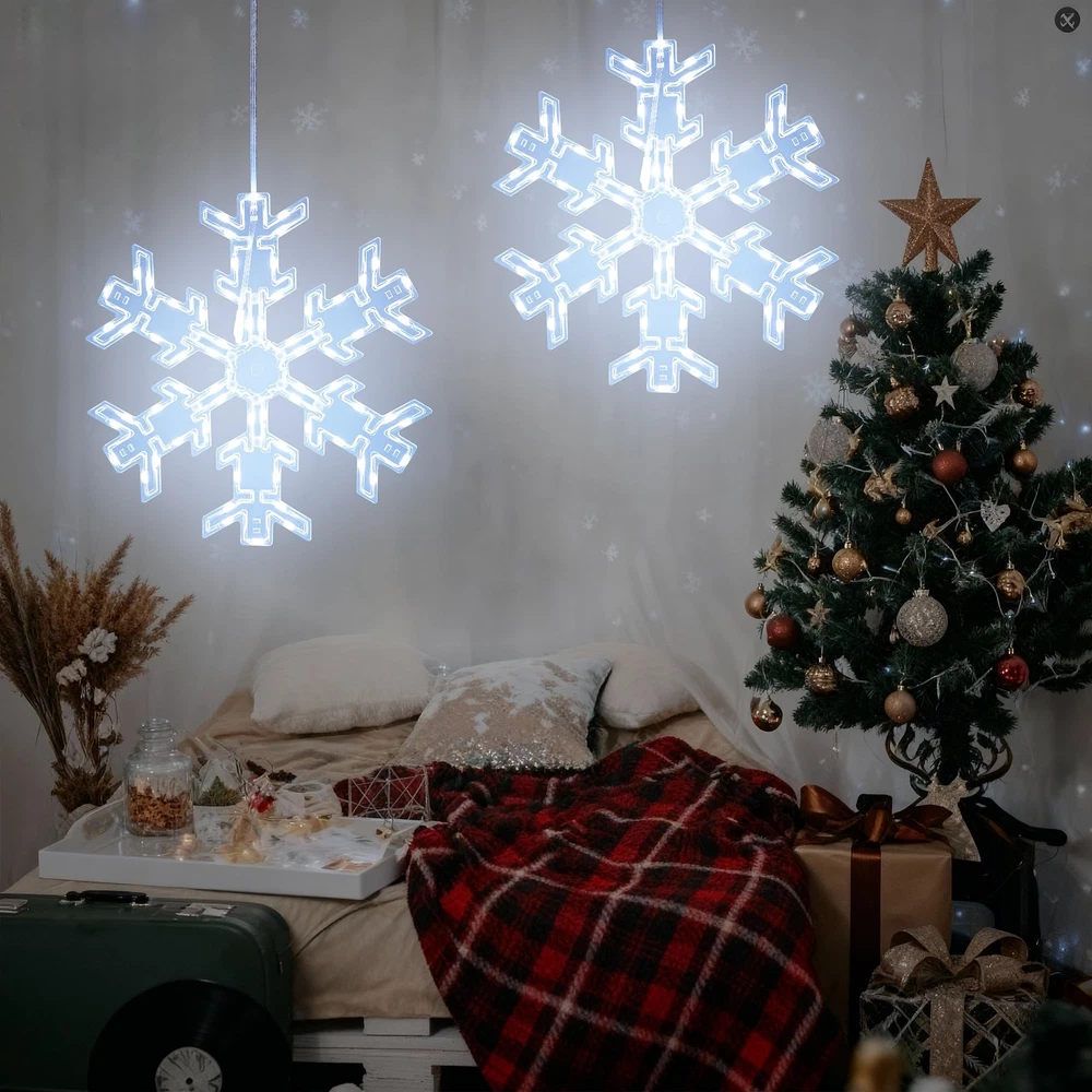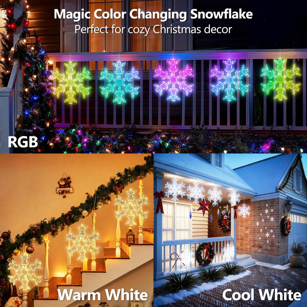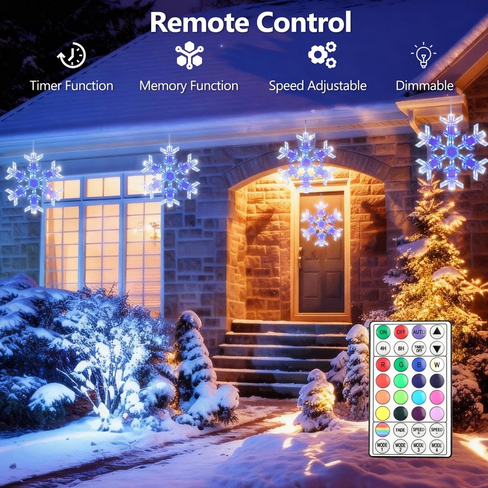 Product Features: Create a festive holiday atmosphere with the ODEETRONIC 12" Snowflake Christmas Lights. Designed with 17 single colors and 61 RGB lighting effects, these hanging snowflake lights bring sparkling magic to Christmas, parties, weddings, and everyday décor. Control everything with the remote—adjust brightness, speed, or set the timer for hassle-free use. The USB-powered design makes setup simple and energy efficient, while the IP65 waterproof snowflake body ensures year-round durability indoors or outdoors. Unlike ordinary Christmas lights, this snowflake is foldable and reusable, making storage and yearly setup effortless. Hang it on windows, porches, patios, trees, gardens, or party venues to spread warmth, cheer, and holiday vibes. Perfect Christmas snowflake light decoration for indoor and outdoor celebrations—add sparkle to every holiday season! Installation Tips for Snowflake Window Lights: ● Keep All Snowflakes Facing the Same Direction Make sure every snowflake has the wire side facing down. This prevents them from flipping or twisting as you spread them out during setup. ● Position the Center Piece Correctly Lay the plastic center piece on the flat side of each snowflake, not on the side with exposed wires. If the wires press against the center piece, the bolts may become too short to secure properly. ● Assemble in the Correct Order Do not insert the plastic bolt into the center piece first. The bolt ends expand slightly, which can prevent it from fitting through the snowflake holes afterward. ● Insert Through Both Parts Together Align the center piece and snowflake holes and press the bolt through both layers at once from the flat side. This ensures a clean, secure fit. ● Re-adjust if Needed If the bolt is inserted incorrectly, gently remove it, press the expanded end back together, and reinsert it straight through both the center piece and the snowflake. Specifications: ● Product Size: 12" (30cm) Foldable Snowflake Design ● Light Source: LED ● Colors & Modes: 17 Single Colors + 61 Dynamic Lighting Effects ● Lead Cable Length: 9.8 ft / 3m ● Power Supply: USB Powered ● Control Options: Remote Control & Button Control ● Timer Settings: 4H ON/20H OFF; 6H ON/18H OFF ● Waterproof Rating: Snowflake Body: IP65; USB Plug: IP20 (not waterproof, keep protected) ● Usage Scenarios: Indoor & Outdoor Holiday Decorations (Christmas, Halloween, Parties, Weddings, Home Décor) ● Special Features: Foldable, Reusable, Energy-Efficient, Easy to Assemble & Store Package Included: ● 2 × RGB Color Changing Snowflake Lights (12" Each) ● 2 × Fixed Buckles (Attached on Lead Cable for Stability) ● 2 × Adhesive Paste Hooks (Easy Hanging Installation) ● 2 × Bag of Assembly Accessories ● 2 × Remote Control with Battery ● 1 × User Manual (Step-by-Step Instructions) Festive Snowflake Christmas Lights: Create a warm and joyful holiday atmosphere with this 12" hanging snowflake lights. Featuring 17 color options and 61 lighting modes, it brings an elegant sparkle to windows, porches, patios, or Christmas trees, adding magic to every festive moment. RGB Color Changing & 61 Dynamic Effects: Select from warm white, cool white, or multicolor lighting to suit any occasion. With 61 dynamic effects including chasing, fading, and twinkle, these window lights enhance your Christmas decorations with a vibrant, colorful glow that brightens any space. Remote Control with Timer & Memory: Easily adjust brightness, color, and speed using the remote control. Built-in 4H/6H timer and memory function automatically restore your previous settings, keeping your favorite holiday lighting consistent and effortless every evening. USB Powered & Foldable Design: Safe and energy-efficient USB power offers flexible and convenient use—simply plug into a power bank, USB hub, or computer without being limited to wall outlets. The foldable snowflake design allows quick assembly and compact storage, making the window silhouette lights reusable and ideal for seasonal decoration year after year. Note: For detailed installation steps, please refer to the instruction video. Waterproof for Indoor & Outdoor Decor: Built with IP65 waterproof protection, these LED snowflake lights perform reliably in rain or snow. Perfect for windows, patios, balconies, and Christmas displays. (Note: USB plug is not waterproof; please keep it protected.)