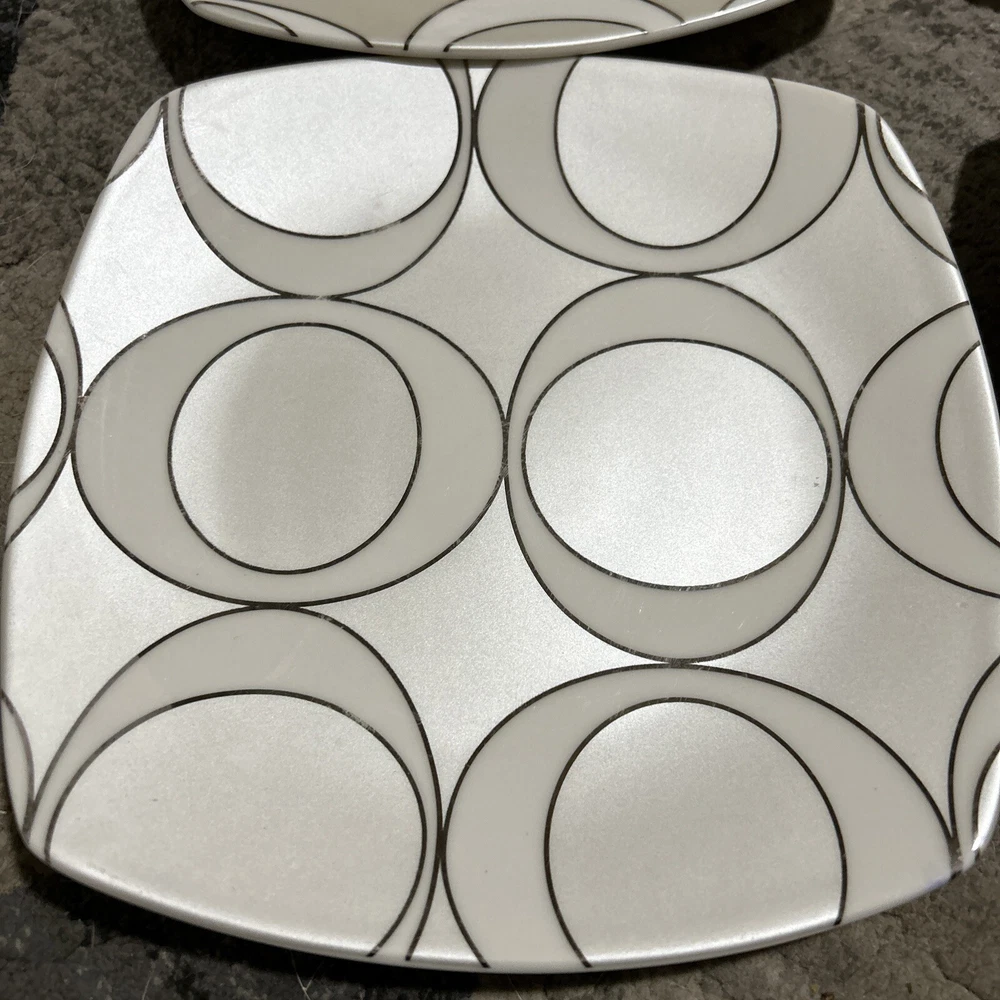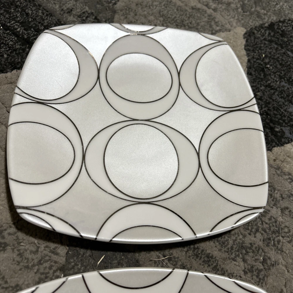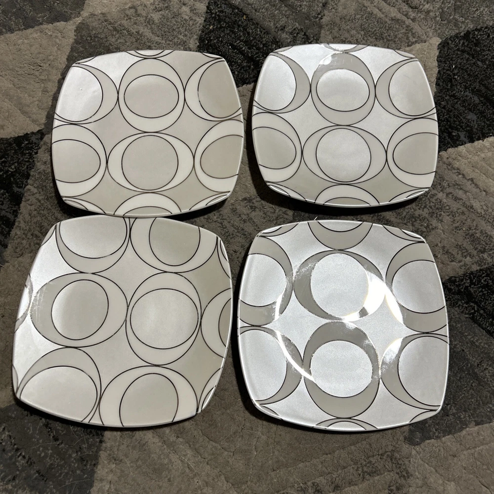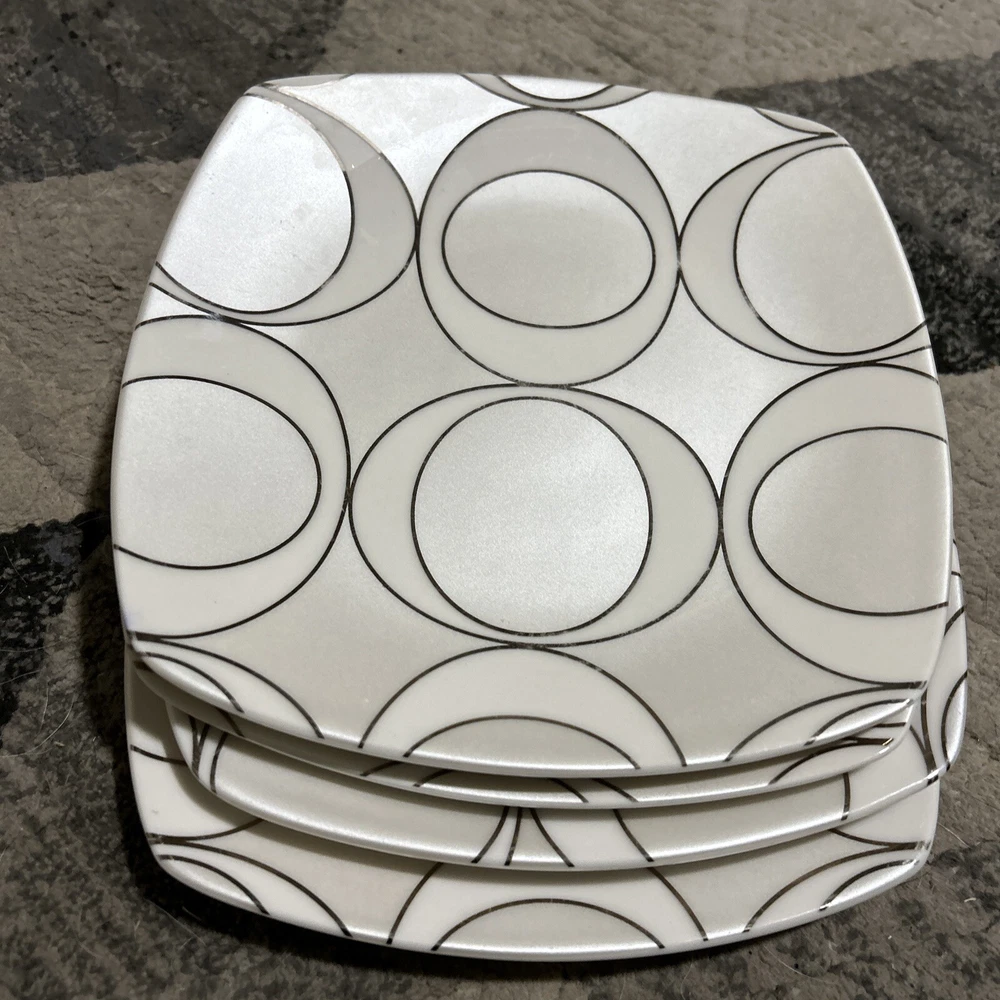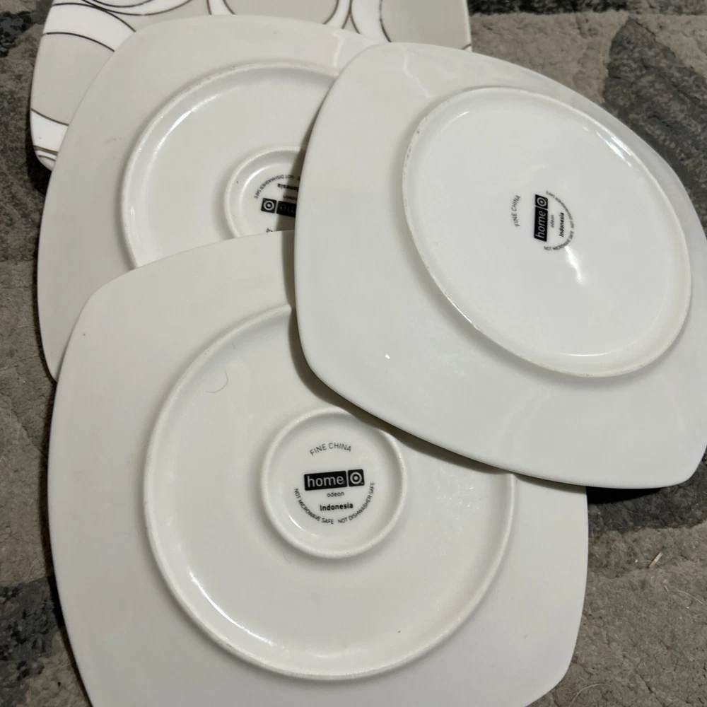 Enhance your dining experience with this set of four fine china salad plates from hOme. The glossy white plates feature an art deco style with a square shape, perfect for all occasions. Measuring 8 inches in length and width, these plates are ideal for serving salads, bread, and soup. Crafted from high-quality porcelain, these plates are durable and easy to clean with hand wash only care instructions. The set includes four plates with a backstamp printed on each. The Odeon White Platinum product line is an original from China with a production technique of pottery. These plates are a great addition to your collection and are perfect for any occasion. Minor wear.