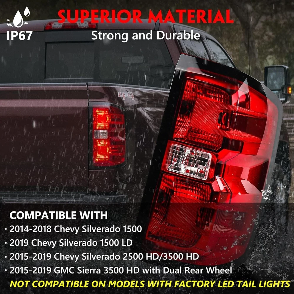 OE Style Tail Light Assembly for 2014-2018 Chevy Silverado Sierra Passenger Side Product Description: Upgrade Your Vehicle with a Premium Tail Light Assembly Enhance the look and functionality of your 2014-2018 Chevy Silverado 1500, 2500HD, 3500HD, or GMC Sierra 3500HD with this high-quality tail light assembly. Designed with precision, this OE style rear brake lamp assembly ensures a perfect fit and optimal performance. Key Features: OE Style Replacement : Designed to match the original equipment for a seamless fit. Passenger Side Fitment : Specifically for the right side of the vehicle. Sleek Black Trim : Adds a modern touch to your vehicle's appearance. Durable Construction : Made from high-quality materials for long-lasting use. Easy Installation : Direct fit replacement with no modifications required. Enhanced Visibility : Provides bright and clear lighting for safety and style. Product Information: Compatibility : Fits 2014-2018 Chevy Silverado 1500, 2500HD, 3500HD, and GMC Sierra 3500HD. Design : OE style with black trim for an updated look. Installation : Direct replacement for a hassle-free installation process. FAQs: Will this tail light assembly fit my 2014 Chevy Silverado 1500? Yes, this tail light assembly is compatible with 2014-2018 Chevy Silverado 1500 models. Is this tail light assembly for the driver’s side or passenger’s side? This assembly is designed for the passenger side of the vehicle. Does this tail light include bulbs? No, the tail light assembly does not include bulbs; you will need to transfer the existing bulbs from your old assembly. Can I install this tail light assembly myself? Yes, the installation is straightforward and can be done with basic tools. What material is the tail light assembly made from? The tail light assembly is constructed from high-quality plastic for durability and long-term use. Does this tail light assembly come with a warranty? Please check with the seller for specific warranty details as they may vary. How do I know if this tail light assembly will match my vehicle? Ensure that your vehicle is a 2014-2018 Chevy Silverado 1500, 2500HD, 3500HD, or GMC Sierra 3500HD and that you are selecting the passenger side assembly. Will this tail light assembly improve my vehicle’s visibility? Yes, it provides bright and clear lighting to enhance visibility and safety. What is the process for returning this tail light assembly if it doesn't fit? Return policies vary; please consult the seller’s return policy for specific instructions. Can I use aftermarket bulbs with this tail light assembly? Yes, aftermarket bulbs can be used as long as they are compatible with the assembly. Item model number CVSD0019 Style 14-18RH(Passenger Side) Light Source Type LED Auto Part Position Rear Assembly Required Yes Color Black Model tail light PRODUCT DIMENSIONS : 12.52 inches x 16.81 inches x 6.22 inches. Weight: 3.47 lb