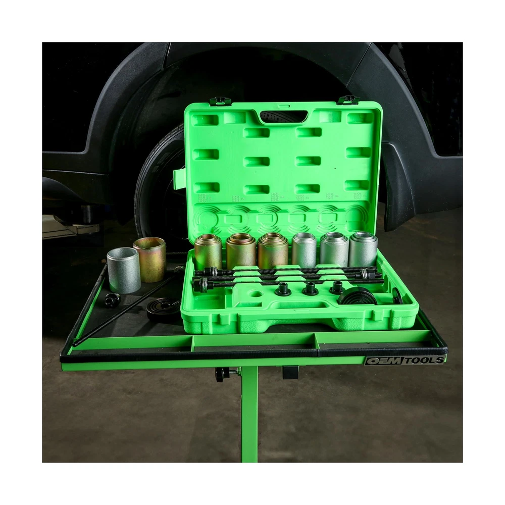 OEMTOOLS 27212 Manual Bushing Removal Tool Set, Suspension and Wheel Bearing Service Kit, 20 Cups and Adapters for Bushing, Seal, and Bearing Replacement, Control Arm and Axle Repair Description The OEMTOOLS 27212 Manual Bushing Installation and Removal Tool Set is a versatile solution for mechanics tackling a variety of automotive tasks. This comprehensive bushing driver set includes 20 cups and adapters, making it ideal for precise bushing, seal, and bearing replacement. Whether you need a wheel bearing press, a control arm bushing removal tool, or a seal installer kit, this set offers the flexibility and precision you require. Designed to prevent damage to vehicle components, this kit features heavy-duty construction with 5 mm thick sleeves and ACME-threaded forcing rods. It’s perfect for both light and heavy-duty jobs, including leaf spring bushing press tasks and transmission bushing driver applications. The kit’s plates and sleeves also work seamlessly with a shop press, expanding its usability to more demanding jobs. This bearing race driver set, bearing installer kit, and wheel seal installer in one package ensures professional results for every job. Optimize your repairs with the OEMTOOLS 27212, a must-have for any automotive workshop focused on precision and durability. Features: Versatile Bushing Press Kit: Includes 20 cups and adapters, providing hundreds of combinations for precise bushing, seal, and bearing replacement tasks, ideal for suspension and wheel bearing maintenance. Works seamlessly as a control arm bushing tool. Comprehensive Bearing Service: This bearing press kit is designed for fast and safe removal and installation of bearings, seals, and bushings, reducing the risk of damage to components. Perfect for use as a bearing race and seal driver set. Heavy Duty Construction: Built with a 5 mm thick sleeve wall and ACME-threaded forcing rods, this bearing driver set ensures durability and stability for both light and heavy-duty jobs, making it an essential bearing press tool. Adaptable Workshop Press Use: The kit's plates and sleeves can be used with a standard shop press, expanding its versatility beyond on-site repairs. An ideal axle seal installation tool and hydraulic press accessory kit. Precision for Professional Results: Designed to handle a wide range of tasks, from control arm bushing removal to seal installation, this bushing press and pull kit is essential for mechanics aiming for precise, damage-free repairs. Product Details: Manufacturer: ‎OEMTOOLS Brand: ‎OEMTOOLS Model: ‎27212 Item Weight: ‎42.2 pounds Product Dimensions: ‎19.6 x 4.8 x 14.9 inches Item model number: ‎27212 Is Discontinued By Manufacturer: ‎No Manufacturer Part Number: ‎27212 OEM Part Number: ‎27212 Date First Available: January 23, 2017 Delivery We Do Not Ship Outside of the Continental US. Return Policy All items qualify for returns within 30 days of receipt. Buyer is responsible for return shipping on any item that is not damaged. Feedback We take our reputation seriously, we buy and sell online, so we understand the value of trust. If you are unsatisfied with your order, please contact us and we will work with you to resolve it to your satisfaction.